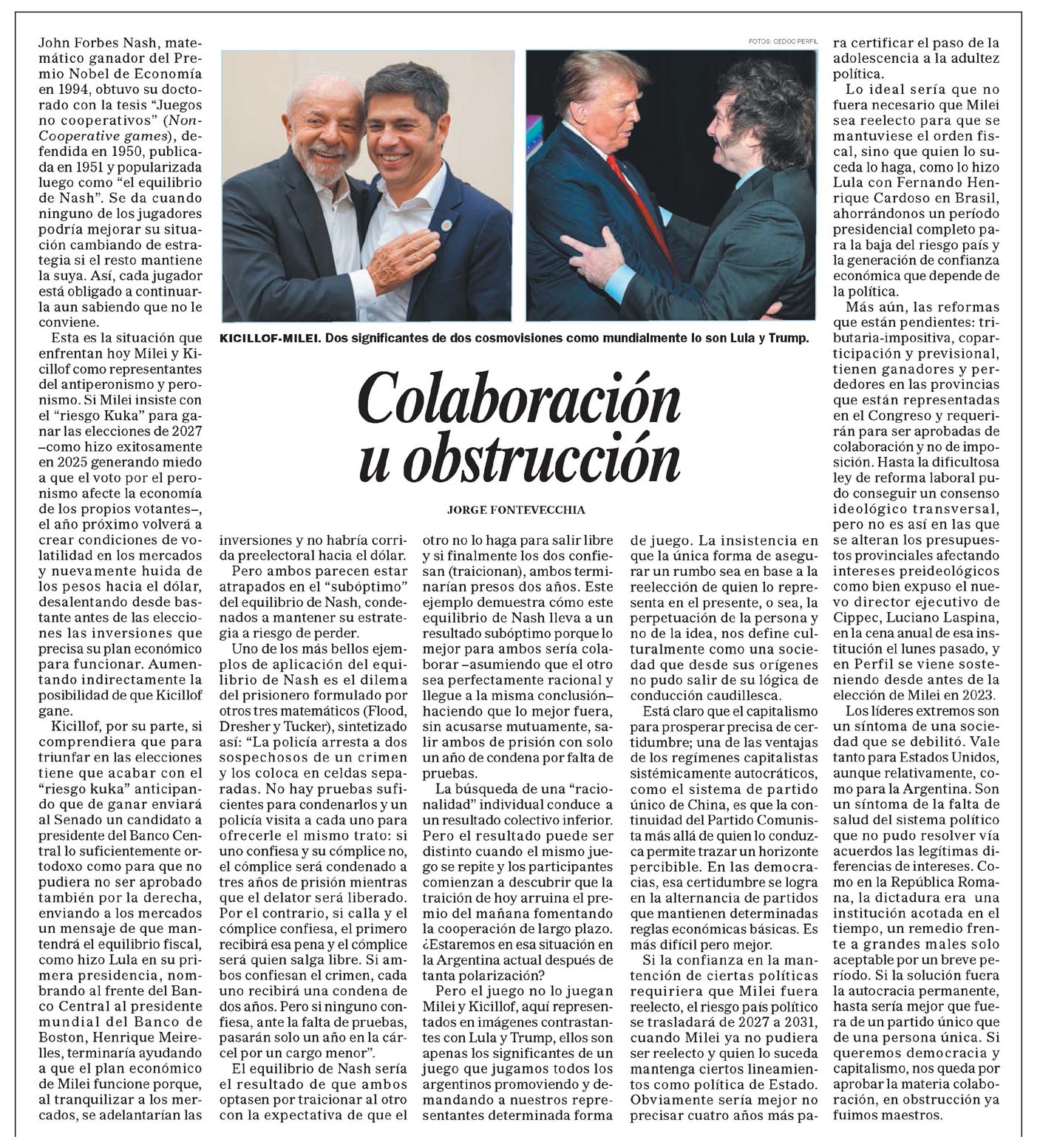 Colaboración u obstrucción JORGE FONTEVECCHIA John Forbes Nash, matemático ganador del Premio Nobel de Economía en 1994, obtuvo su doctorado con la tesis "Juegos no cooperativos" (Non-Cooperative games), defendida en 1950, publicada en 1951 y popularizada luego como "el equilibrio de Nash". Se da cuando ninguno de los jugadores podría mejorar su situación cambiando de estrategia si el resto mantiene la suya. Así, cada jugador está obligado a continuarla aun sabiendo que no le conviene. Esta es la situación que enfrentan hoy Milei y Kicillof como representantes del antiperonismo y peronismo. Si Milei insiste con el "riesgo Kuka" para ganar las elecciones de 2027 -como hizo exitosamente en 2025 generando miedo a que el voto por el peronismo afecte la economía de los propios votantes-, el año próximo volverá a crear condiciones de volatilidad en los mercados y nuevamente huida de los pesos hacia el dólar, desalentando desde bastante antes de las elecciones las inversiones que precisa su plan económico para funcionar. Aumentando indirectamente la posibilidad de que Kicillof gane. Kicillof, por su parte, si comprendiera que para triunfar en las elecciones tiene que acabar con el "riesgo kuka" anticipando que de ganar enviará al Senado un candidato a presidente del Banco Central lo suficientemente ortodoxo como para que no pudiera no ser aprobado también por la derecha, enviando a los mercados un mensaje de que mantendrá el equilibrio fiscal, como hizo Lula en su primera presidencia, nombrando al frente del Banco Central al presidente mundial del Banco de Boston, Henrique Meirelles, terminaría ayudando a que el plan económico de Milei funcione porque, al tranquilizar a los mercados, se adelantarían las inversiones y no habría corrida preelectoral hacia el dólar. Pero ambos parecen estar atrapados en el "subóptimo" del equilibrio de Nash, condenados a mantener su estrategia a riesgo de perder. Uno de los más bellos ejemplos de aplicación del equilibrio de Nash es el dilema del prisionero formulado por otros tres matemáticos (Flood, Dresher y Tucker), sintetizado así: "La policía arresta a dos sospechosos de un crimen y los coloca en celdas separadas. No hay pruebas suficientes para condenarlos y la policía visita a cada uno para ofrecerle el mismo trato: si no confiesa y su cómplice no, el cómplice será condenado a tres años de prisión mientras que el delator será liberado. Por el contrario, si calla y el cómplice confiesa, el primero recibirá esa pena y el cómplice será quien salga libre. Si ambos confiesan el crimen, cada uno recibirá una condena de dos años. Pero si ninguno confiesa, ante la falta de pruebas, pasarán solo un año en la cárcel por un cargo menor". El equilibrio de Nash sería el resultado de que ambos optasen por traicionar al otro con la expectativa de que el otro no lo haga para salir libre y si finalmente los dos confiesan (traicionan), ambos terminarían presos dos años. Este ejemplo demuestra cómo este equilibrio de Nash lleva a un resultado subóptimo porque lo mejor para ambos sería colaborar -asumiendo que el otro sea perfectamente racional y llegue a la misma conclusión- haciendo que lo mejor fuera, sin acusarse mutuamente, salir ambos de prisión con solo un año de condena por falta de pruebas. La búsqueda de una "racionalidad" individual conduce a un resultado colectivo inferior. Pero el resultado puede ser distinto cuando el mismo juego se repite y los participantes comienzan a descubrir que la traición de hoy arruina el premio del mañana fomentando la cooperación de largo plazo. ¿Estaremos en esa situación de polarización? Pero el juego no lo juegan Milei y Kicillof, aquí representados en imágenes contrastantes con Lula y Trump, ellos son apenas los significantes de un juego que jugamos todos los argentinos promoviendo y demandando a nuestros representantes determinada forma de juego. La insistencia en que la única forma de asegurar un rumbo sea en base a la reelección de quien lo representa en el presente, o sea, la perpetuación de la persona o de la idea, nos define culturalmente como una sociedad que desde sus orígenes no pudo salir de su lógica de conducción caudillesca. Está claro que el capitalismo para prosperar precisa de certidumbre; una de las ventajas de los regímenes capitalistas sistémicamente autocráticos, como el sistema de partido único de China, es que la continuidad del Partido Comunista más allá de quien lo conduzca permite trazar un horizonte percibible. En las democracias, esa certidumbre se logra en la alternancia de partidos que mantienen determinadas reglas económicas básicas. Es más difícil pero mejor. Si la confianza en la mantención de ciertas políticas requiriera que Milei fuera reelecto, el riesgo país político se trasladará de 2027 a 2031, cuando Milei ya no pudiera ser reelecto y quien lo suceda mantenga ciertos lineamientos como política de Estado. Obviamente sería mejor no precisar cuatro años más para certificar el paso de la adolescencia a la adultez política. Lo ideal sería que no fuera necesario que Milei sea reelecto para que se mantuviese el orden fiscal, sino que quien lo suceda lo haga, como lo hizo Lula con Fernando Henrique Cardoso en Brasil, ahorrándonos un período presidencial completo para la baja del riesgo país y la generación de confianza económica que depende de la política. Más aún, las reformas que están pendientes: tributaria-impositiva, coparticipación y previsional, tienen ganadores y perdedores en las provincias que están representadas en el Congreso y requerirán para ser aprobadas de colaboración y no de imposición. Hasta la dificultosa ley de reforma laboral pudo conseguir un consenso ideológico transversal, pero no es así en las que se alteran los presupuestos provinciales afectando intereses preideológicos como bien expuso el nuevo director ejecutivo de Cippec, Luciano Laspina, en la cena anual de esa i