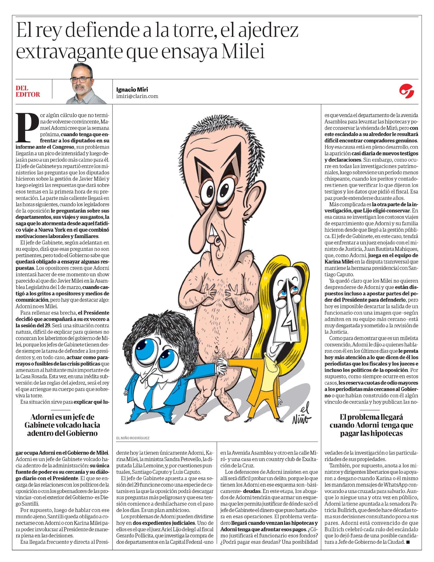 El rey defiende a la torre, el ajedrez extravagante que ensaya Milei Ignacio Miri Por algún cálculo que no termina de volverse convincente, Manuel Adorni cree que la semana próxima, cuando tenga que enfrentar a los diputados en su informe ante el Congreso, sus problemas llegarán a un pico de intensidad y luego dejarán paso a un período más calmo para él. El jefe de Gabinete ya repartió entre los ministerios las preguntas que los diputados hicieron sobre la gestión de Javier Milei y luego elegirá las respuestas que dará sobre esos temas en la primera hora de su presentación. La parte más caliente llegará en las horas siguientes, cuando los legisladores de la oposición le preguntarán sobre sus departamentos, sus viajes y sus gastos, la saga que lo atormenta desde aquel fatídico viaje a Nueva York en el que combinó motivaciones laborales y familiares. El jefe de Gabinete, según adelantan en su equipo, dirá que esas preguntas no son pertinentes, pero todo el Gobierno sabe que quedará obligado a ensayar algunas respuestas. Los opositores creen que Adorni intentará hacer de ese momento un show parecido al que dio Javier Milei en la Asamblea Legislativa del 1 de marzo, cuando castigó a los gritos a opositores y medios de comunicación, pero hay que destacar algo: Adorni no es Milei. Para rellenar esa brecha, el Presidente decidió que acompañará a su ex vocero a la sesión del 29. Será una situación contra natura, difícil de explicar para quienes no conozcan los laberintos del gobierno de Milei, porque los jefes de Gabinete tienen desde siempre la tarea de defender a los presidentes y, en todo caso, actuar como pararrayos o fusibles de las crisis políticas que amenazan al habitante más importante de la Casa Rosada. Esta vez, en una inédita subversión de las reglas del ajedrez, será el rey el que arriesgue su cuerpo para que sobreviva la torre. Esa situación sirve para explicar qué lugar ocupa Adorni en el Gobierno de Milei. Adorni es un jefe de Gabinete volcado hacia adentro de la administración: su única fuente de poder es su cercanía y su diálogo diario con el Presidente. El que se encarga de las relaciones con los políticos de la oposición o con los gobernadores de las provincias -con el exterior del Gobierno- es Diego Santilli. Por supuesto, luego de hablar con ese mundo ajeno, Santilli queda obligado a conectarse con Adorni o con Karina Milei para poder involucrar al Presidente de manera plena en las decisiones. Esa llegada frecuente y directa al Presidente hoy la tienen únicamente Adorni, Karina Milei, la ministra Sandra Petovello, la diputada Lilia Lemoine, y, por cuestiones puntuales, Santiago Caputo y Luis Caputo. El jefe de Gabinete apuesta a que esa sesión del 29 funcione como una especie de catarsis en la que la oposición podrá descargar sus preguntas más peligrosas y que esa tensión comience a deshilacharse con el paso de los días. Es un plan ambicioso. Los problemas de Adorni pueden dividirse hoy en dos expedientes judiciales. Uno de ellos es el que el juez Ariel Lijo delegó al fiscal Gerardo Pollicita, que investiga la compra de dos departamentos en la Capital Federal -uno en la Avenida Asamblea y otro en la calle Miró- y una casa en un country club de Exaltación de la Cruz. Los defensores de Adorni insisten en que allí será difícil probar un delito, porque lo que tienen los Adorni en ese esquema son -básicamente- deudas. En este etapa, los abogados de Adorni tendrán que armar un esquema que les permita justificar de dónde sacó el jefe de Gabinete el dinero que puso hasta ahora en esas operaciones. El problema verdadero llegará cuando venzan las hipotecas y Adorni tenga que afrontar esos pagos. ¿Cómo justificará el funcionario esos fondos? ¿Podrá pagar esas deudas? Una posibilidad es que venda el departamento de la avenida Asamblea para levantar las hipotecas y poder conservar la vivienda de Miró, pero con este escándalo a su alrededor le resultará difícil encontrar compradores genuinos. Hoy esa causa está en pleno desarrollo, con la aparición casi diaria de nuevos testigos y declaraciones. Sin embargo, como ocurre en todas las investigaciones patrimoniales, luego sobreviene un período menos chispeante, cuando los peritos y contadores tienen que verificar lo que dijeron los testigos y los datos que pidió el fiscal. Esa paz puede extenderse durante años. Más complicada es la otra parte de la investigación, que Lijo eligió conservar. En esa causa se investigan los costosos viajes de esparcimiento que Adorni y su familia hicieron desde que llegó a la gestión pública. El jefe de Gabinete, en este caso, tendrá que enfrentar a un juez enojado con el ministro de Justicia, Juan Bautista Mahiques, que, como Adorni, juega en el equipo de Karina Milei en la disputa transversal que mantiene la hermana presidencial con Santiago Caputo. Ya quedó claro que los Milei no quieren desprenderse de Adorni y que están dispuestos incluso a apostar partes del poder del Presidente para defenderlo, pero hoy es imposible descartar la salida de un funcionario con una imagen que -según admiten en su equipo más cercano- está muy desgastada y sometido a la revisión de la Justicia. Como para demostrar que es un mileísta convencido, Adorni le dijo a quienes hablaron con él en los últimos días que le presta hoy más atención a lo que dicen de él los periodistas que los fiscales y los jueces e incluso los políticos de la oposición. Por supuesto, como siempre ocurre en estos casos, les reserva cuotas de odio mayores a los periodistas más cercanos al Gobierno o que habían construido con él algún vínculo de cercanía y hoy publican las novedades de la investigación o las particularidades de sus propiedades. También, por supuesto, anota a los ministros y dirigentes libertarios que lo apoyaron a desgano cuando Karina o él mismo les mandaron mensajes de WhatsApp convocando a una cruzada para salvarlo. Aunque lo niegue 