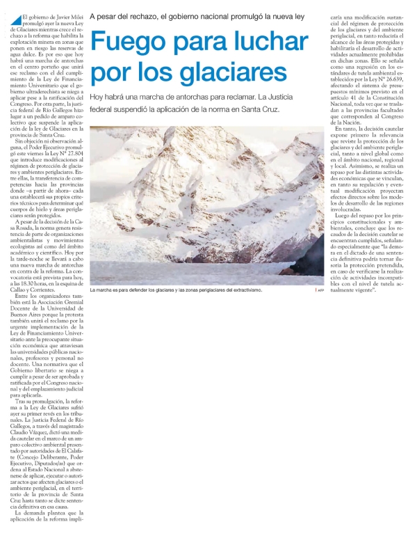 Fuego para luchar por los glaciares A pesar del rechazo, el gobierno nacional promulgó la nueva ley. Hoy habrá una marcha de antorchas para reclamar. La Justicia federal suspendió la aplicación de la norma en Santa Cruz. El gobierno de Javier Milei promulgó ayer la nueva Ley de Glaciares mientras crece el rechazo a la reforma que habilita la explotación minera en zonas que ponen en riesgo las reservas de agua dulce. Es por eso que hoy habrá una marcha de antorchas en el centro porteño que unirá ese reclamo con el del cumplimiento de la Ley de Financiamiento Universitario que el gobierno ultraderechista se niega a aplicar pese a la ratificación del Congreso. Por otra parte, la justicia federal de Río Gallegos hizo lugar a un pedido de amparo colectivo que suspende la aplicación de la ley de Glaciares en la provincia de Santa Cruz. Sin objeción ni observación alguna, el Poder Ejecutivo promulgó este viernes la Ley N° 27.804 que introduce modificaciones al régimen de protección de glaciares y ambientes periglaciares. Entre ellas, la transferencia de competencias hacia las provincias donde —a partir de ahora— cada una establecerá sus propios criterios técnicos para determinar qué cuerpos de hielo y áreas periglaciares serán protegidos. A pesar de la decisión de la Casa Rosada, la norma genera resistencia de parte de organizaciones ambientalistas y movimientos ecologistas así como del ámbito académico y científico. Hoy por la tarde-noche se llevará a cabo una nueva marcha de antorchas en contra de la reforma. La convocatoria está prevista para hoy, a las 18.30 horas, en la esquina de Callao y Corrientes. Entre los organizadores también está la Asociación Gremial Docente de la Universidad de Buenos Aires porque la protesta también unirá el reclamo por la urgente implementación de la Ley de Financiamiento Universitario ante la preocupante situación económica que atraviesan las universidades públicas nacionales, profesores y personal no docente. Una normativa que el Gobierno libertario se niega a cumplir a pesar de ser aprobada y ratificada por el Congreso nacional y del emplazamiento judicial para aplicarla. Tras su promulgación, la reforma a la Ley de Glaciares sufrió ayer su primer revés en los tribunales. La Justicia Federal de Río Gallegos, a través del magistrado Claudio Vázquez, dictó una medida cautelar en el marco de un amparo colectivo ambiental presentado por autoridades de El Calafate (Concejo Deliberante, Poder Ejecutivo, Diputados/as) que ordena al Estado Nacional a abstenerse de aplicar, ejecutar o autorizar actos que afecten glaciares o el ambiente periglacial, en el territorio de la provincia de Santa Cruz hasta tanto se dicte sentencia definitiva en esa causa. La demanda plantea que la aplicación de la reforma implicaría una modificación sustancial del régimen de protección de los glaciares y del ambiente periglacial, en tanto reduciría el alcance de las áreas protegidas y habilitaría el desarrollo de actividades actualmente prohibidas en dichas zonas. Ello se señala como una regresión en los estándares de tutela ambiental establecidos por la Ley N° 26.639, afectando el sistema de presupuestos mínimos previsto en el artículo 41 de la Constitución Nacional, toda vez que se trasladan a las provincias facultades que corresponden al Congreso de la Nación. En tanto, la decisión cautelar expone primero la relevancia que reviste la protección de los glaciares y del ambiente periglacial, tanto a nivel global como en el ámbito nacional, regional y local. Asimismo, se realiza un repaso por las distintas actividades económicas que se vinculan, en tanto su regulación y eventual modificación proyecta efectos directos sobre los modelos de desarrollo de las regiones involucradas. Luego del repaso por los principios constitucionales y ambientales, concluye que los recaudos de la decisión cautelar se encuentran cumplidos, señalando especialmente que “la demora en el dictado de una sentencia definitiva podría tornar ilusoria la protección pretendida, en caso de verificarse la realización de actividades incompatibles con el nivel de tutela actualmente vigente”. Menciones: cpol2 cnot