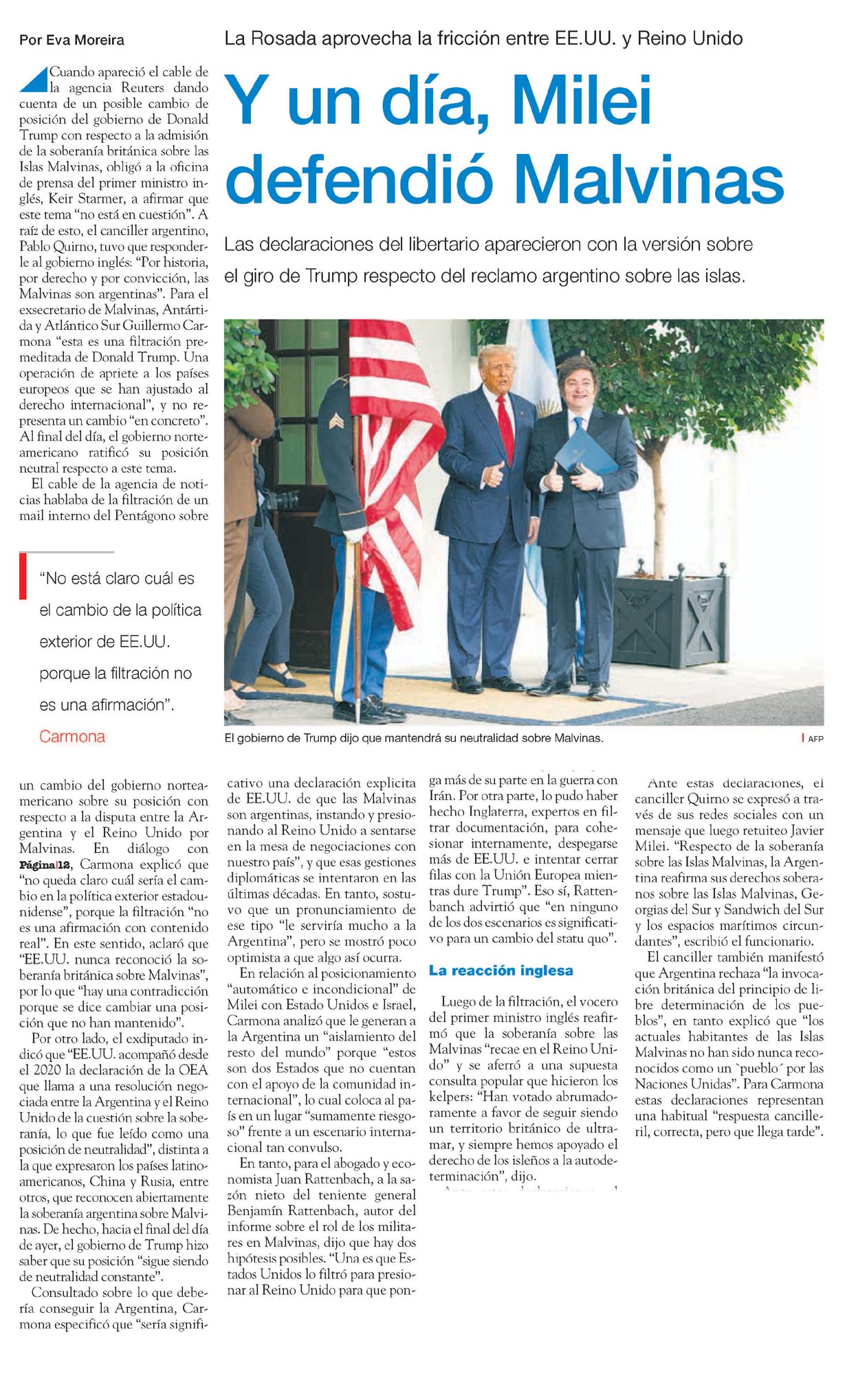 Y un día, Milei defendió Malvinas Eva Moreira Por Eva Moreira Cuando apareció el cable de la agencia Reuters dando cuenta de un posible cambio de posición del gobierno de Donald Trump con respecto a la admisión de la soberanía británica sobre las Islas Malvinas, obligó a la oficina de prensa del primer ministro inglés, Keir Starmer, a afirmar que este tema “no está en cuestión”. A raíz de esto, el canciller argentino, Pablo Quimo, tuvo que responder al gobierno inglés: “Por historia, por derecho y por convicción, las Malvinas son argentinas”. Para el exsecretario de Malvinas, Antártida y Atlántico Sur Guillermo Carmona “esta es una filtración premeditada de Donald Trump. Una operación de apriete a los países europeos que se han ajustado al derecho internacional”, y no representa un cambio “en concreto”. Al final del día, el gobierno norteamericano ratificó su posición neutral respecto a este tema. El cable de la agencia de noticias hablaba de la filtración de un mail interno del Pentágono sobre “No está claro cuál es el cambio de la política exterior de EE.UU. porque la filtración no es una afirmación”. Carmona un cambio del gobierno norteamericano sobre su posición con respecto a la disputa entre la Argentina y el Reino Unido por Malvinas. En diálogo con Página12, Carmona explicó que “no queda claro cuál sería el cambio en la política exterior estadounidense”, porque la filtración “no es una afirmación con contenido real”. En este sentido, aclaró que por lo que “hay una contradicción porque se dice cambiar una posición que no han mantenido”. Por otro lado, el exdiputado indicó que “EE.UU. acompañó desde el 2020 la declaración de la OEA que llama a una resolución negociada entre la Argentina y el Reino Unido de la cuestión sobre la soberanía, lo que fue leído como una posición de neutralidad”, distinta a que expresaron los países latinoamericanos, China y Rusia, entre otros, que reconocen abiertamente la soberanía argentina sobre Malvinas. De hecho, hacia el final del día de ayer, el gobierno de Trump hizo saber que su posición “sigue siendo de neutralidad constante”. Consultado sobre lo que debería conseguir la Argentina, Carmona especificó que “sería significativo una declaración explícita de EE.UU. de que las Malvinas son argentinas, instando y presionando al Reino Unido a sentarse en la mesa de negociaciones con nuestro país”, y que esas gestiones diplomáticas se intentaron en las últimas décadas. En tanto, sostuvo que un pronunciamiento de ese tipo “le serviría mucho a la Argentina”, pero se mostró poco optimista a que algo así ocurra. En relación al posicionamiento “automático e incondicional” de Milei con Estados Unidos e Israel, Carmona analizó que le generan a Argentina un “aislamiento del resto del mundo” porque “estos son dos Estados que no cuentan con el apoyo de la comunidad internacional”, lo cual coloca al país en un lugar “sumamente riesgoso” frente a un escenario internacional tan convulso. En tanto, para el abogado y economista Juan Rattenbach, a la sazón nieto del teniente general Benjamín Rartenbach, autor del informe sobre el rol de los militares en Malvinas, dijo que hay dos hipótesis posibles. “Una es que Estados Unidos lo filtró para presionar al Reino Unido para que ponga más de su parte en la guerra con Irán. Por otra parte, lo pudo haber hecho Inglaterra, expertos en filtrar documentación, para cohesionar internamente, despegarse más de EE.UU. e intentar cerrar filas con la Unión Europea mientras dure Trump”. Eso sí, Rattenbanch advirtió que “en ninguno de los dos escenarios es significativo para un cambio del statu quo”. La Rosada aprovecha la fricción entre EE.UU. y Reino Unido Y un día, Milei defendió Malvinas Las declaraciones del libertario aparecieron con la versión sobre el giro de Trump respecto del reclamo argentino sobre las islas. El gobierno de Trump dijo que mantendrá su neutralidad sobre Malvinas. (AFP) La reacción inglesa Luego de la filtración, el vocero del primer ministro inglés reafirmó que la soberanía sobre las Malvinas “recae en el Reino Unido” y se aferró a una supuesta consulta popular que hicieron los kelpers: “Han votado abrumadoramente a favor de seguir siendo un territorio británico de ultramar, y siempre hemos apoyado el derecho de los isleños a la autodeterminación”, dijo. Ante estas declaraciones, el canciller Quirno se expresó a través de sus redes sociales con un mensaje que luego retuiteo Javier Milei. “Respecto de la soberanía sobre las Islas Malvinas, la Argentina reafirma sus derechos soberanos sobre las Islas Malvinas, Georgias del Sur y Sandwich del Sur y los espacios marítimos circundantes”, escribió el funcionario. El canciller también manifestó que Argentina rechaza “la invocación británica del principio de libre determinación de los pueblos”, en tanto explicó que “los actuales habitantes de las Islas Malvinas no han sido nunca reconocidos como un “pueblo” por las Naciones Unidas”. Para Carmona estas declaraciones representan una habitual “respuesta cancilleril, correcta, pero que llega tarde”. Menciones: cpol2 cnot