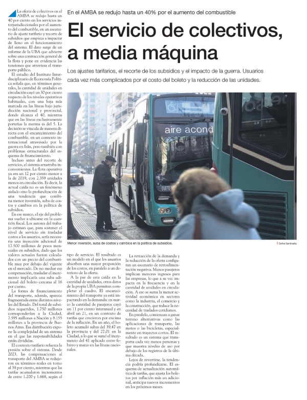 El servicio de colectivos, a media máquina Dafne Gentinetta La oferta de colectivos en el AMBA se redujo hasta un 40 por ciento en los servicios interjurisdiccionales por el aumento del combustible, en un escenario de ajuste tarifario y recorte de subsidios que empieza a impactar de lleno en el funcionamiento del sistema. El dato surge de un informe de la UBA que advierte sobre una contracción general de la flota y pone en evidencia las tensiones que atraviesa el transporte público. El estudio del Instituto Interdisciplinario de Economía Política señala que, en términos generales, la cantidad de unidades en circulación cayó un 30 por ciento respecto de los niveles operativos habituales, con una baja más marcada en las líneas bajo jurisdicción nacional y provincial, donde alcanza el 40, mientras que en las líneas exclusivamente porteñas la merma es del 5. La decisión se vincula de manera directa con el encarecimiento del combustible, en un contexto internacional atravesado por la guerra en Irán, pero también con problemas estructurales del esquema de financiamiento. Incluso antes del recorte de servicios, el sistema arrastraba inconvenientes. La flota operativa ya era un 12 por ciento menor a la de 2019, con 2.359 unidades menos en circulación. Es decir, la actual caída no es un fenómeno aislado sino la profundización de una tendencia que combina menor inversión, suba de costos y cambios en la política de subsidios. En ese marco, el eje del problema vuelve a ubicarse en la cuestión fiscal. Los autores del trabajo estiman que, para sostener el nivel de servicio sin trasladar costos a los usuarios, sería necesaria una inyección adicional de 17.500 millones de pesos mensuales en subsidios, dado que los valores actuales fueron calculados con un precio del combustible muy por debajo del vigente en el mercado. De no mediar compensación, trasladar el incremento implicaría una suba adicional del boleto cercana al 16 por ciento. La forma de financiamiento del transporte, además, aparece fragmentada entre distintos niveles del Estado. Del total de subsidios requeridos, 1.750 millones corresponderían a la Ciudad, 7.595 millones a Nación y 8.155 millones a la provincia de Buenos Aires. Esa distribución expone la complejidad de un sistema en el que las responsabilidades están divididas. El contexto tarifario refuerza la presión sobre el sistema. Desde 2023, las compensaciones al transporte del AMBA se redujeron en términos reales en torno al 34 por ciento, mientras que las tarifas acumularon incrementos de entre 1.200 y 1.668, según el tipo de servicio. El resultado es un modelo en el que los usuarios absorben una mayor proporción de los costos, en paralelo a un deterioro de la oferta. A la par de esta caída en la cantidad de unidades, otros datos de la propia UBA permiten completar el cuadro. El encarecimiento del transporte ya está impactando en la demanda: en marzo la cantidad de pasajeros cayó un 11 por ciento interanual y en abril un 21, en un contexto de tarifas que crecieron por encima de la inflación. En un año, el boleto acumuló subas del 39,47 en la provincia y del 27,01 en la Ciudad, a lo que se sumó el incremento del 41 aplicado entre febrero y marzo en las líneas nacionales. La retracción de la demanda y la reducción de la oferta configuran un escenario de retroalimentación negativa. Menos pasajeros implican menores ingresos para las empresas, lo que a su vez impacta en la frecuencia y en la cantidad de unidades en circulación. A eso se suma la menor actividad económica en sectores como la industria, el comercio y la construcción, que reduce la necesidad de traslados cotidianos. En paralelo, comienzan a ganar terreno alternativas como las aplicaciones de transporte, las motos o las bicicletas, especialmente en trayectos cortos. El resultado es un sistema que transporta cada vez menos personas y que muestra niveles de uso por debajo de los registros de la última década. Lejos de revertirse, la tendencia podría profundizarse. El esquema de actualización automática de tarifas, que ajusta los boletos por inflación más un adicional, anticipa nuevos incrementos en los próximos meses. Menciones: Ceco1 cfinanE