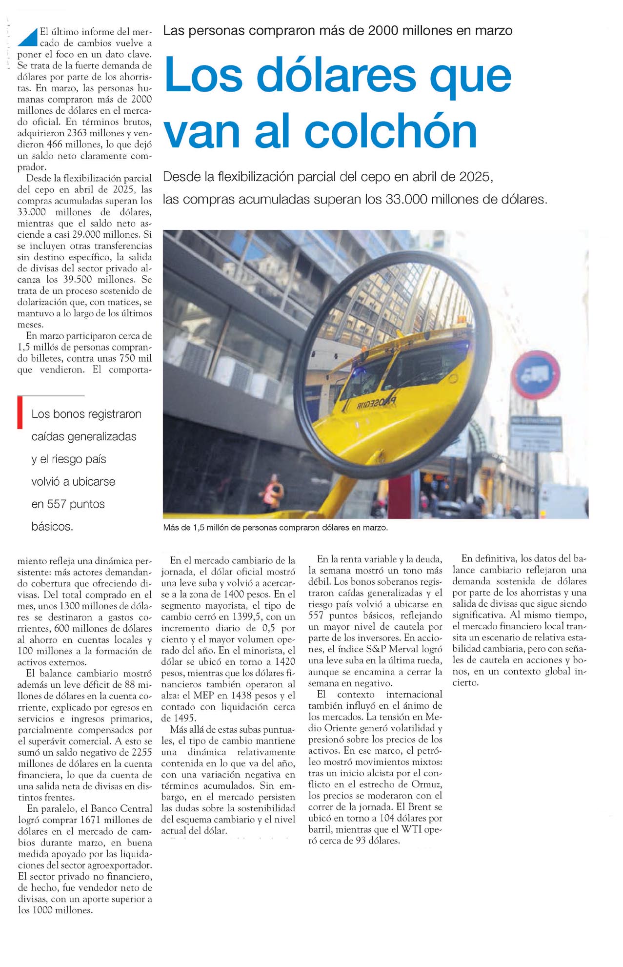 Los dólares que van al colchón El último informe del mercado de cambios vuelve a poner el foco en un dato clave. Se trata de la fuerte demanda de dólares por parte de los ahorristas. En marzo, las personas humanas compraron más de 2000 millones de dólares en el mercado oficial. En términos brutos, adquirieron 2363 millones y vendieron 466 millones, lo que dejó un saldo neto claramente comprador. Desde la flexibilización parcial del cepo en abril de 2025, las compras acumuladas superan los 33.000 millones de dólares, mientras que el saldo neto asciende a casi 29.000 millones. Se incluyen otras transferencias sin destino específico, la salida de divisas del sector privado alcanza los 39.500 millones. Se trata de un proceso sostenido de dolarización que, con matices, se mantuvo a lo largo de los últimos meses. En marzo participaron cerca de 1,5 millones de personas comprando billetes, contra unas 750 mil que vendieron. El comportamiento refleja una dinámica persistente: más actores demandando cobertura que ofreciendo divisas. Del total comprado en ese mes, unos 1300 millones de dólares se destinaron a gastos corrientes, 600 millones de dólares al ahorro en cuentas locales y 100 millones a la formación de activos externos. El balance cambiario mostró además un leve déficit de 88 millones de dólares en la cuenta corriente, explicado por egresos en servicios e ingresos primarios, parcialmente compensados por el superávit comercial. A esto se sumó un saldo negativo de 2255 millones de dólares en la cuenta financiera, lo que da cuenta de una salida neta de divisas en distintos frentes. En paralelo, el Banco Central logró comprar 1671 millones de dólares en el mercado de cambios durante marzo, en buena medida apoyado por las liquidaciones del sector agroexportador. El sector privado no financiero, de hecho, fue vendedor neto de divisas, con un aporte superior a los 1000 millones. Los bonos registraron caídas generalizadas y el riesgo país volvió a ubicarse en 557 puntos básicos. En el mercado cambiario de la jornada, el dólar oficial mostró una leve suba y volvió a acercarse a la zona de 1400 pesos. En el segmento mayorista, el tipo de cambio cerró en 1399,5, con un incremento diario de 0,5 por ciento y el mayor volumen operado del año. En el minorista, el dólar se ubicó en torno a 1420 pesos, mientras que los dólares financieros también operaron al alza: el MEP en 1438 pesos y el contado con liquidación cerca de 1495. Más allá de estas subas puntuales, el tipo de cambio mantiene una dinámica relativamente contenida en lo que va del año, con una variación negativa en términos acumulados. Sin embargo, en el mercado persiste las dudas sobre la sostenibilidad del esquema cambiario y el nivel actual del dólar. En la renta variable y la deuda, la semana mostró un tono más débil. Los bonos soberanos registraron caídas generalizadas y el riesgo país volvió a ubicarse en 557 puntos básicos, reflejando un mayor nivel de cautela por parte de los inversores. En acciones, el índice S&P Merval logró una leve suba en la última rueda, aunque se encamina a cerrar la semana en negativo. El contexto internacional también influyó en el ánimo de los mercados. La tensión en Medio Oriente generó volatilidad y presionó sobre los precios de los activos. En ese marco, el petróleo mostró movimientos mixtos: tras un inicio alcista por el conflicto en el estrecho de Ormuz, los precios se moderaron con el correr de la jornada. El Brent se ubicó en torno a 104 dólares por barril, mientras que el WTI operó cerca de 93 dólares. En definitiva, los datos del balance cambiario reflejaron una demanda sostenida de dólares por parte de los ahorristas y una salida de divisas que sigue siendo significativa. Al mismo tiempo, el mercado financiero local transita un escenario de relativa estabilidad cambiaria, pero con señales de cautela en acciones y bonos, en un contexto global incierto. Menciones: Ceco1 cfinanE