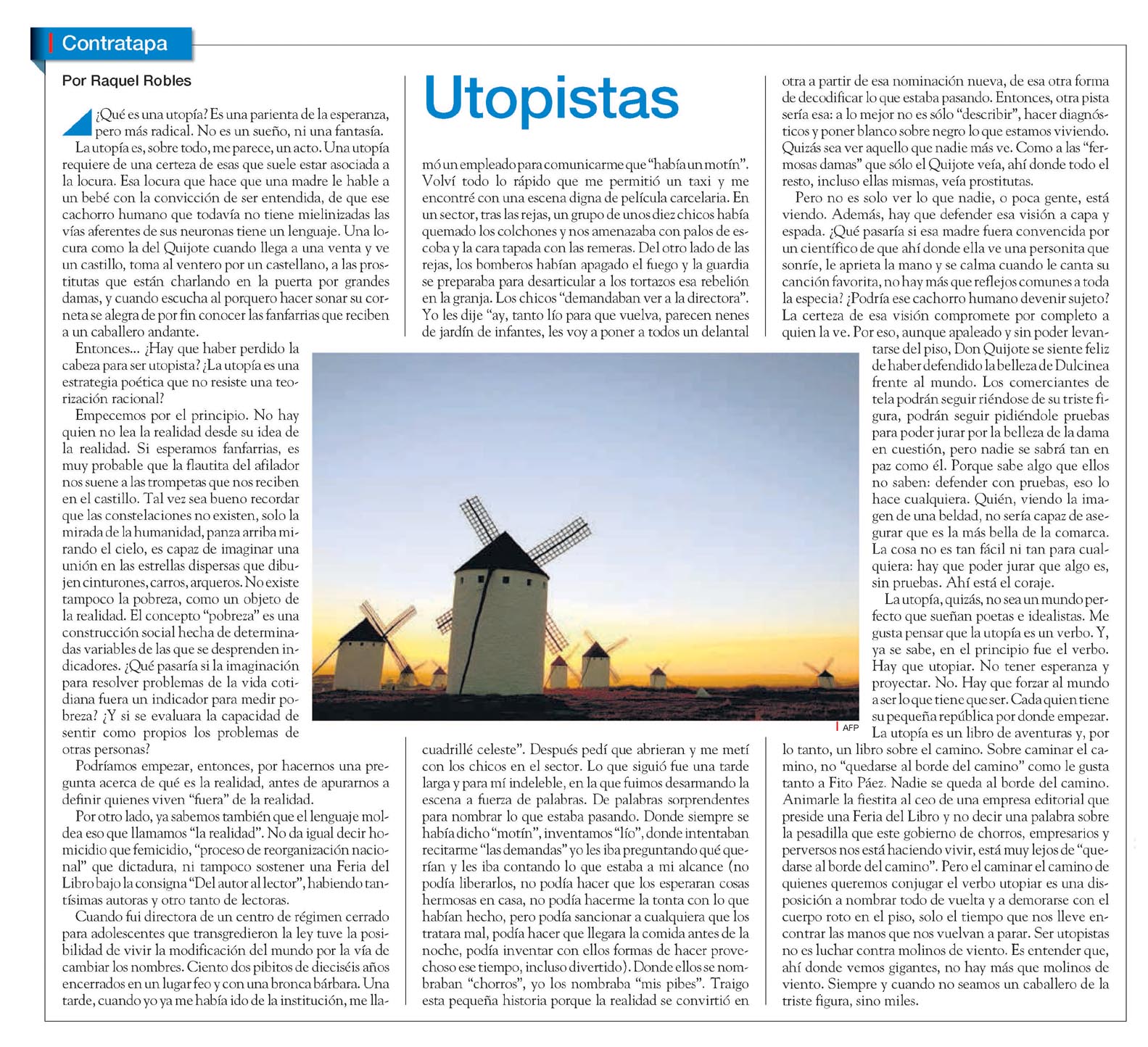 Utopistas Raquel Robles Por Raquel Robles ¿Y qué es una utopía? Es una parienta de la esperanza, pero más radical. No es un sueño ni una fantasía. La utopía es, sobre todo, me parece, un acto. Una utopía requiere de una certeza de esas que suele estar asociada a la locura. Esa locura que hace que una madre le hable a un bebé con la convicción de ser entendida, de que ese cachorro humano, que todavía no tiene mielinizadas las vías aferentes de sus neuronas, tiene un lenguaje. Una locura como la del Quijote cuando llega a una venta y ve un castillo, toma al ventero por un castellano, a las prostitutas que están charlando en la puerta por grandes damas, y cuando escucha al porquero hacer sonar su corneta se alegra de por fin conocer las fanfarrias que reciben a un caballero andante. Entonces... ¿Hay que haber perdido la cabeza para ser utopista? ¿La utopía es una estrategia poética que no resiste una teorización racional? Empecemos por el principio. No hay quien no lea la realidad desde su idea de la realidad. Si esperamos fanfarrias, es muy probable que la flautita del afilador nos suene a las trompetas que nos reciben en el castillo. Tal vez sea bueno recordar que las constelaciones no existen; solo la mirada de la humanidad, panza arriba mirando el cielo, es capaz de imaginar una unión en las estrellas dispersas que dibujen cinturones, carros, arqueros. No existe tampoco la pobreza, como un objeto de la realidad. El concepto "pobreza" es una construcción social hecha de determinadas variables de las que se desprenden indicadores. ¿Qué pasaría si la imaginación para resolver problemas de la vida cotidiana fuera un indicador para medir pobreza? ¿Y si se evaluara la capacidad de sentir como propios los problemas de otras personas? Podríamos empezar, entonces, por hacernos una pregunta acerca de qué es la realidad, antes de apurarnos a definir quiénes viven "fuera" de la realidad. Por otro lado, ya sabemos también que el lenguaje moldea eso que llamamos "la realidad". No da igual decir homicidio que femicidio, "Proceso de Reorganización Nacional" que dictadura, ni tampoco sostener una Feria del Libro bajo la consigna "Del autor al lector", habiendo tantísimas autoras y otro tanto de lectoras. Cuando fui directora de un centro de régimen cerrado para adolescentes que transgredieron la ley, tuve la posibilidad de vivir la modificación del mundo por la vía de cambiar los nombres. Ciento dos pibitos de dieciséis años, encerrados en un lugar feo y con una bronca bárbara. Una tarde, cuando yo ya me había ido de la institución, me llamó un empleado para comunicarme que "había un motín". Volví todo lo rápido que me permitió un taxi y me encontré con una escena digna de película carcelaria. En un sector, tras las rejas, un grupo de unos diez chicos había quemado los colchones y nos amenazaba con palos de escoba y la cara tapada con las remeras. Del otro lado de las rejas, los bomberos habían apagado el fuego y la guardia se preparaba para desarticular a los tortazos esa rebelión en la granja. Los chicos "demandaban ver a la directora". Yo les dije: "Ay, tanto lío para que vuelva, parecen nenes de jardín de infantes, les voy a poner a todos un delantal cuadrillé celeste". Después pedí que abrieran y me metí con los chicos en el sector. Lo que siguió fue una tarde larga y para mí indeleble, en la que fuimos desarmando la escena a fuerza de palabras. De palabras sorprendentes para nombrar lo que estaba pasando. Donde siempre se había dicho "motín", inventamos "lío"; donde intentaban recitarme "las demandas", yo les iba preguntando qué querían y les iba contando lo que estaba a mi alcance (no podía liberarlos, no podía hacer que los esperaran cosas hermosas en casa, no podía hacerme la tonta con lo que habían hecho, pero podía sancionar a cualquiera que los tratara mal, podía hacer que llegara la comida antes de la noche, podía inventar con ellos formas de hacer provechoso ese tiempo, incluso divertido). Donde ellos se nombraban "chorros", yo los nombraba "mis pibes". Traigo esta pequeña historia porque la realidad se convirtió en otra a partir de esa nominación nueva, de esa otra forma de decodificar lo que estaba pasando. Entonces, otra pista sería esa: a lo mejor no es solo "describir", hacer diagnósticos y poner blanco sobre negro lo que estamos viviendo. Quizás sea ver aquello que nadie más ve. Como a las "fermosas damas" que solo el Quijote veía, ahí donde todo el resto, incluso ellas mismas, veía prostitutas. Pero no es solo ver lo que nadie, o poca gente, está viendo. Además, hay que defender esa visión a capa y espada. ¿Qué pasaría si esa madre fuera convencida por un científico de que ahí donde ella ve una personita que sonríe, le aprieta la mano y se calma cuando le canta su canción favorita, no hay más que reflejos comunes a toda la especie? ¿Podría ese cachorro humano devenir sujeto? La certeza de esa visión compromete por completo a quien la ve. Por eso, aunque apaleado y sin poder levantarse del piso, Don Quijote se siente feliz de haber defendido la belleza de Dulcinea frente al mundo. Los comerciantes de la venta podrán seguir riéndose de su triste figura, podrán seguir pidiéndole pruebas para poder jurar por la belleza de la dama en cuestión, pero nadie se sabrá tan veraz como él. Porque sabe algo que ellos no saben: defender con pruebas, eso lo hace cualquiera. ¿Quién, viendo la imagen de una beldad, no sería capaz de asegurar que es la más bella de la comarca? La cosa no es tan fácil ni tan para cualquiera: hay que poder jurar que algo es, sin pruebas. Ahí está el coraje. La utopía, quizás, no sea un mundo perfecto que sueñan poetas e idealistas. Me gusta pensar que la utopía es un verbo. Y, ya se sabe, en el principio fue el verbo. Hay que utopiar. No tener esperanza ni proyectar. No. Hay que forzar al mundo a ser lo que tiene que ser. Cada quien tiene su pequeña repúblic