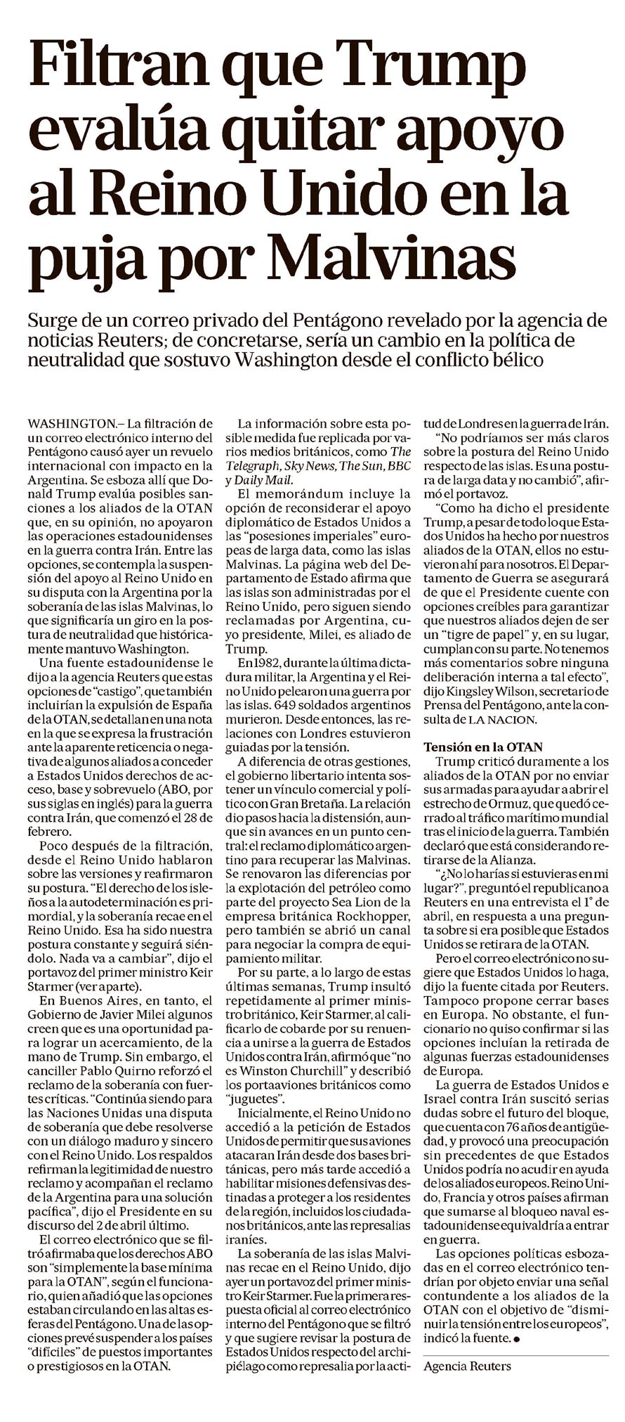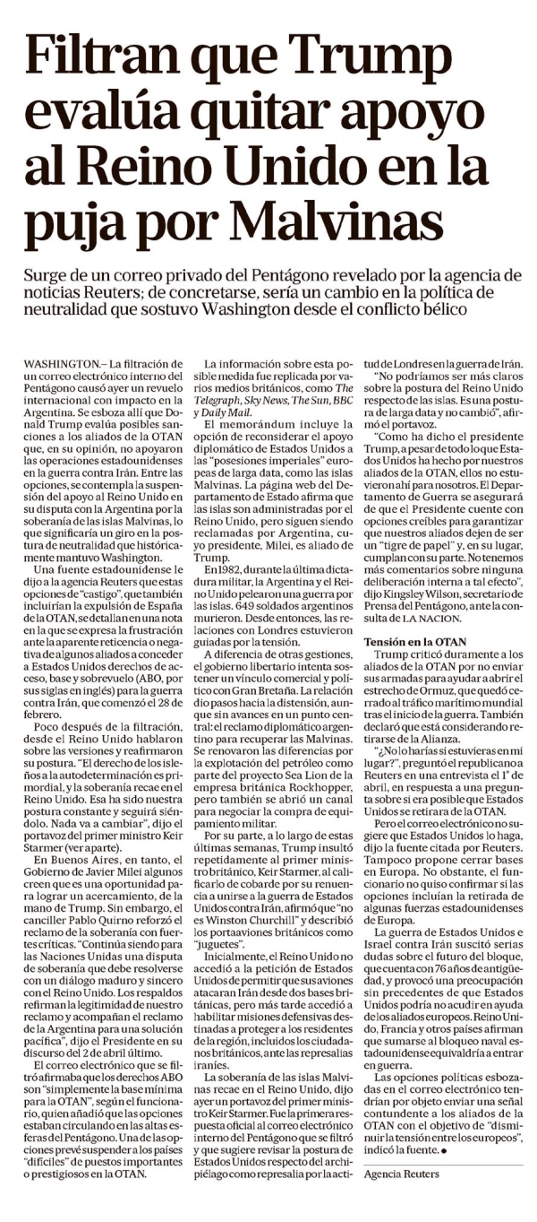 Filtran que Trump evalúa quitar apoyo al Reino Unido en la puja por Malvinas Agencia Reuters Surge de un correo privado del Pentágono revelado por la agencia de noticias Reuters; de concretarse, sería un cambio en la política de neutralidad que sostuvo Washington desde el conflicto bélico. WASHINGTON.- La filtración de un correo electrónico interno del Pentágono causó ayer un revuelo internacional con impacto en la Argentina. Se esboza allí que Donald Trump evalúa posibles sanciones a los aliados de la OTAN que, en su opinión, no apoyaron las operaciones estadounidenses en la guerra contra Irán. Entre las opciones, se contempla la suspensión del apoyo al Reino Unido en su disputa con la Argentina por la soberanía de las islas Malvinas, lo que significaría un giro en la postura de neutralidad que históricamente mantuvo Washington. Una fuente estadounidense le dijo a la agencia Reuters que estas opciones de “castigo”, que también incluirían la expulsión de España de la OTAN, se detallan en una nota en la que se expresa la frustración ante la aparente reticencia o negativa de algunos aliados a conceder a Estados Unidos derechos de acceso, base y sobrevuelo (ABO, por sus siglas en inglés) para la guerra contra Irán, que comenzó el 28 de febrero. Poco después de la filtración, desde el Reino Unido hablaron sobre las versiones y reafirmaron su postura. "El derecho de los isleños a la autodeterminación es primordial, y la soberanía recae en el Reino Unido. Esa ha sido nuestra postura constante y seguirá siéndolo. Nada va a cambiar", dijo el portavoz del primer ministro Keir Starmer (ver aparte). En Buenos Aires, en tanto, el Gobierno de Javier Milei algunos creen que es una oportunidad para lograr un acercamiento, de la mano de Trump. Sin embargo, el canciller Pablo Quirno reforzó el reclamo de la soberanía con fuertes críticas. "Continúa siendo para las Naciones Unidas una disputa de soberanía que debe resolverse con un diálogo maduro y sincero con el Reino Unido. Los respaldan y acompañan el reclamo de la Argentina para una solución pacífica", dijo el Presidente en su discurso del 2 de abril último. El correo electrónico que se filtró afirmaba que los derechos ABO son "simplemente la base mínima para la OTAN", según el funcionario, quien añadió que las opciones estaban circulando en las altas esferas del Pentágono. Una de las opciones prevé suspender a los países "difíciles" de puestos importantes o prestigiosos en la OTAN. La información sobre esta posible medida fue replicada por varios medios británicos, como The Telegraph, Sky News, The Sun, BBC y Daily Mail. El memorándum incluye la opción de reconsiderar el apoyo diplomático de Estados Unidos a las "posesiones imperiales" europeas de larga data, como las islas Malvinas. La página web del Departamento de Estado afirma que las islas son administradas por el Reino Unido, pero siguen siendo reclamadas por Argentina, cuyo presidente, Milei, es aliado de Trump. En 1982, durante la última dictadura militar, la Argentina y el Reino Unido pelearon una guerra por las islas. 649 soldados argentinos murieron. Desde entonces, las relaciones con Londres estuvieron guiadas por la tensión. A diferencia de otras gestiones, el gobierno libertario intenta sostener un vínculo comercial y político con Gran Bretaña. La relación dio pasos hacia la distensión, aunque sin avances en un punto central: el reclamo diplomático argentino para recuperar las Malvinas. Se renovaron las diferencias por la explotación del petróleo como parte del proyecto Sea Lion de la empresa británica Rockhopper, pero también se abrió un canal para negociar la compra de equipamiento militar. Por su parte, a lo largo de estas últimas semanas, Trump insultó repetidamente al primer ministro británico, Keir Starmer, al calificarlo de cobarde por su renuencia a unirse a la guerra de Estados Unidos contra Irán, afirmó que "no es Winston Churchill" y describió los portaaviones británicos como "juguetes". Inicialmente, el Reino Unido no accedió a la petición de Estados Unidos de permitir que sus aviones atacaran Irán desde dos bases británicas, pero más tarde accedió a habilitar misiones defensivas destinadas a proteger a los residentes de la región, incluidos los ciudadanos británicos, ante las represalias iraníes. La soberanía de las islas Malvinas recae en el Reino Unido, dijo ayer un portavoz del primer ministro Keir Starmer. Fue la primera respuesta oficial al correo electrónico interno del Pentágono que se filtró y que sugiere revisar la postura de Estados Unidos respecto del archipiélago como represalia por la actitud de Londres en la guerra de Irán. "No podríamos ser más claros sobre la postura del Reino Unido respecto de las islas. Es una postura de larga data y no cambió", afirmó el portavoz. "Como ha dicho el presidente Trump, a pesar de todo lo que Estados Unidos ha hecho por nuestros aliados de la OTAN, ellos no estuvieron ahí para nosotros. El Departamento de Guerra se asegurará de que el Presidente cuente con opciones creíbles para garantizar que nuestros aliados dejen de ser un 'tigre de papel' y, en su lugar, cumplan con su parte. No tenemos más comentarios sobre ninguna deliberación interna a tal efecto", dijo Kingsley Wilson, secretario de Prensa del Pentágono, ante la consulta de LA NACION. Tensión en la OTAN Trump criticó duramente a los aliados de la OTAN por no enviar sus armadas para ayudar a abrir el estrecho de Ormuz, que quedó cerrado al tráfico marítimo mundial tras el inicio de la guerra. También declaró que está considerando retirarse de la Alianza. "¿No lo harías si estuvieras en mi lugar?", preguntó el republicano a Reuters en una entrevista el 1° de abril, en respuesta a una pregunta sobre si era posible que Estados Unidos se retirara de la OTAN. Pero el correo electrónico no sugiere que Estados Unidos lo haga, dijo la fuente citada por Reuter
