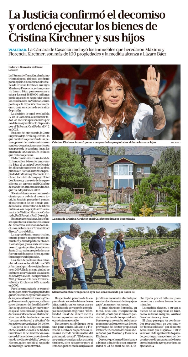 La Justicia confirmó el decomiso y ordenó ejecutar los bienes de Cristina Kirchner y sus hijos Federico González del Solar VIALIDAD. La Cámara de Casación incluyó los inmuebles que heredaron Máximo y Florencia Kirchner; son más de 100 propiedades y la medida alcanza a Lázaro Báez. Federico González del Solar LA NACION La Cámara de Casación, el máximo tribunal penal del país, confirmó por mayoría el decomiso de los bienes de Cristina Kirchner, sus hijos Máximo y Florencia, y el empresario Lázaro Báez, para comenzar a cubrir los casi $685.000 millones por los que deben responder todos los condenados en Vialidad, causa por la que la expresidenta cumple en su casa una pena de seis años de prisión. La decisión la tomó ayer la Sala IV de la Casación, al rechazar todos los recursos presentados por las defensas y ratificar lo dispuesto por el Tribunal Oral Federal N° 2 en 2022. En junio del año pasado, la Corte Suprema dejó firme aquel fallo –lo que habilitó la ejecución de las penas–, pero el decomiso entró en un sendero de apelaciones que llevó a esta parte de la condena hasta las puertas de la Casación. Es lo único que restaba ejecutar. El decomiso abarca un total de 111 inmuebles: 84 son del empresario Lázaro Báez, el principal beneficiario del direccionamiento de la obra pública en Santa Cruz; 19 son propiedad de Máximo y Florencia Kirchner, incluido el complejo Hotel Los Sauces; y uno solo de la expresidenta, un terreno en El Calafate de más de 6000 metros cuadrados, que fue adquirido en 2007. Si estos bienes resultan insuficientes para cubrir el monto total, la Justicia procederá contra el patrimonio de los demás condenados: el exsecretario de Obras Públicas José López y los exfuncionarios de Vialidad Mauricio Coll, Raúl Pavesi y Raúl Daruich. En sus presentaciones, las defensas apuntaron a limitar el alcance del decomiso, cuestionando la inclusión de bienes sin “trazabilidad directa” con el delito. La expresidenta, en particular, intentó poner a resguardo dos inmuebles y diez departamentos en Río Gallegos, y una serie de terrenos en Lago Argentino, también en Santa Cruz, todas propiedades que fueron cedidas a sus hijos, que no forman parte del proceso. Los diez departamentos están ubicados sobre la calle Mitre al 500 y fueron adquiridos originalmente en 2007. En la misma ciudad se incluyen una vivienda situada en 25 de Mayo al 200, incorporada en 2010, y otra sobre la calle Presidente Néstor Kirchner al 400, sumada en 2006. Pero la estrategia de la expresidenta para aislar esas propiedades quedó enterrada ayer con los votos de los jueces Gustavo Hornos y Diego Barroetaveña, quienes, en línea con el dictamen del fiscal Mario Villar, se opusieron. El primero marcó que el decomiso no puede quedar en una “declaración abstracta”, sino que debe traducirse en una “recuperación real y efectiva” de los activos provenientes del delito. “La pena solo adquiere plena eficacia institucional si se traduce también en la neutralización concreta del beneficio económico obtenido mediante el delito”, sostuvo Hornos, quien recibió el respaldo de su colega Barroetaveña. Máximo Kirchner reapareció ayer con una recorrida por Santa Fe. Respecto del planteo de la expresidenta sobre los bienes de sus hijos, señalaron los jueces que en los delitos de corrupción complejos no se puede exigir una “trazabilidad lineal” del dinero ilícito y basta con probar una vinculación económica razonable. Destacaron también que no es una pena contra Máximo y Florencia Kirchner en particular, sino una medida “restaurativa del patrimonio estatal”. “El decomiso no persigue castigar a los actuales titulares, sino recuperar para el Estado aquellos bienes cuya causa jurídica se encuentra afectada por su vinculación con el delito ya juzgado”, marcaron los jueces. El juez Mariano Borinsky, en tanto, tuvo una interpretación distinta, con la que se hizo eco parcial del planteo de la expresidenta. Sostuvo que no estaba suficientemente probado que ciertos bienes provengan del delito y propuso así excluir del decomiso los bienes heredados por Máximo y Florencia Kirchner. Destacó que la medida alcanza a bienes adquiridos con anterioridad al 23 de abril de 2004, fecha fijada por el tribunal para comenzar a evaluar bienes decomisables. La medida alcanza, a su vez, a bienes de las empresas de Báez, como su firma insignia, Austral Construcciones, y otras. El plazo para que los condenados respondieran en conjunto y de “forma solidaria” por el monto actualizado que dispuso el TOF 2 venció el 13 de agosto del año pasado, pero las partes apelaron y el decomiso quedó empantanado hasta la resolución de ayer que ordena su ejecución. Menciones: cpol1 ejesapp cnot