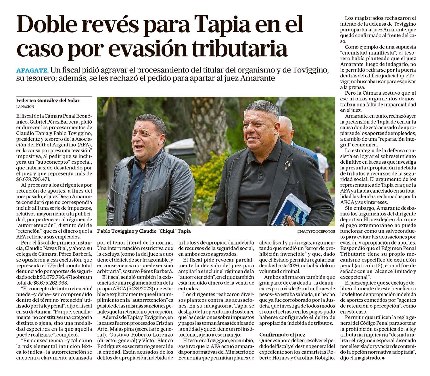 Doble revés para Tapia en el caso por evasión tributaria Federico González del Solar AFAGATE. Un fiscal pidió agravar el procesamiento del titular del organismo y de Toviggino, su tesorero; además, se les rechazó el pedido para apartar al juez Amarante Federico González del Solar LA NACION El fiscal de la Cámara Penal Económico, Gabriel Pérez Barberá, pidió endurecer los procesamientos de Claudio Tapia y Pablo Toviggino, presidente y tesorero de la Asociación del Fútbol Argentino (AFA), en la causa por presunta “evasión” impositiva, al pedir que se incluyera un “subconcepto” especial, que habría sido desatendido por el juez y que representa más de $6.679.796.471. Al procesar a los dirigentes por retención de aportes, a fines del mes pasado, el juez Diego Amarante consideró que no correspondía incluir allí una serie de impuestos, relativos mayormente a la publicidad, por pertenecer al régimen de “autorretención”, distinto del de “retención”, que es el dinero que la AFA retiene a sus empleados. Pero el fiscal de primera instancia, Claudio Navas Rial, y ahora su colega de Cámara, Pérez Barberá, se opusieron a esa exclusión, que representa el 77% del monto total denunciado por aportes de seguridad social: $6.679.796.471 sobre un total de $8.675.262.968. “El concepto de “autorretención” puede –y debe– ser comprendido dentro del término 'retención' utilizado por la ley penal”, dijo el fiscal en su dictamen. “Porque, sencillamente, no constituye una categoría distinta o ajena, sino una modalidad específica en la que aquella puede realizarse”, completó. “En consecuencia –y tal como la más elemental intuición léxica lo indica– la autorretención se encuentra claramente alcanzada por el tenor literal de la norma. Una interpretación restrictiva que la excluya (como la del juez a quo) tiene el déficit de ser irrazonable, y en consecuencia no puede ser arbitraria”, sostuvo Pérez Barberá. El fiscal señaló también la existencia de una reglamentación del propia ARCA (5439/2023) que establece explícitamente que el incumplimiento en la “autorretención” es pasible de las mismas sanciones penales que la retención o percepción. Además de Tapia y Toviggino, en la causa fueron procesados Cristian Ariel Malaspina (secretario general), Gustavo Roberto Lorenzo (director general) y Víctor Blanco Rodríguez, exsecretario general de la entidad. Están acusados de los delitos de apropiación indebida de tributos y de apropiación indebida de recursos de la seguridad social, en ambos casos agravados. El fiscal pide revocar parcialmente la decisión del juez para ampliarla e incluir el régimen de la “autorretención”, en el que también está incluido dinero de la venta de entradas. Los dirigentes realizaron diversos planteos contra las acusaciones. En su indagatoria, Tapia se desligó de la operatoria al sostener que las decisiones sobre impuestos y pagos las toman áreas técnicas de la entidad y que él tiene un rol institucional, ajeno a ese manejo. El tesorero Toviggino, en cambio, sostuvo que la AFA actuó amparada por normativas del Ministerio de Economía que permitían planes de Pablo Toviggino y Claudio "Chiqui" Tapia (ONATYPONCEFOTOS alivio fiscal y prórrogas, argumentando que medió un “error de prohibición invencible” y que, dado que el Estado permitía regularizar deudas hasta 2026, no había dolo ni voluntad criminal. Ambos afirmaron también que gran parte de esa deuda –la denuncia es por más de 19 mil millones de pesos– ya estaba saldada, un hecho que ya fue corroborado por la Justicia, que investiga de todos modos si con el retraso en los pagos pudo haberse configurado el delito de apropiación indebida de tributos. Confirmado el juez Quienes ahora deben resolver el pedido del fiscal y el destino general del expediente son los camaristas Roberto Hornos y Carolina Robiglio. Los magistrados rechazaron el intento de la defensa de Toviggino para apartar al juez Amarante, que quedó confirmado al frente del caso. Como ejemplo de una supuesta “enemistad manifiesta”, el tesorero había planteado que el juez Amarante, luego de indagarlo, no le permitió retirarse por la puerta de atrás del edificio judicial, que Toviggino buscaba usar para esquivar a la prensa. Pero la Cámara sostuvo que no se ni otros argumentos demostraban una falta de imparcialidad en el juez. Amarante, en tanto, rechazó ayer la pretensión de Tapia de cerrar la causa donde está acusado de apropiarse de los aportes de empleados, a cambio de una “reparación integral” económica. La estrategia de la defensa consistía en lograr el sobreseimiento definitivo en la causa que investiga la presunta apropiación indebida de tributos y recursos de la seguridad social. El argumento de los representantes de Tapia era que la AFA ya había cancelado en su totalidad las deudas reclamadas por la ARCA y sus intereses. Sin embargo, Amarante desbarató los argumentos del dirigente deportivo. El juez dejó en claro que el pago extemporáneo no puede funcionar como un salvoconducto para evitar las acusaciones por evasión y apropiación de aportes. Respondió que el Régimen Penal Tributario tiene su propio mecanismo específico de extinción penal (artículo 16), el cual fue diseñado con un “alcance limitado y excepcional”. El juez explicó que se excluyó deliberadamente de este beneficio a los delitos de apropiación indebida de aportes cometidos por “agentes de retención o percepción”, como en este caso. Permitir que utilicen la regla general del Código Penal para sortear la prohibición específica de la ley tributaria implicaría “desnaturalizar el régimen especial diseñado por el legislador y vaciar de contenido la opción normativa adoptada”, dijo el magistrado. Menciones: cpol1