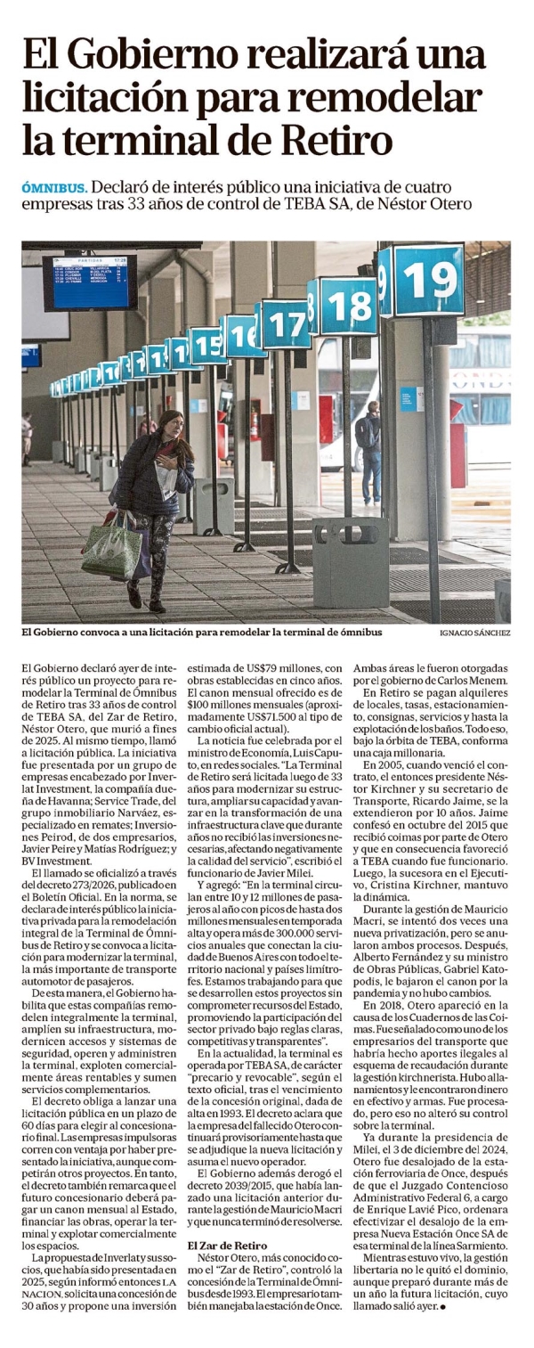 El Gobierno realizará una licitación para remodelar la terminal de Retiro IGNACIO SÁNCHEZ ÓMNIBUS. Declaró de interés público una iniciativa de cuatro empresas tras 33 años de control de TEBA SA, de Néstor Otero El Gobierno convoca a una licitación para remodelar la terminal de ómnibus IGNACIO SÁNCHEZ El Gobierno declaró ayer de interés público un proyecto para remodelar la Terminal de Ómnibus de Retiro tras 33 años de control de TEBA SA, del Zar de Retiro, Néstor Otero, que murió a fines de 2025. Al mismo tiempo, llamó a licitación pública. La iniciativa fue presentada por un grupo de empresas encabezado por Inverlat Investment, la compañía dueña de Havanna; Service Trade, del grupo inmobiliario Narváez, especializado en remates; Inversiones Peirod, de dos empresarios, Javier Peire y Matías Rodríguez; y BV Investment. El llamado se oficializó a través del decreto 273/2026, publicado en el Boletín Oficial. En la norma, se declara de interés público la iniciativa privada para la remodelación integral de la Terminal de Ómnibus de Retiro y se convoca a licitación para modernizar la terminal, la más importante de transporte automotor de pasajeros. De esta manera, el Gobierno habilita que estas compañías remodelen integralmente la terminal, amplíen su infraestructura, modernicen accesos y sistemas de seguridad, operen y administren la terminal, exploten comercialmente áreas rentables y sumen servicios complementarios. El decreto obliga a lanzar una licitación pública en un plazo de 60 días para elegir al concesionario final. Las empresas impulsoras corren con ventaja por haber presentado la iniciativa, aunque competirán otros proyectos. En tanto, el decreto también remarca que el futuro concesionario deberá pagar un canon mensual al Estado, financiar las obras, operar la terminal y explotar comercialmente los espacios. La propuesta de Inverlat y sus socios, que había sido presentada en 2025, según informó entonces LA NACION, solicita una concesión de 30 años y propone una inversión estimada de US$79 millones, con obras establecidas en cinco años. El canon mensual ofrecido es de $100 millones mensuales (aproximadamente US$71.500 al tipo de cambio oficial actual). La noticia fue celebrada por el ministro de Economía, Luis Caputo, en redes sociales. "La Terminal de Retiro será licitada luego de 33 años para modernizar su estructura, ampliar su capacidad y avanzar en la transformación de una infraestructura clave que durante años no recibió las inversiones necesarias, afectando negativamente la calidad del servicio", escribió el funcionario de Javier Milei. Y agregó: "En la terminal circulan entre 10 y 12 millones de pasajeros al año con picos de hasta dos millones mensuales en temporada alta y opera más de 300.000 servicios anuales que conectan la ciudad de Buenos Aires con todo el territorio nacional y países limítrofes. Estamos trabajando para que se desarrollen estos proyectos sin comprometer recursos del Estado, promoviendo la participación del sector privado bajo reglas claras, competitivas y transparentes". En la actualidad, la terminal es operada por TEBA SA, de carácter "precario y revocable", según el texto oficial, tras el vencimiento de la concesión original, dada de alta en 1993. El decreto aclara que la empresa del fallecido Otero continuará provisoriamente hasta que se adjudique la nueva licitación y asuma el nuevo operador. El Gobierno además derogó el decreto 2039/2015, que había lanzado una licitación anterior durante la gestión de Mauricio Macri y que nunca terminó de resolverse. El Zar de Retiro Néstor Otero, más conocido como el “Zar de Retiro”, controló la concesión de la Terminal de Ómnibus desde 1993. El empresario también manejaba la estación de Once. Ambas áreas le fueron otorgadas por el gobierno de Carlos Menem. En Retiro se pagan alquileres de locales, tasas, estacionamiento, consignas, servicios y hasta la explotación de los baños. Todo eso, bajo la órbita de TEBA, conforma una caja millonaria. En 2005, cuando venció el contrato, el entonces presidente Néstor Kirchner y su secretario de Transporte, Ricardo Jaime, se lo extendieron por 10 años. Jaime confesó en octubre del 2015 que recibió coimas por parte de Otero y que en consecuencia favoreció a TEBA cuando fue funcionario. Luego, la sucesora en el Ejecutivo, Cristina Kirchner, mantuvo la dinámica. Durante la gestión de Mauricio Macri, se intentó dos veces una nueva privatización, pero se anularon ambos procesos. Después, Alberto Fernández y su ministro de Obras Públicas, Gabriel Katopodis, le bajaron el canon por la pandemia y no hubo cambios. En 2018, Otero apareció en la causa de los Cuadernos de las Coimas. Fue señalado como uno de los empresarios del transporte que habría hecho aportes ilegales al esquema de recaudación durante la gestión kirchnerista. Hubo allanamientos y le encontraron dinero en efectivo y armas. Fue procesado, pero eso no alteró su control sobre la terminal. Ya durante la presidencia de Milei, el 3 de diciembre del 2024, Otero fue desalojado de la estación ferroviaria de Once, después de que el Juzgado Contencioso Administrativo Federal 6, a cargo de Enrique Lavié Pico, ordenara efectivizar el desalojo de la empresa Nueva Estación Once SA de esa terminal de la línea Sarmiento. Mientras estuvo vivo, la gestión libertaria no le quitó el dominio, aunque preparó durante más de un año la futura licitación, cuyo llamado salió ayer. Menciones: Ceco1 cfinanE