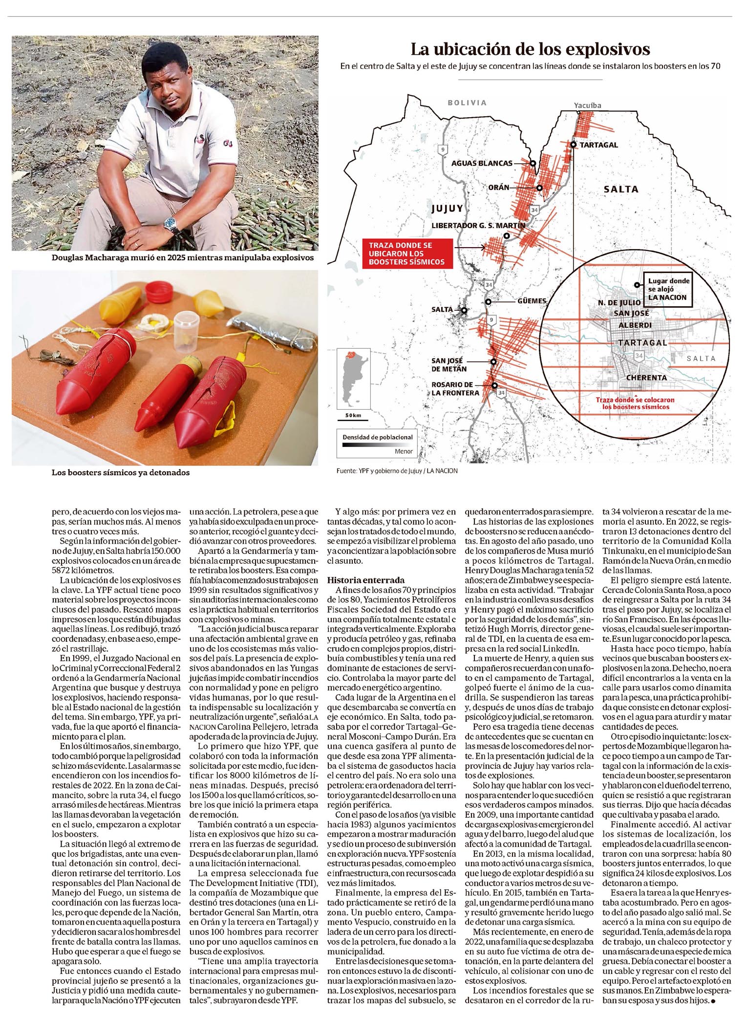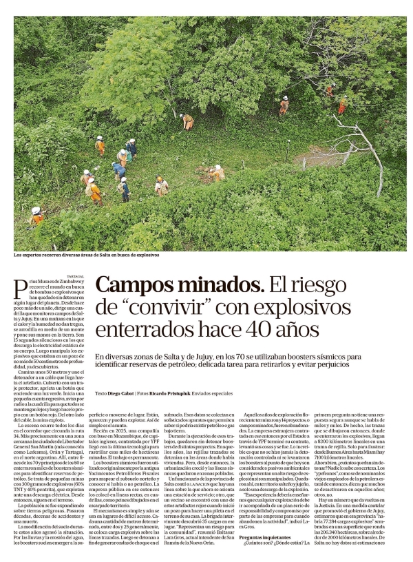 Campos minados. El riesgo de "convivir" con explosivos enterrados hace 40 años Diego Cabot TARTAGAL Marcus Musa es de Zimbabwe y recorre el mundo en busca de bombas o explosivos que han quedado sin detonar en algún lugar del planeta. Desde hace poco más de un año, dirige una cuadrilla que monitorea campos de Salta y Jujuy. En una mañana en la que el calor y la humedad no dan tregua, se arrodilla en medio de un monte y pone sus manos en la tierra. Son 15 segundos silenciosos en los que descarga la electricidad estática de su cuerpo. Luego manipula los explosivos que estaban en un pozo de no más de 50 centímetros de profundidad, ya descubiertos. Camina unos 50 metros y une el detonador a un cable que llega hasta el artefacto. Cubierto con un traje protector, aprieta un botón que enciende una luz verde. Inicia una pequeña cuenta regresiva, avisa por radio a la cuadrilla para que todos se mantengan lejos y luego hacelo propio con un botón rojo. Del otro lado del cable, la mina explota. La escena ocurre todos los días en el corredor que circunda la ruta 34. Más precisamente en una zona cercana a las ciudades de Libertador General San Martín (más conocida como Ledesma), Orán y Tartagal, en el norte argentino. Allí, entre fines de los 70 y principios de los 80 se enterraron miles de boosters sísmicos para identificar reservas de petróleo. Se trata de pequeñas minas con 300 gramos de explosivos (60% TNT y 40% pentrita), que explotan ante una descarga eléctrica. Desde entonces, siguen en el terreno. La población se fue expandiendo sobre tierras peligrosas. Pasaron décadas, decenas de accidentes y una muerte. La modificación del suelo durante estos años agravó la situación. Por las lluvias y la erosión del agua, los boosters suelen emerger a la superficie o moverse de lugar. Están, aparecen y pueden explotar. Así de simple es el asunto. Recién en 2025, una compañía con base en Mozambique, de capitales ingleses, contratada por YPF, llegó con la última tecnología para rastrillar esas miles de hectáreas minadas. El trabajo es permanente. Los boosters sísmicos fueron utilizados originalmente por la antigua Yacimientos Petrolíferos Fiscales para mapear el subsuelo norteño y conocer si había o no petróleo. La empresa pública en ese entonces los colocó en líneas rectas, en cuadrillas, como peines dibujados en el escarpado territorio. El mecanismo es simple y aún se usa en lugares de difícil acceso. Cada una cantidad de metros determinada, entre dos y 25, generalmente, se coloca carga explosiva sobre las líneas trazadas. Luego se detonan a fin de generar ondas de choque en el subsuelo. Esos datos se colectan en sofisticados aparatos que permiten saber si podría existir petróleo o gas bajo tierra. Durante la ejecución de esos trabajos, quedaron sin detonar boosters de distintos proyectos. En aquellos años, las rejillas trazadas se detenían en las áreas donde había viviendas. Pero, desde entonces, la urbanización creció y las líneas sísmicas quedaron en zonas pobladas. Un funcionario de la provincia de Salta contó a LA NACION que hay una línea sobre la que ahora se asienta una estación de servicio; otro, que un vecino se encontró con uno de estos artefactos rojos cuando inició un pozo para hacer una pileta en el terreno de su casa. La brigada interviniente descubrió 35 cargas en ese lugar. "Representan un riesgo para la comunidad", resumió Baltasar Lara Gros, actual intendente de San Ramón de la Nueva Orán. Aquellos años de exploración floreciente terminaron y 14 proyectos, o campos minados, fueron abandonados. La empresa extranjera contratada en ese entonces por el Estado a través de YPF terminó su contrato, levantó sus cosas y se fue. Lo increíble es que no se hizo jamás la detonación controlada ni se levantaron los boosters al punto de que hoy son considerados pasivos ambientales que representan un alto riesgo de explosión si son manipulados. Quedaron ahí, en territorio salteño y jujeño, a solo una descarga de la explosión. "Esa experiencia debería enseñarnos que cualquier explotación debe ir acompañada de un plan serio de responsabilidad y compromiso por parte de las empresas para cuando abandonen la actividad", indicó Lara Gros. Preguntas inquietantes ¿Cuántos son? ¿Dónde están? La primera pregunta no tiene una respuesta segura, aunque se habla de miles y miles. De hecho, las trazas que se dibujaron entonces, donde se enterraron los explosivos, llegan a 8300 kilómetros lineales en una trama de rejilla. Solo para ilustrar: desde Buenos Aires hasta Miami hay 7100 kilómetros lineales. Ahorabien, ¿cuántos quedan sin detonar? Nadie lo sabe con certeza. Los "ypefeanos", como se denominan los viejos empleados de la petrolera estatal de entonces, dicen que muchos se desactivaron en aquellos años; otros, no. Hay un número que da vueltas en la Justicia. En una medida cautelar que promovió el gobierno de Jujuy, estimaron que en esa provincia "habría 77.284 cargas explosivas" sembradas en una superficie que ronda las 206.340 hectáreas, sobre alrededor de 2000 kilómetros lineales. De Salta no hay datos ni estimaciones. Los boosters sísmicos ya detonados La ubicacion de los explosivos En el centro de Salta y el este de Jujuy se concentran las líneas donde se instalaron los boosters en los 70. Fuente: YPF y gobierno de Jujuy / LA NACION. Pero, de acuerdo con los viejos mapas, serían muchos más. Al menos es cuatro veces más. Según la información del gobierno de Jujuy, en Salta habría 150.000 explosivos colocados en un área de 5872 kilómetros. La ubicación de los explosivos es clave. La YPF actual tiene poco material sobre los proyectos inconclusos del pasado. Rescató mapas impresos en los que están dibujadas aquellas líneas. Los redibujó, trazó coordenadas y, en base a eso, empezó el rastrillaje. En 1999, el Juzgado Nacional de lo Criminal y Correccional Federal 2 ordenó a la Gendarmería Nacional Arg
