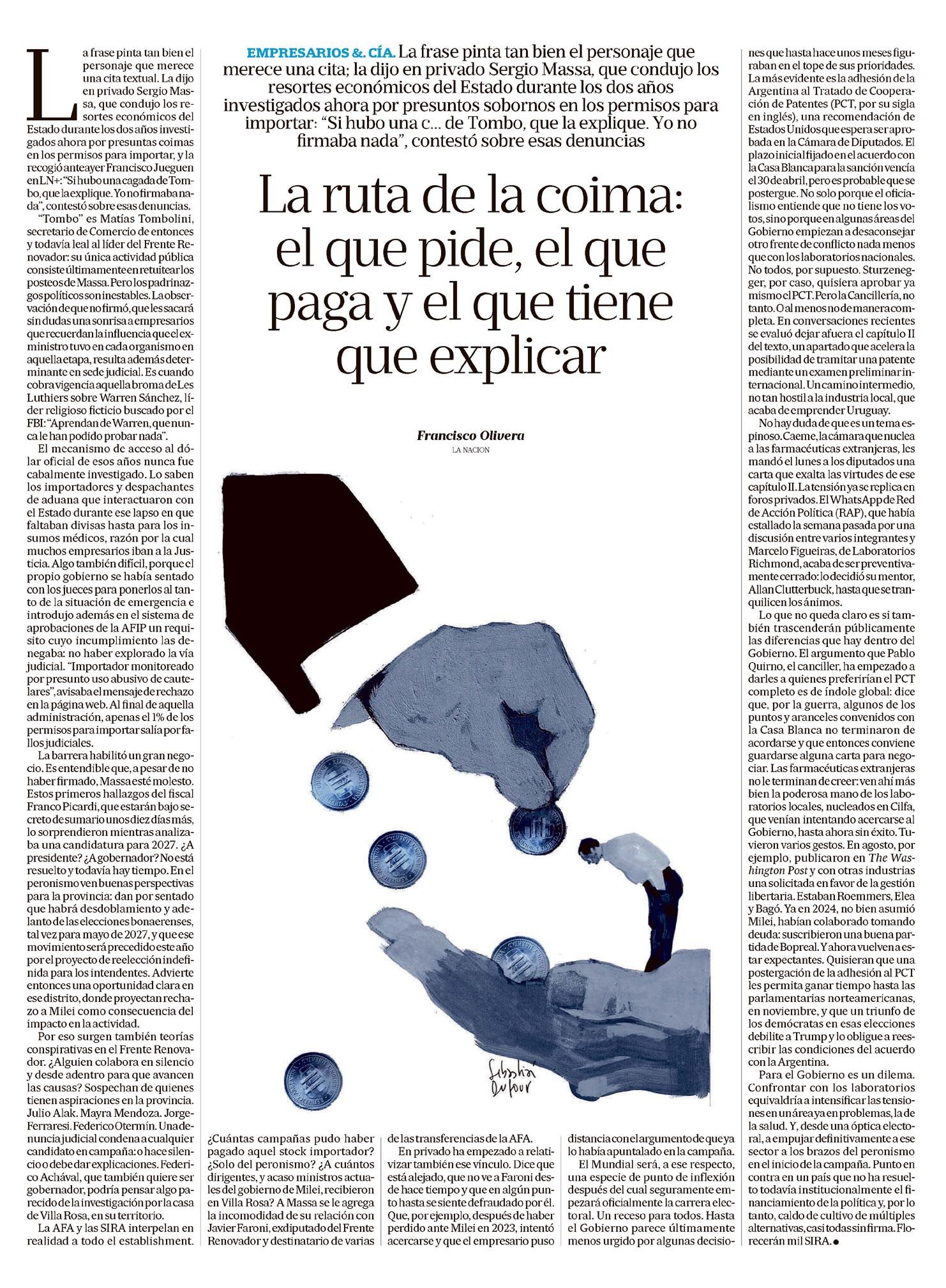 La ruta de la coima: el que pide, el que paga y el que tiene que explicar Francisco Olivera a frase pinta tan bien el personaje que merece una cita textual. La dijo en privado Sergio Massa, que condujo los resortes económicos del Estado durante los dos años investigados ahora por presuntas coimas en los permisos para importar, y la recogió anteayer Francisco Jueguen en LN+: “Si hubo una cagada de Tombo, que la explique. Yo no firmaba nada”, contestó sobre esas denuncias. “Tombo” es Matías Tombolini, secretario de Comercio de entonces y todavía leal al líder del Frente Renovador: su única actividad pública consiste últimamente en retuitear lo posteos de Massa. Pero los padrinazgos políticos son inestables. La observación de que no firmó, que le sacará sin dudas una sonrisa a empresarios que recuerdan la influencia que el exministro tuvo en cada organismo en aquella etapa, resulta además determinante en sede judicial. Es cuando cobra vigencia aquella broma de Les Luthiers sobre Warren Sánchez, el líder religioso ficticio buscado por el FBI: “Aprendan de Warren, que nunca le han podido probar nada”. El mecanismo de acceso al dólar oficial de esos años nunca fue cabalmente investigado. Lo saben los importadores y despachantes de aduana que interactuaron con el Estado durante ese lapso en que faltaban divisas hasta para los insumos médicos, razón por la cual muchos empresarios iban a la Justicia. Algo también difícil, porque el propio gobierno se había sentado con los jueces para ponerlos al tanto de la situación de emergencia e introdujo además en el sistema de aprobaciones de la AFIP un requisito cuyo incumplimiento las denegaba: no haber explorado la vía judicial. “Importador monitoreado por presunto uso abusivo de cautelares”, avisaba el mensaje de rechazo en la página web. Al final de aquella administración, apenas el 1% de los permisos para importar salía por fallos judiciales. La barrera habilitó un gran negocio. Es entendible que, a pesar de haber firmado, Massa esté molesto. Estos primeros hallazgos del fiscal Franco Picardi, que estarán bajo secretode sumario unos diez días más, lo sorprendieron mientras analizaba una candidatura para 2027. ¿A presidente? ¿A gobernador? No está resuelto y todavía hay tiempo. El peronismo ve buenas perspectivas para la provincia: dan por sentado que habrá desdoblamiento y adelanto de las elecciones bonaerenses, tal vez para mayo de 2027, y que ese movimiento será precedido este año por el proyecto de reelección indefinida para los intendentes. Advierte entonces una oportunidad clara en ese distrito, donde proyectan rechazo a Milei como consecuencia del impacto en la actividad. Por eso surgen también teorías conspirativas en el Frente Renovador. ¿Alguien colabora en silencio y desde adentro para que avancen las causas? Sospechan de quienes tienen aspiraciones en la provincia. Julio Alak. Mayra Mendoza. Jorge Ferraresi. Federico Otermín. Una denuncia judicial condena a cualquier candidato en campaña: o hace silencio o debe dar explicaciones. Federico Achával, que también quiere ser gobernador, podría pensar algo parecido de la investigación por la casa de Villa Rosa, en su territorio. La AFA y las SIRA interpelan en realidad a todo el establishment. EMPRESARIOS & CÍA. La frase pinta tan bien el personaje que merece una cita; la dijo en privado Sergio Massa, que condujo los resortes económicos del Estado durante los dos años investigados ahora por presuntos sobornos en los permisos para importar: “Si hubo una c... de Tombo, que la explique. Yo no firmaba nada”, contestó sobre esas denuncias. La ruta de la coima: el que pide, el que paga y el que tiene que explicar ¿Cuántas campañas pudo haber pagado aquel stock importador? ¿Solo del peronismo? ¿A cuántos dirigentes, y acaso ministros actuales del gobierno de Milei, recibieron en Villa Rosa? A Massa se le agrega la incomodidad de su relación con Javier Faroni, exdiputado del Frente Renovador y destinatario de varias de las transferencias de la AFA. En privado ha empezado a relativizar también ese vínculo. Dice que está alejado, que no ve a Faroni desde hace tiempo y que en algún punto hasta se siente defraudado por él. Que, por ejemplo, después de haber perdido ante Milei en 2023, intentó acercarse y que el empresario puso distancia con el argumento de que ya lo había apuntalado en la campaña. El Mundial será, a ese respecto, una especie de punto de inflexión después del cual seguramente empezará oficialmente la carrera electoral. Un receso para todos. Hasta el Gobierno parece últimamente menos urgido por algunas decisiones que hasta hace unos meses figuraban en el tope de sus prioridades. La más evidente es la adhesión de la Argentina al Tratado de Cooperación de Patentes (PCT, por su sigla en inglés), una recomendación de Estados Unidos que espera ser aprobada en la Cámara de Diputados. El plazo inicial fijado en el acuerdo con la Casa Blanca para la sanción vencía el 30 de abril, pero es probable que se postergue. No solo porque el oficialismo entiende que no tiene los votos, sino porque en algunas áreas del Gobierno empiezan a desaconsejar otro frente de conflicto nada menos que con los laboratorios nacionales. No todos, por supuesto. Sturzenegger, por caso, quisiera aprobar ya mismo el PCT. Pero la Cancillería, en tanto. O al menos no de manera completa. En conversaciones recientes se evaluó dejar afuera el capítulo II del texto, un apartado que acelera la posibilidad de tramitar una patente mediante un examen preliminar internacional. Un camino intermedio, no tan hostil a la industria local, que acaba de emprender Uruguay. No hay duda de que es un tema espinoso. Caeme, la cámara que nuclea a las farmacéuticas extranjeras, le mandó el lunes a los diputados una carta que exalta las virtudes de ese capítulo II. La tensión ya se replica en foros privados. El WhatsApp de Red de Acción Polí