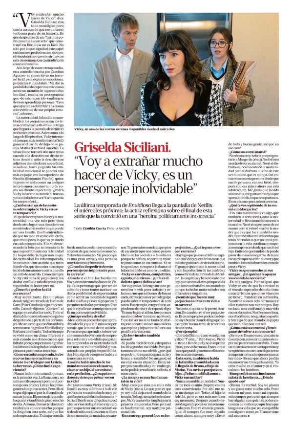 Griselda Siciliani: "Voy a extrañar mucho hacer de Vicky, es un personaje inolvidable" Cynthia Caccia Voy a extrañar mucho hacer de Vicky”, dice Griselda Siciliani con tono nostálgico pero con la certeza de que ese universo ya forma parte de su historia. Es que despedirse de esa “heroína políticamente incorrecta” que construyó en Envidiosa no es fácil. No sólo por lo que significó este papel en términos profesionales, sino por el vínculo íntimo que construyó con esta cuarentona tan contradictoria como entrañable. A lo largo de cuatro temporadas, esta comedia -escrita por Carolina Aguirre- se convirtió en un terreno fértil para explorar emociones, prejuicios y mandatos. “Me dio la posibilidad de experimentar como actriz un montón de lugares todos los días”, resalta su protagonista que -de este recorrido- también se lleva un aprendizaje personal: “Creo que aprendí a sobrevivir; ella es una sobreviviente de sus propias roturas”, advierte. La maternidad, la familia ensamblada y los prejuicios serán los temas centrales en esta última entrega que llegará a la pantalla de Netflix el miércoles próximo. Así es como, a lo largo de 10 episodios, Vicky intentará (aunque no le resultará nada fácil) ganarse el cariño del hijo de su pareja, Matías (Esteban Lamothe). La situación se tornará aún más tensa cuando ella descubra un diario íntimo donde el niño la describe con adjetivos demoledores: superficial, mandona, burra y egoísta. Su estabilidad emocional se pondrá aún más en jaque con la reaparición de Nicolás (Benjamín Vicuña), quien regresa no solo como un antiguo interés amoroso sino también como un cliente importante. ¿Podrá Vicky lidiar con su miedo al fracaso y a la soledad esta vez? La respuesta los sorprenderá... -¿Cuál será el eje de las sesiones de terapia de Vicky en esta temporada? -El eje de la terapia es Vicky y la maternidad una vez más pero vista desde otro lugar; va a descubrir un montón de cosas sobre lo que puede ser una familia. Es ella entendiendiendo que no todo es como ella creía, que es un poco lo que va pasando en cada temporada. Ella va desarmando la foto que se inventó de lo que supuestamente era la felicidad y a lo que debería llegar una mujer de cierta edad. En esta temporada, le toca estar con un niño que no es hijo de ella, que tiene otra mamá que lo cría de una manera con la que ella no está de acuerdo. Como siempre Vicky está llena de prejuicios y, sin dudas, eso fue lo más divertido y enriquecedor de hacer para mí. -¿Cómo fue grabar la última escena? -Muy movilizante. Era un plano donde salgo corriendo de la casa de Caro (Pilar Gamboa); algo muy sencillo. Cuando dijeron: “¡Corten!”, el equipo ya estaba llorando. Todo este día habíamos estado muy cargados despidiendo a parte de los personajes. Me acuerdo que ese día también terminaron de grabar Mari Bellati y Bárbara Lombardo. Todo el tiempo se vivió como un clima diferente y más cuando nos dimos cuenta que faltaba poco y empezamos a grabar los últimos 2 o 3 capítulos donde empiezan a pasar cosas emotivas. -Como en cada temporada, hubo nuevas incorporaciones y en ésta te tocó trabajar con Leticia, tu hermana. ¿Cómo fue la experiencia? -Nunca habíamos actuado juntas, es la primera vez. La llamaron y no sabían si iba a querer porque el personaje era chico y Leti ya ha protagonizado algunas series. Pero ella a oque dijo que sí por la diversión de actuar juntas. El personaje le quedaba genial y también le puso mucho de ella. Además, Barone (el director) también la conoce mucho porque la dirigió en otra serie, así que fue todo espectacular. Trabajar con ella fue de mucha confianza y conexión; además de que nos reímos mucho. Y yo la admiro mucho. Me parece que es una gran actriz y una persona muy talentosa y luminosa. -¿Cómo fue despedirte de este personaje tan importante para tu carrera? -Cuando vi el final fue fuertísimo. Voy a extrañar mucho hacer de Vicky. Es un personaje que -por ser tan colorido y tener tantos matices- me dio la posibilidad de experimentar como actriz un montón de lugares todos los días y eso es algo que no te permiten todos los personajes. Creo que la voy a llevar conmigo siempre. Es un personaje inolvidable. -¿Qué aprendiste de ella? -Me cuesta un poco saber qué aprendí de ella y que le di mío a ese personaje, que le sumé de mi cosecha. Pero creo que aprendí a sobrevivir; ella es una sobreviviente de sus propias roturas y a medida que pasan las temporadas va mostrando cada vez más su vulnerabilidad y asumiendo sus propias imposibilidades. Hay algo de eso que es lindo y lo tomo para mi vida. -La serie habla mucho de los mandatos sociales: el casarse, el tener un hijo, el ser exitosa en la profesión... ¿Con qué mandatos tuviste que pelear vos en tu vida? -No tantos como Vicky (risas). Mi familia es muy diferente a la de ella y tuve una vocación desde muy pequeña que también me dio mucha libertad. Desde muy chiquita empecé a bailar y me dediqué a eso y siempre pienso que tener una vocación fuerte desde niño o adolescente te libera de un montón de mandatos externos. Te genera los mandatos propios de ese metié (que son otros) pero te libera de los sociales o familiares porque te enfoca, te permite volar, te pone como en un camino. Yo soy agradezco siempre a la danza; me ha dado un amor a un oficio. Vicky es envidiosa, competitiva, egoísta, mentirosa... ¿Cuál es ese efecto que te define a vos? -Serexplosiva. Yo tengo un tono general en la vida para trabajar y relacionarme que es bueno, de buen rollo, de buen humor pero de golpe puedo subir la temperatura de cero a cien. Por ejemplo, estoy re bien, cagándome de risa y de repente digo: “Es muy bajito el sillón, busquemos un almohadón” (con tono nervioso). Y eso tal vez no se ve tanto de afuera pero adentro mío es una caldera que explota y baja como si fuera una astilla efervescente. -¿En los vínculos también 