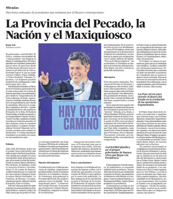 La Provincia del Pecado, la Nación y el Maxiquiosco Jorge Asís Elecciones enlazadas de postulantes que reclaman por el Plutarco contemporáneo El gobernador Axel Kicillof, El Gótico, contiene un enjambre de “vidas paralelas” que inspiran al Plutarco contemporáneo. El Gótico planifica ser el primer gobernador que se eleve en garrocha desde La Plata hasta aterrizar en la residencia presidencial de Olivos. Pretende lograr lo que no pudo Antonio Cafiero, Pater Familia, o Carlos Ruckauf, Vibrante Libertario, o el inspirado patriota Daniel Scioli, predispuesto Líder de la Línea Aire y Sol. Sólo Eduardo Duhalde, el Piloto de las Tormentas (generadas), fue el mini gobernador de Lomas de Zamora que llegó a ser gobernador, pero desde la vicepresidencia de Carlos Menem, El Emir. Aparte, el prócer Duhalde también desembocó en la presidencia, pero desde la senaduría. Merced a la Asamblea Legislativa del 2001, cuando la mampostería se caía a pedazos. Fernando De la Rúa, El Radical Traicionable, se había evaporado, y el vicepresidente Chacho Alvarez, Varela Varelita, también se había borrado por tonterías morales. 25 años después, dista de repetirse aquel drama. La señora vicepresidenta Victoria Villarruel, La Cayetana, persiste para asumir en media hora. Y a tomar juramento el gabinete ya escogido, a lo sumo, en otra media hora más. Pelotón Julio Alak, El Paisano, quiere ser el primer mini gobernador que salta en garrocha hacia la gobernación. Sortija que compite con otros entrañables mini gobernadores que atraviesan la edad del poder. Desde la señora Mayra Mendoza, Flor Robada, de Quilmes, hasta el velocista Federico Otermín, Jésico II, de Lomas de Zamora, créditos lanzados por La (Agencia de Colocaciones) Cámpora, hasta la señora Mariel Fernández, La Castrista, de Moreno, o el empecinado peronista cultural Gabriel Katopodis, Kato el Griego. Para las vidas paralelas del siglo veintiuno se anota también en el pelotón Federico Achaval, Lúdico, de Pilar, hasta que de pronto el Cuer-vo Larroque sorprende con Jorge Ferraresi, El Patria de Avellaneda. Desfilan eventuales protagonistas apasionantes, infortunadamente trabados por el obstáculo legal que les evita la continuidad eterna en las mini gobernaciones. Maestro del suspenso Probablemente por el afán inconsciente de eliminar competidores presenciables, desde el axelismo futurista se lo impulsa a Sergio, El Profesional, para gobernar la Provincia del Pecado. Es, en efecto, quien la conoce en detalle. “Si se alarga Sergio, barre”. Y sobrevendrá el riesgo divisorio. Trasciende que el hiperactivo Emilio Monzó, El Diseñador, comparte el criterio de los futuristas. Paso y cancelaciones Para despejar el multiplicado panorama se impone acabar con el obstáculo que paraliza a los personajes de Plutarco que suplican por la reelección indefinida. La llave milagrosa de la cancelación tiene el ideólogo de la norma. El Profesional. Se impone evitar también la cancelación de las Paso. Primarias que sirven para invertir bien el dinero del Estado en la resolución sistemática de las oposiciones fragmentadas. En la práctica, las Paso sirven a los oficialismos. Javier, El Tertuliano, siente que abruptamente se le desmorona el Gobierno de Consultores y se obstina en la pasión por extinguirlas con el cuento perfecto del ajuste. “Pero no le dan los números”. En su laberinto, el Tertuliano se desliza en la tentación anticipatoria. Para llegar con aire a la meta es preferible adelantarla. Alternativa Tres elecciones enlazadas. Provincia del Pecado, la Nacional, y el Maxiquiosco del Artificio Autónomo. Para la presidencia, el peronismo prepara algo más gravitante que una fórmula. Una alternativa. Dos postulantes frontales. Axel y Sergio Uñac, Gerente de Banco de San Juan, exgobernador y actual senador. En la superstición popular del peronismo se registraron dos grandes fenómenos generados en el “interior”. Menem, en La Rioja, y Néstor Kirchner, El Furia, en la originalidad ventosa de Santa Cruz, para eternizar al kirchnerismo (a partir de 2005) como producto suburbano de la Provincia del Pecado. Es precisamente la provincia que Uñac debe conquistar, como aquel Furia. Tiene la misma edad que el Tertuliano. Pero es distinto. Claramente ordenado, previsiblemente prolijo, con experiencia comprobada. Axel Kicillof planifica ser el primer gobernador de Buenos Aires que llegue a la Presidencia Potencialmente Gerardo Zamora, El Ambidiestro, es requerido también para postularse. Nunca debe descartarse la perversidad del suspenso de Sergio, que mantiene la tendencia indeclinable a la sorpresa. Como la señora Patricia, La Montonera del Bien. Ambos tienen pendiente la presidencia. El Maxiquiosco produjo ya dos presidentes. Resulta improbable que Jorge Macri, El Primo (que era) Pobre, sea el tercero. Transitoriamente, el Primo Jorge se siente fortalecido por la magnitud del deterioro que arrastra Manuel Adorni, el Premier que extinguió por torpeza de escándalos la candidatura que la señora Karina, La Guantanamera, elaboraba con paciencia. El Premier se esmera en permanecer (para que no le estampe otra tobillera). Artificio sostenido por extorsiones misteriosas y fotografías forzadas que ocasionan un daño irreparable al gobierno de Consultores que no acierta siquiera con la economía. Elevó en exceso la vara equivocada de la moralidad. Para demostrar, con el comportamiento, que el Fenómeno Milei es trucho. Muy trucho. Las Paso sirven para invertir el dinero del Estado en la resolución de las oposiciones fragmentadas El Primo Jorge tiene lícito derecho a la reelección y mantiene una relación tensa con el Primo Mauricio, (abducido) Angel Exterminador. Como intermediario entre los primos utilizan los servicios eficientes de Daniel Angelici, Memo Carotenuto, con activas terminales vigentes con interconectados similares de la gravitación de Juan Manuel Olmos, Puiggari, propietario del peronismo del Maxiquio