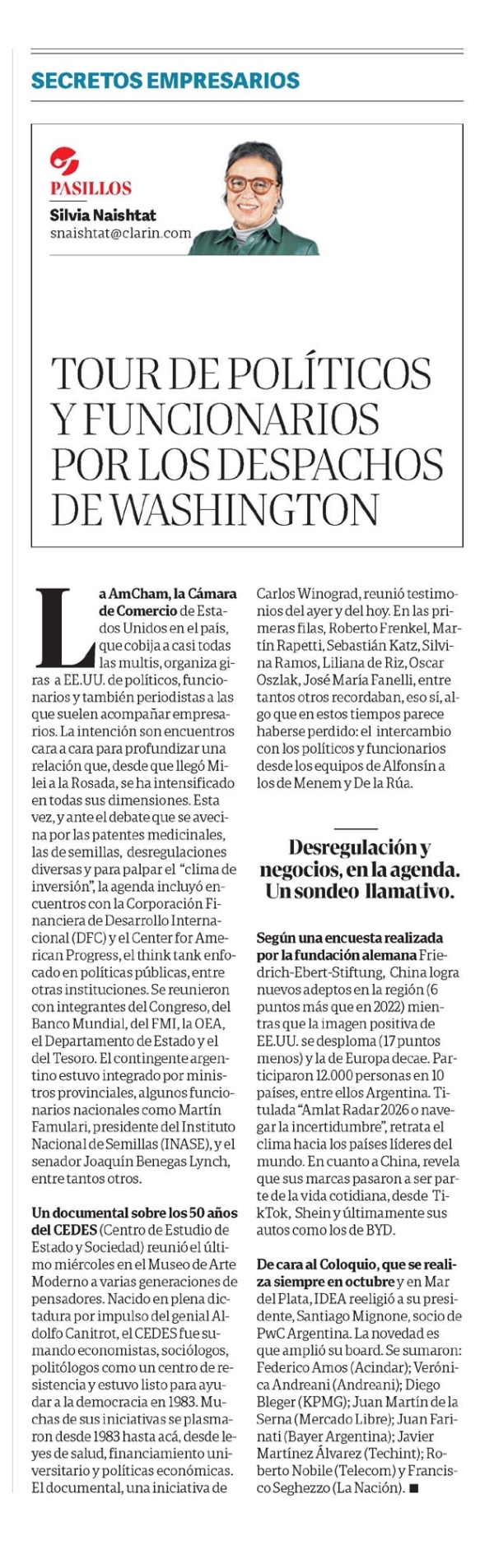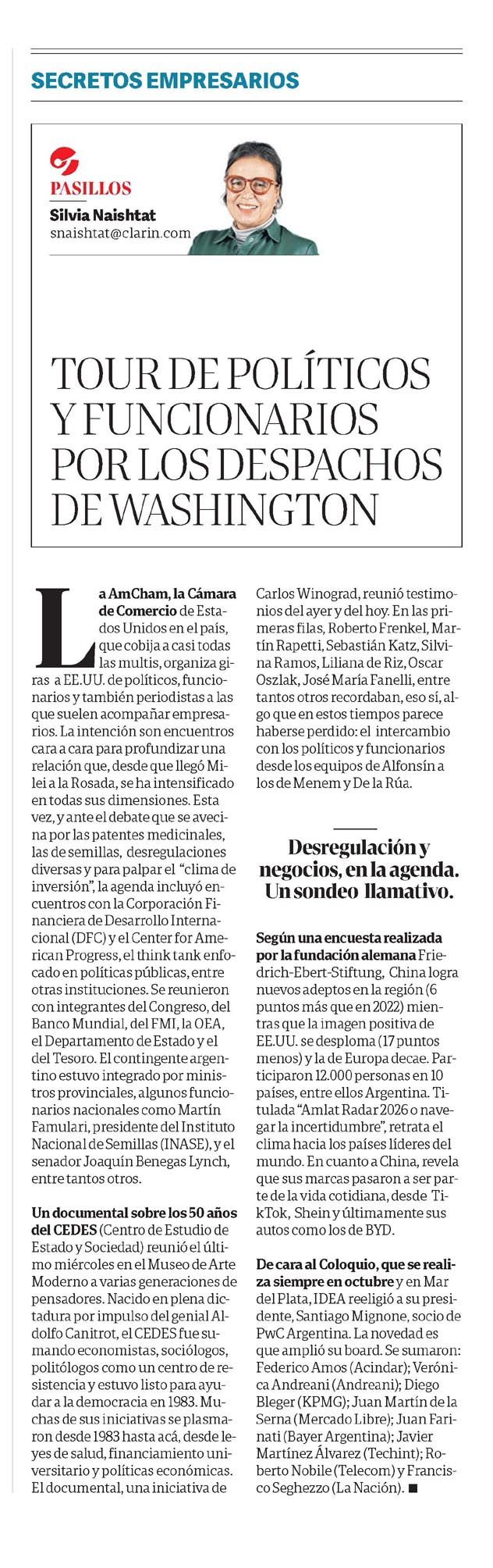 PASILLOS TOUR DE POLÍTICOS Y FUNCIONARIOS POR LOS DESPACHOS DE WASHINGTON Silvia Naishtat La AmCham, la Cámara de Comercio de Estados Unidos en el país, que cobija a casi todas las multis, organiza giras a EE.UU. de políticos, funcionarios y también periodistas a las que suelen acompañar empresarios. La intención son encuentros cara a cara para profundizar una relación que, desde que llegó Milei a la Rosada, se ha intensificado en todas sus dimensiones. Esta vez, y ante el debate que se avecina por las patentes medicinales, las de semillas, desregulaciones diversas y para palpar el "clima de inversión", la agenda incluyó encuentros con la Corporación Financiera de Desarrollo Internacional (DFC) y el Center for American Progress, el think tank enfocado en políticas públicas, entre otras instituciones. Se reunieron con integrantes del Congreso, del Banco Mundial, del FMI, la OEA, el Departamento de Estado y el del Tesoro. El contingente argentino estuvo integrado por ministros provinciales, algunos funcionarios nacionales como Martín Famulari, presidente del Instituto Nacional de Semillas (INASE), y el senador Joaquín Benegas Lynch, entre tantos otros. Un documental sobre los 50 años del CEDES (Centro de Estudio de Estado y Sociedad) reunió el último miércoles en el Museo de Arte Moderno a varias generaciones de pensadores. Nacido en plena dictadura por impulso del genial Aldolfo Canitrot, el CEDES fue sumando economistas, sociólogos, politólogos como un centro de resistencia y estuvo listo para ayudar a la democracia en 1983. Muchas de sus iniciativas se plasmaron desde 1983 hasta acá, desde leyes de salud, financiamiento universitario y políticas económicas. El documental, una iniciativa de Carlos Winograd, reunió testimonios del ayer y del hoy. En las primeras filas, Roberto Frenkel, Martín Rapetti, Sebastián Katz, Silvina Ramos, Liliana de Riz, Oscar Oszlak, José María Fanelli, entre tantos otros recordaban, eso sí, algo que en estos tiempos parece haberse perdido: el intercambio con los políticos y funcionarios desde los equipos de Alfonsín a los de Menem y De la Rúa. Según una encuesta realizada por la fundación alemana Friedrich- Ebert-Stiftung, China logra nuevos adeptos en la región (6 puntos más que en 2022) mientras que la imagen positiva de EE.UU. se desploma (17 puntos menos) y la de Europa decae. Participaron 12.000 personas en 10 países, entre ellos Argentina. Titulada "Amlat Radar 2026 o navegar la incertidumbre", retrata el clima hacia los países líderes del mundo. En cuanto a China, revela que sus marcas pasaron a ser parte de la vida cotidiana, desde TikTok, Shein y últimamente sus autos como los de BYD. De cara al Coloquio, que se realiza siempre en octubre y en Mar del Plata, IDEA reeligió a su presidente, Santiago Mignone, socio de PwC Argentina. La novedad es que amplió su board. Se sumaron: Federico Amos (Acindar); Verónica Andreani (Andreani); Diego Bleger (KPMG); Juan Martín de la Serna (Mercado Libre); Juan Farinati (Bayer Argentina); Javier Martínez Álvarez (Techint); Roberto Nobile (Telecom) y Francisco Seghezzo (La Nación). Desregulación y negocios, en la agenda. Un sondeo llamativo.