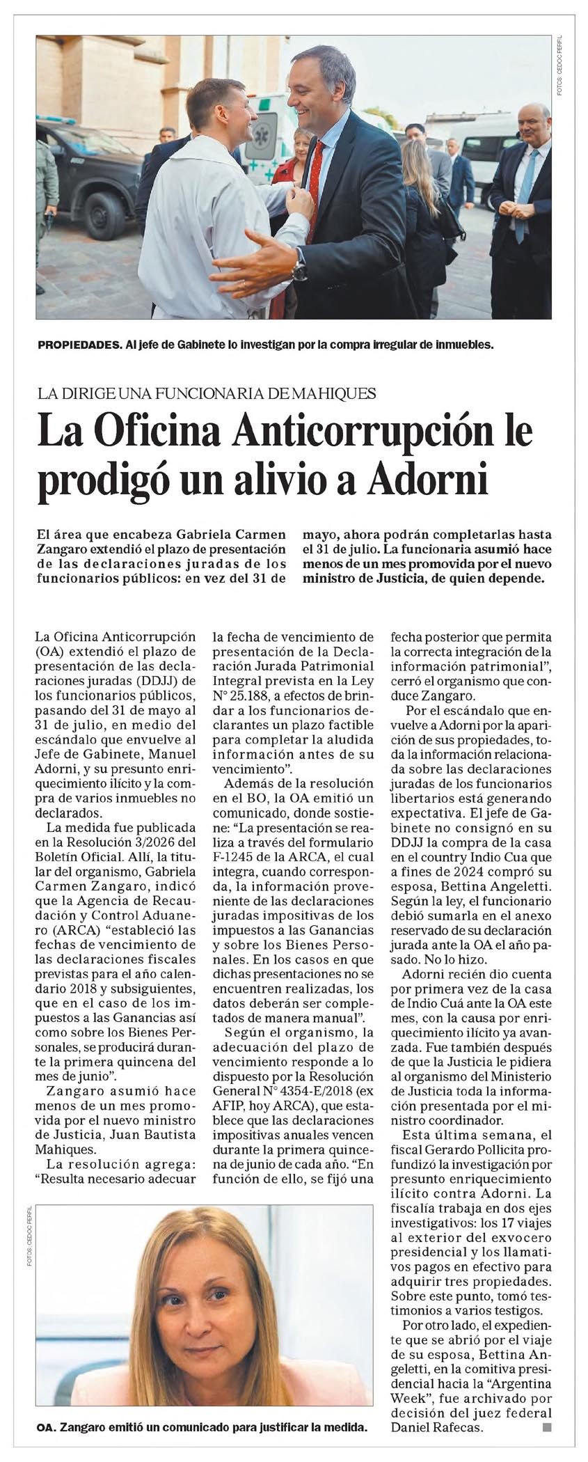 La Oficina Anticorrupción prodigó un alivio a Adorni LA DIRIGE UNA FUNCIONARIA DEMAHIQUES La Oficina Anticorrupción prodigó un alivio a Adorni El área que encabeza Gabriela Carmen Zangaro extendió el plazo de presentación de las declaraciones juradas de los funcionarios públicos: en vez del 31 de mayo, ahora podrán completarlas hasta el 31 de julio. La funcionaria asumió hace menos de un mes promovida por el nuevo ministro de Justicia, de quien depende. La Oficina Anticorrupción (OA) extendió el plazo de presentación de las declaraciones juradas (DDJJ) de los funcionarios públicos, pasando del 31 de mayo al 31 de julio, en medio del escándalo que envuelve al Jefe de Gabinete, Manuel Adorni, y su presunto enriquecimiento ilícito y la compra de varios inmuebles no declarados. La medida fue publicada en la Resolución 3/2026 del Boletín Oficial. Allí, la titular del organismo, Gabriela Carmen Zangaro, indicó que la Agencia de Recaudación y Control Aduanero (ARCA) "estableció las fechas de vencimiento de las declaraciones fiscales previstas para el año calendario 2018 y subsiguientes, que en el caso de los impuestos a las Ganancias así como sobre los Bienes Personales, se producirá durante la primera quincena de junio". Zangaro asumió hace menos de un mes promovida por el nuevo ministro de Justicia, Juan Bautista Mahiques. La resolución agrega: "Resulta necesario adecuar la fecha de vencimiento de presentación de la Declaración Jurada Patrimonial Integral prevista en la Ley N° 25.188, a efectos de brindar a los funcionarios declarantes un plazo factible para completar la aludida información antes de su vencimiento". Además de la resolución en el BO, la OA emitió un comunicado, donde sostiene: "La presentación se realiza a través del formulario F-1245 de la ARCA, el cual integra, cuando corresponda, la información proveniente de las declaraciones juradas impositivas de los impuestos a las Ganancias y sobre los Bienes Personales. En los casos en que dichas presentaciones no se encuentren realizadas, los datos deberán ser completados de manera manual". Según el organismo, la adecuación del plazo de vencimiento responde a lo dispuesto por la Resolución General N° 4354-E/2018 (ex AFIP, hoy ARCA), que establece que las declaraciones impositivas anuales vencen durante la primera quincena de junio de cada año. "En función de ello, se fijó una fecha posterior que permita la correcta integración de la información patrimonial", cerró el organismo que conduce Zangaro. Por el escándalo que envuelve a Adorni por la aparición de sus propiedades, toda la información relacionada sobre las declaraciones juradas de los funcionarios libertarios está generando expectativa. El jefe de Gabinete no consignó en su DDJJ la compra de la casa en el country Indio Cuá que a fines de 2024 compró su esposa, Bettina Angeletti. Según la ley, el funcionario debió sumarla en el anexo reservado de su declaración jurada ante la OA el año pasado. No lo hizo. Adorni recién dio cuenta por primera vez de la casa de Indio Cuá ante la OA este mes, con la causa por enriquecimiento ilícito ya avanzada. Fue también después de que la Justicia le pidiera al organismo del Ministerio de Justicia toda la información presentada por el ministro coordinador. Esta última semana, el fiscal Gerardo Pollicita profundizó la investigación por presunto enriquecimiento ilícito contra Adorni. La fiscalía trabaja en dos ejes investigativos: los 17 viajes al exterior del exvocero presidencial y los llamativos pagos en efectivo para adquirir tres propiedades. Sobre este punto, tomó testimonios a varios testigos. Por otro lado, el expediente que se abrió por el viaje de su esposa, Bettina Angeletti, en la comitiva presidencial hacia la "Argentina Week", fue archivado por decisión del juez federal Daniel Rafecas. Menciones: cpol1