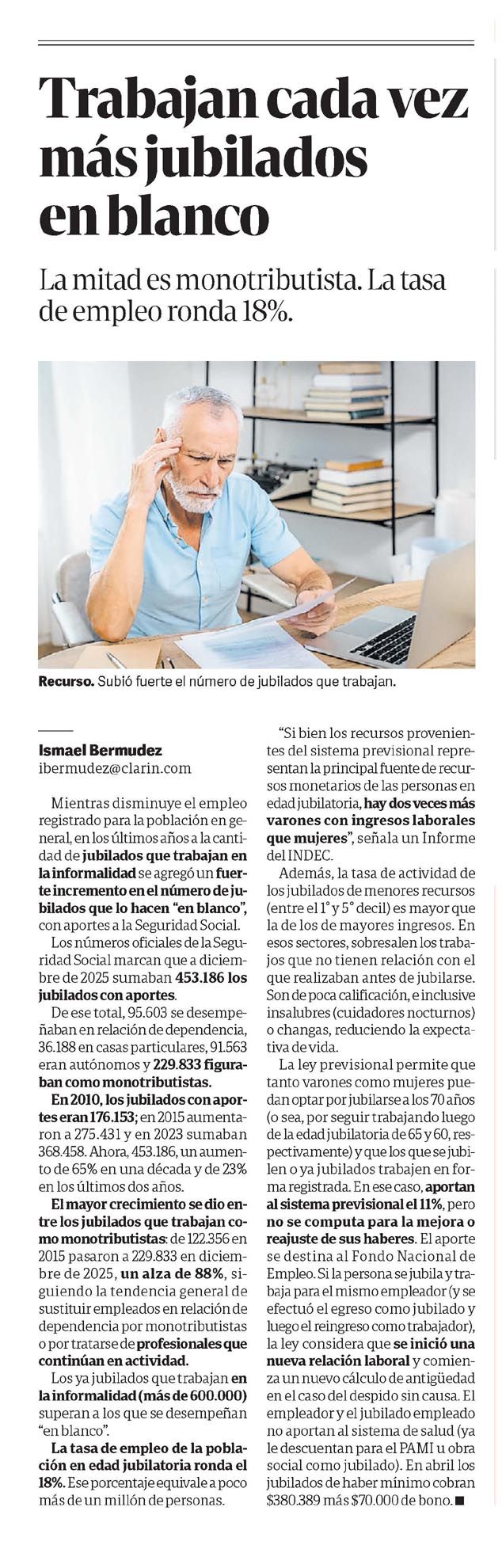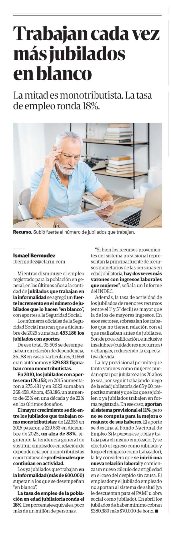 Trabajan cada vez más jubilados en blanco Ismael Bermudez La mitad es monotributista. La tasa de empleo ronda 18%. Recurso. Subió fuerte el número de jubilados que trabajan. Ismael Bermudez ibermudez@clarin.com Mientras disminuye el empleo registrado para la población en general, en los últimos años a la cantidad de jubilados que trabajan en la informalidad se agregó un fuerte incremento en el número de jubilados que lo hacen "en blanco", con aportes a la Seguridad Social. Los números oficiales de la Seguridad Social marcan que a diciembre de 2025 sumaban 453.186 los jubilados con aportes. De ese total, 95.603 se desempeñaban en relación de dependencia, 36.188 en casas particulares, 91.563 eran autónomos y 229.833 figuraban como monotributistas. En 2010, los jubilados con aportes eran 176.153; en 2015 aumentaron a 275.431 y en 2023 sumaban 368.458. Ahora, 453.186, un aumento de 65% en una década y de 23% en los últimos dos años. El mayor crecimiento se dio entre los jubilados que trabajan como monotributistas: de 122.356 en 2015 pasaron a 229.833 en diciembre de 2025, un alza de 88%, siguiendo la tendencia general de sustituir empleados en relación de dependencia por monotributistas o por tratarse de profesionales que continúan en actividad. Los ya jubilados que trabajan en la informalidad (más de 600.000) superan a los que se desempeñan "en blanco". La tasa de empleo de la población en edad jubilatoria ronda el 18%. Ese porcentaje equivale a poco más de un millón de personas. "Si bien los recursos provenientes del sistema previsional representan la principal fuente de recursos monetarios de las personas en edad jubilatoria, hay dos veces más varones con ingresos laborales que mujeres", señala un Informe del INDEC. Además, la tasa de actividad de los jubilados de menores recursos (entre el 1° y 5° decil) es mayor que la de los de mayores ingresos. En esos sectores, sobresalen los trabajos que no tienen relación con lo que realizaban antes de jubilarse. Son de poca calificación, e inclusive insalubres (cuidadores nocturnos) o changas, reduciendo la expectativa de vida. La ley previsional permite que tanto varones como mujeres puedan optar por jubilarse a los 70 años (o sea, por seguir trabajando luego de la edad jubilatoria de 65 y 60, respectivamente) y que los que se jubilen o ya jubilados trabajen en forma registrada. En ese caso, aportan al sistema previsional el 11%, pero no se computa para la mejora o reajuste de sus haberes. El aporte se destina al Fondo Nacional de Empleo. Si la persona se jubila y trabaja para el mismo empleador (y se efectuó el egreso como jubilado y luego el reingreso como trabajador), la ley considera que se inició una nueva relación laboral y comienza un nuevo cálculo de antigüedad en el caso del despido sin causa. El empleador y el jubilado empleado no aportan al sistema de salud (ya le descuentan para el PAMI u obra social como jubilado). En abril los jubilados de haber mínimo cobran $380.389 más $70.000 de bono. Menciones: Ceco1 cfinanE