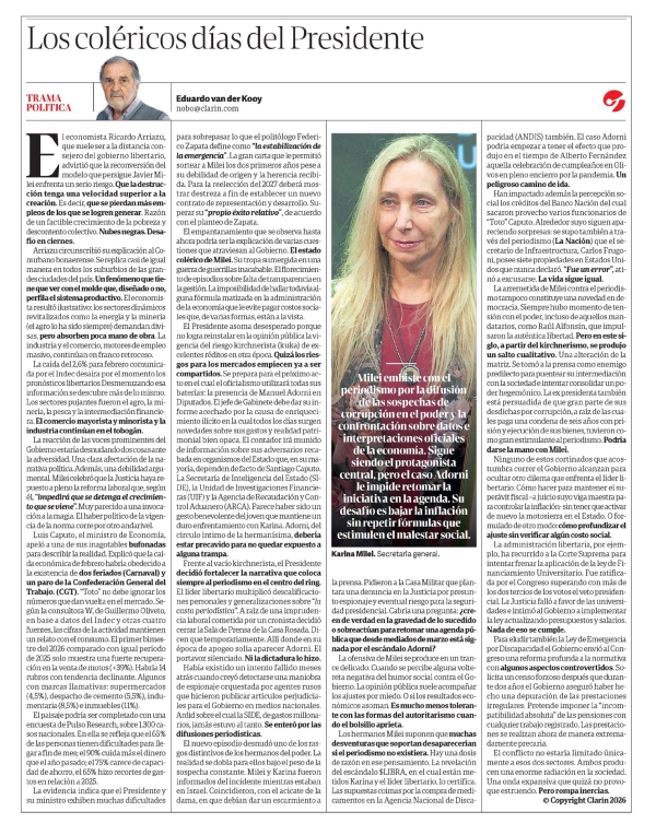 Los coléricos días del Presidente Eduardo van der Kooy El economista Ricardo Arriazu, que suele ser a la distancia consejero del gobierno libertario, advirtió que la reconversión del modelo que persigue Javier Milei enfrenta un serio riesgo. Que la destrucción tenga una velocidad superior a la creación. Es decir, que se pierdan más empleos de los que se logren generar. Razón de un factible crecimiento de la pobreza y descontento colectivo. Nubes negras. Desafío en ciernes. Arriazu circunscribió su explicación al Conurbano bonaerense. Se replica casi de igual manera en todos los suburbios de las grandes ciudades del país. Un fenómeno que tiene que ver con el molde que, diseñado o no, perfila el sistema productivo. El economista resultó ilustrativo: los sectores dinamizados como la energía y la minería (el agro lo ha sido siempre) demandan divisas, pero absorben poca mano de obra. La industria y el comercio, motores de empleo masivo, continúan en franco retroceso. La caída del 2,6% para febrero comunicada por el Indec desaira por el momento lo pronósticos libertarios. Desmenuzando esa información se descubre más de lo mismo. Los sectores pujantes fueron el agro, la minería, la pesca y la intermediación financiera. El comercio mayorista y minorista y la industria continúan en el tobogán. La reacción de las voces prominentes del Gobierno estaría desnudando dos cosas ante la adversidad. Una clara afectación de la narrativa política. Además, una debilidad argumental. Milei celebró que la Justicia haya repuesto a pleno la reforma laboral que, según él, “impedirá que se detenga el crecimiento que se viene”. Muy parecido a una invocación a la magia. El haber político de la vigencia de la norma corre por otro andarivel. Luis Caputo, el ministro de Economía, apeló a una de sus inagotables bufonadas para describir la realidad. Explicó que la caída económica de febrero habría obedecido a la existencia de dos feriados (Carnaval) y un paro de la Confederación General del Trabajo (CGT). “Toto” no debe ignorar los números que dan vuelta en el mercado. Según la consultora W, de Guillermo Oliveto, en base a datos del Indec y otras cuatro fuentes, las cifras de la actividad mantienen un relato con el consumo. El primer bimestre del 2026 comparado con igual período de 2025 solo muestra una fuerte recuperación en la venta de motos (+39%). Habría 14 rubros con tendencia declinante. Algunos con marcas llamativas: supermercados (4,5%), despacho de cemento (5,5%), indumentaria (8,5%) e inmuebles (11%). El paisaje podría ser completado con una encuesta de Pulso Research, sobre 1300 casos nacionales. En ella se refleja que el 65% de las personas tienen dificultades para llegar a fin de mes; el 90% cuida más el dinero que el año pasado; el 75% carece de capacidad de ahorro, el 65% hizo recortes de gastos en relación a 2025. La evidencia indica que el Presidente y su ministro exhiben muchas dificultades para sobrepasar lo que el politólogo Federico Zapata define como “la estabilización de la emergencia”. La gran carta que le permitió sortear a Milei los dos primeros años pese a su debilidad de origen y la herencia recibida. Para la reelección del 2027 deberá mostrar destreza a fin de establecer un nuevo contrato de representación y desarrollo. Superar su “propio éxito relativo”, de acuerdo con el planteo de Zapata. El empantanamiento que se observa hasta ahora podría ser la explicación de varias cuestiones que atraviesan al Gobierno. El estado colérico de Milei. Su tropa sumergida en una guerra de guerrillas inacabable. El florecimiento de episodios sobre falta de transparencia en la gestión. La imposibilidad de hallar todavía alguna fórmula matizada en la administración de la economía que le evite pagar costos sociales que, de varias formas, están a la vista. El Presidente asoma desesperado porque no logra reinstalar en la opinión pública la vigencia del riesgo kirchnerista (kuka) de excelentes réditos en otra época. Quizá los riesgos para los mercados empiecen ya a ser compartidos. Se prepara para el próximo acto en el cual el oficialismo utilizará todas sus baterías: la presencia de Manuel Adorni en Diputados. El jefe de Gabinete debe dar su informe acechado por la causa de enriquecimiento ilícito en la cual todos los días surgen novedades sobre sus gastos y realidad patrimonial bien opaca. El contador irá munido de información sobre sus adversarios recabada en organismos del Estado que, en su mayoría, dependen de facto de Santiago Caputo. La Secretaría de Inteligencia del Estado (SI- DE), la Unidad de Investigaciones Financieras (UIF) y la Agencia de Recaudación y Control Aduanero (ARCA). Parece haber sido un gesto benevolente del joven que mantiene su duro enfrentamiento con Karina. Adorni, del círculo íntimo de la hermanísima, debería estar precavido para no quedar expuesto a alguna trampa. Frente al vacío kirchnerista, el Presidente decidió fortalecer la narrativa que colocó siempre al periodismo en el centro del ring. El líder libertario multiplicó descalificaciones personales y generalizaciones sobre “la casta periodística”. A raíz de una imprudencia laboral cometida por un cronista decidió cerrar la Sala de Prensa de la Casa Rosada. Dicen que temporariamente. Allí donde en su época de apogeo solía aparecer Adorni. El portavoz silenciado. Ni la dictadura lo hizo. Había existido un intento fallido meses atrás cuando creyó detectarse una maniobra de espionaje orquestada por agentes rusos que hicieron publicar artículos perjudiciales para el Gobierno en medios nacionales. Ardid sobre el cual la SIDE, de gastos millonarios, jamás estuvo al tanto. Se enteró por las difusiones periodísticas. El nuevo episodio desnudó uno de los rasgos distintivos de los hermanos del poder. La realidad se dobla para ellos bajo el peso de la sospecha constante. Milei y Karina fueron informados del incidente