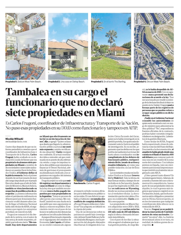 Tambalea en su cargo el funcionario que no declaró siete propiedades en Miami Nicolás Wiñazki Es Carlos Frugoni, coordinador de Infraestructura y Transporte de la Nación. No puso esas propiedades en su DDJJ como funcionario y tampoco en AFIP. Nicolás Wiñazki nwinazki@clarin.com Cuatro días después de que un informe periodístico revelara que el coordinador de Infraestructura y Transporte de la Nación, Carlos Frugoni, había ocultado en su declaración jurada de bienes que era propietario de al menos siete propiedades en Miami a nombre de dos sociedades comerciales radicadas en un paraíso fiscal de los Estados Unidos, el Gobierno define si le pide la renuncia. Sería el primer despido de un funcionario de muy alto rango impulsado por el propio Ejecutivo desde que el jefe de Gabinete de Ministros, Manuel Adorni, también se viera involucrado en sospechas de posibles actos de corrupción. La primera información sobre el patrimonio millonario en dólares que el por el momento funcionario ocultó durante años (antes de llegar al Gobierno Nacional había sido titular de AUSA, el organismo que regula las autopistas porteñas), se conoció en A24. Frugoni se comunicó el día después de la noticia con el autor de esta nota y, de modo sorpresivo, admitió que todo era cierto: "Me confundí. Hay siete departamentos en Miami que efectivamente no incluí en mi declaración de bienes", dijo, y agregó: "Quiero aclarar que desde que llegué a la administración pública nacional me sentí más expuesto y estaba rectificando esa situación". Clarín consignó esa confesión. El actual coordinador daba a entender así que continuaría en su puesto, dada la relevancia: estaba a cargo de impulsar toda la obra pública que empezaba a financiar el Tesoro Nacional, además de gestionar el presupuesto multimillonario dedicado a los organismos encargados del sistema de transporte público. Frugoni aceptó no solo que omitió registrar sus departamentos y casas en Miami tal como lo obliga la ley, sino que también reconoció que nunca había pagado impuestos por esas propiedades en la Argentina. "Estoy en proceso de adecuarme a las normas. Me confundí", insistió en una charla en la que pidió que esos argumentos se dieran a conocer en público. El escándalo creció con el paso de las horas y se radicaron dos denuncias penales en los tribunales federales. Aunque el funcionario dependía en el organigrama del ministro de Economía, Luis Caputo, el Gobierno no emitió comunicado alguno Funcionario. Carlos Frugoni. al respecto ni hubo voceros oficiales que lo defendieran en público o en las redes. El caso Adorni ya agobiaba al Gabinete y se sumaba otro conflicto de compleja definición. ¿Por qué Frugoni debía irse y Adorni no? Esa pregunta se debatió en la cúpula del poder. Una de las denuncias sobre su patrimonio quedó bajo investigación del juez Daniel Rafecas y la fiscal Alejandra Mangano, tras la presentación del abogado Alejandro Díaz Pascual. El dirigente de la Coalición Cívica Facundo del Gaiso, quien ya lo había investigado en la gestión porteña, fue quien más documentó ante la Justicia el pedido de investigación. En su escrito, argumenta que los delitos en los que podría encuadrarse el accionar de hasta ahora coordinador son incumplimiento de los deberes de funcionario público, enriquecimiento ilícito, lavado de activos y evasión tributaria, así como una posible violación a la Ley de Ética Pública. Las sociedades creadas en los Estados Unidos se llaman Genova LLC y Waki LLC. Solo la última de esas firmas estaba a tiempo de ser incluida en la Declaración Jurada, ya que fue registrada en 2025. Ambas se radicaron en Wyoming, donde las normas permiten ocultar al verdadero titular. La documentación que los vinculaba a Frugoni era indubitable. Clarín accedió a esos papeles. Las propiedades en Miami fueron adquiridas entre 2020 y 2022, con valores que oscilan entre los 130 mil y más de 250 mil dólares, según la oferta y demanda del mercado inmobiliario. Con el paso de los días la situación se agravó al saberse que la actual gestión porteña, de Jorge Macri, ya lo había despedido de AUSA en marzo de 2025. Con un agravante: nunca presentó sus declaraciones de acuerdo a la ley. Tras ser sancionado por evadir la entrega de la declaración final al dejar su puesto en la Ciudad, Frugoni pasó a formar parte de los registros de personas que no pueden volver a ocupar cargos públicos en dicho distrito. ¿Nadie en el Gobierno Nacional consultó los antecedentes de quien sería nombrado casi con rango de ministro para administrar la obra pública? "No", respondieron fuentes oficiales; de lo contrario, podrían haber cometido irregularidades en su designación. Laberintos de la gestión libertaria. Como titular de AUSA, Frugoni había supervisado obras de relevancia como las del Paseo del Bajo. De acuerdo a la documentación, el arquitecto había girado desde una cuenta en el Bank of America 400 mil dólares para comprar parte de una casa en un country de la zona norte del conurbano. Con trabajos previos en España, tuvo un crecimiento patrimonial impresionante que invirtió en el exterior sin registrarlo ante ARCA. ¿Cómo generó tanto dinero? Es un interrogante básico. Además, de acuerdo a fuentes del caso y documentación respaldatoria, buena parte de sus propiedades están en alquiler, lo cual le genera más ingresos que tampoco registró en su Declaración Jurada, que los funcionarios están obligados a presentar ante la Oficina Anticorrupción, ni en los documentos que cualquier contribuyente debe ofrecer en la ventanilla de ARCA. Si se va, Frugoni ya no podrá liderar la renovación de 9 mil kilómetros de rutas nacionales. Cometió "un error", dijo. La Justicia determinará ahora si se trata, en realidad, de delitos graves de corrupción. Menciones: cpol1