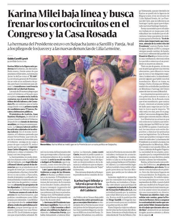 Karina Milei baja línea y busca frenar los cortocircuitos en el Congreso y la Casa Rosada Guido Carelli Lynch La hermana del Presidente estuvo en Suipacha junto a Santilli y Pareja. Aval a los pliegos de los jueces y a las nuevas denuncias de Lilia Lemoine. Karina Milei es la figura más poderosa del Gobierno, sin discusión. Nada nuevo. Desde antes de que asumiera el Ejecutivo, su hermano Javier la define como el "El Jefe". La secretaria general de Presidencia no cede ni un milímetro de poder, pero hace concesiones para alinear la tumultuosa convivencia dentro de La Libertad Avanza. Los más de 20 nuevos pliegos que envió el Gobierno al Senado para completar vacantes en la Justicia contaron con el aval de todas las tribus del oficialismo y de Comodoro Py, un universo que se había ninguneado con la primera tanda de candidatos para 77 jueces, fiscales y defensores públicos. El ministros de Justicia, Juan Bautista Mahiques, le ofrendó el primer triunfo judicial al Gobierno después de un cúmulo de derrotas sensibles con impacto presupuestario. La Cámara laboral ratificó los artículos objetados de la reforma laboral. En el mismo movimiento, el Gobierno pretende que el juez Víctor Pesino -que votó a favor de la sentencia favorable para el Gobierno- prosiga en su cargo a pesar de que cumplió 75, mejor suerte que la que tuvo el supremo Juan Carlos Maqueda, obligado a jubilarse y a dejar al máximo Tribunal con tres integrantes. La hermanísima no pudo silenciar los chismes sobre la salida del jefe de Gabinete, pero logró blindar a Manuel Adorni a pesar de las denuncias que se acumularon en el juzgado de Ariel Ljio. Los ministros acompañarán a Karina y Javier Milei en su excursión a Diputados, donde el ministro coordinador intentará brindar el miércoles su primer informe de gestión y contestar con altanería las preguntas de los diputados. Con los periodistas no le fue bien; en Twitter tampoco. Karina no asume el costo de los errores de sus funcionarios, que podrían considerarse como fallas propias por extensión. Casa Militar -que depende de ella- ordenó dejar afuera a todos los periodistas acreditados, porque investiga un supuesto espionaje tras una filmación de TN. En el Gabinete no ignoran que el periodista señalado filmó con la venia de funcionarios del área que responden a Karina y que se desentendieron de la medida cuando la noticia escaló en redes e indignó al Presidente, que lo ignoraba, como otros detalles que transcurren en su administración. Luis Caputo objeta la política del Gobierno a cargo de los Menem, alfiles de Karina. Los Milei contestan, a su manera. El Presidente no le dedicó ni un "me gusta" a las gestiones del ministro de Economía en los Estados Unidos, adonde viajó para conseguir la garantía del Banco Mundial y el BID para nuevos préstamos de bancos privados. Tiempo tuvo. El Presidente promedió más de 3 horas de promedio en X por día durante abril. La hermana del Presidente también hace equilibrio. Hace ocho días, mandó a Lilia Lemoine a disciplinar a la militancia digital que objetaba a Sebastián Pareja, que había demandado a tuiteros libertarios. La diputada, como contó Clarín, levantó el perfil cuando insultaron a la titular de LLA en el streaming Carajo!. Cerca del diputado se desentendieron de la denuncia y señalaron que no dependía de ellos la alternativa de "bajar" la demanda. Una semana después, la flamante presidenta de la comisión de Juicio Político de la Cámara Baja pidió información sobre presuntos pagos a concejales libertarios en municipios de la Provincia para votar iniciativas de los bloques peronistas. Esos nombres llegaron a las listas en 2023 con el aval de Pareja. Dirigentes oficialistas con ambiciones en la Provincia reconocen dificultades y rechazan las acusaciones públicas. "Abajo es un cambaleche y a Lilia no se le puede decir nada, porque habla por el Presidente"; dijeron. La controvertida legisladora también desacreditó al biógrafo presidencial Nicolás Márquez, que pedía por la cabeza de Adorni. Lemoine explicitó su sospecha por los concejales en la víspera de que Karina se trasladara a Suipacha -este sábado- para participar de la segunda jornada de la Escuela de Formación Política de LLA, una actividad lanzada por la máxima autoridad libertaria en la provincia. Karina avaló la participación de Diego Santilli, el dirigente mejor posicionado para ser candidato a la gobernación en 2027. Hasta Suipacha viajaron referentes de todas las facciones del oficialismo. Estuvieron el bullrichista ex intendente de Tres de Febrero, Diego Valenzuela, que por decisión de Karina se quedó sin la Agencia de Migraciones; el ex secretario de Culto Nahuel Sotelo, de Las Fuerzas del Cielo, que se referencia en Santiago Caputo; igual que el diputado nacional Santiago Santurio. Pareja transmitió que el oficialismo trabaja en un mapa para individualizar las ciudades que el oficialismo tiene que pintar de violeta para ganar la Provincia. "Es el objetivo más importante que tenemos, además de la reelección del Presidente", sostuvo Pareja. Santilli sigue afiliado al PRO y, aunque siempre puede cambiar de bando, es el único referente del partido de Mauricio Macri que tiene aval para una confluencia electoral entre los partidos mientras el ex presidente se mueve en silencio. "Está en pie de guerra, el círculo rojo le pide que genere una tercera alternativa, pero Mauricio teme que la rosca y los dirigentes negocien y lo dejen solo y lo abandonen", precisó alguien que habló con el ex mandatario. Macri se toma su tiempo. Parte a Europa por 18 días, tendrá dos actividades partidarias en Mendoza y Santiago del Estero antes de irse un mes al Mundial. Los empresarios quieren que varios gobernadores se sumen a la construcción. En la Rosada creen que el ex mandatario, que camina el país, intentará acumular poder de daño para negociar por la Ciudad, lo único que le importa. "El odio está y es real, 