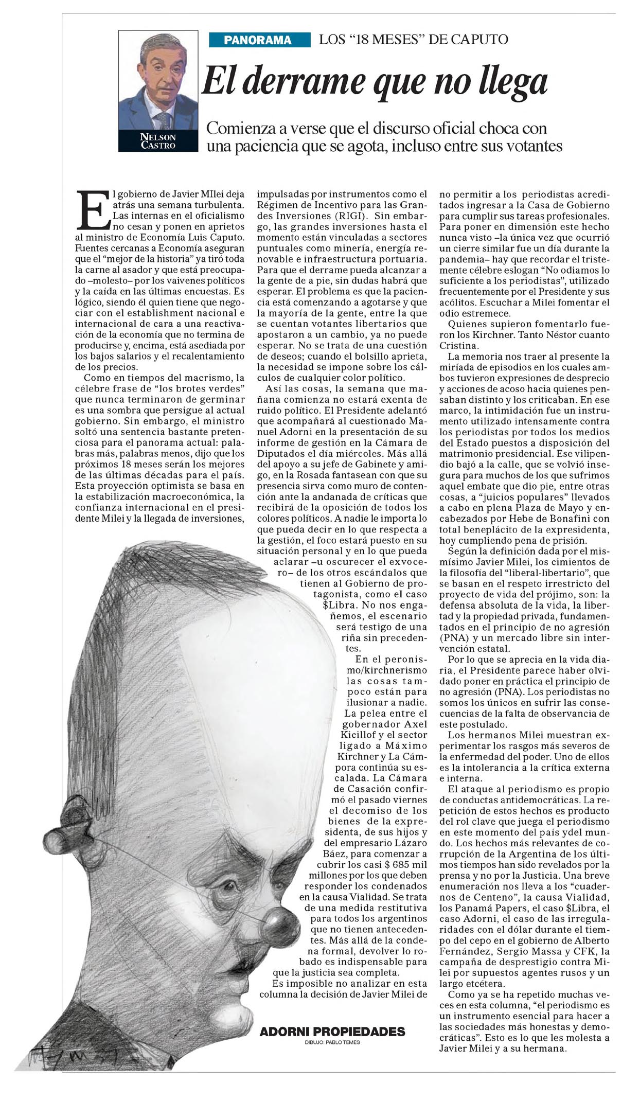 El derrame que no llega NELSON CASTRO Comienza a verse que el discurso oficial choca con una paciencia que se agota, incluso entre sus votantes El gobierno de Javier Milei deja atrás una semana turbulenta. Las internas en el oficialismo no cesan y ponen en aprieto al ministro de Economía Luis Caputo. Fuentes cercanas a Economía aseguran que el “mejor de la historia” ya tiró toda la carne al asador y que está preocupado –molesto– por los vaivenes políticos y la caída en las últimas encuestas. Es lógico, siendo él quien tiene que negociar con el establishment nacional e internacional de cara a una reactivación de la economía que no termina de producirse y, encima, está asediada por los bajos salarios y el recalentamiento de los precios. Como en tiempos del macrismo, la célebre frase de “los brotes verdes” que nunca terminaron de germinar es una sombra que persigue al actual gobierno. Sin embargo, el ministro soltó una sentencia bastante pretenciosa para el panorama actual: palabras más, palabras menos, dijo que los próximos 18 meses serán los mejores de las últimas décadas para el país. Esta proyección optimista se basa en la estabilización macroeconómica, la confianza internacional en el presidente Milei y la llegada de inversiones, impulsadas por instrumentos como el Régimen de Incentivo para las Grandes Inversiones (RIGI). Sin embargo, las grandes inversiones hasta el momento están vinculadas a sectores puntuales como minería, energía renovable e infraestructura portuaria. Para que el derrame pueda alcanzar a la gente de a pie, sin dudas habrá que esperar. El problema es que la paciencia está comenzando a agotarse y que la mayoría de la gente, entre la que se cuentan votantes libertarios que apostaron a un cambio, ya no puede esperar. No se trata de una cuestión de deseos; cuando el bolsillo aprieta, la necesidad se impone sobre los cálculos de cualquier color político. Así las cosas, la semana que mañana comienza no estará exenta de ruido político. El Presidente adelantó que acompañará al cuestionado Manuel Adorni en la presentación de su informe de gestión en la Cámara de Diputados el día miércoles. Más allá del apoyo a su jefe de Gabinete y amigo, en la Rosada fantasean con que su presencia sirva como muro de contención ante la andanada de críticas que recibirá de la oposición de todos los colores políticos. A nadie le importa lo que pueda decir en lo que respecta a la gestión, el foco estará puesto en su situación personal y en lo que pueda aclarar –u oscurecer el exvocero– de los otros escándalos que tienen al Gobierno de protagonista, como el caso $Libra. No nos engañemos, el escenario será testigo de una riña sin precedentes. En el peronismo/kirchnerismo las cosas tampoco están para ilusionar a nadie. La pelea entre el gobernador Axel Kicillof y el sector ligado a Máximo Kirchner y La Cámpora continúa su escalada. La Cámara de Casación confirmó el pasado viernes el decomiso de los bienes de la expresidenta, de sus hijos y del empresario Lázaro Báez, para comenzar a cubrir los casi $ 685 millones por los que deben responder los condenados en la causa Vialidad. Se trata de una medida restitutiva para todos los argentinos que no tienen antecedentes. Más allá de la condena formal, devolver lo robado es indispensable para que la justicia sea completa. Es imposible no analizar en esta columna la decisión de Javier Milei de no permitir a los periodistas acreditados ingresar a la Casa de Gobierno para cumplir sus tareas profesionales. Para poner en dimensión este hecho nunca visto –la única vez que ocurrió un cierre similar fue un día durante la pandemia– hay que recordar el tristemente célebre eslogan “No odiamos lo suficiente a los periodistas”, utilizado frecuentemente por el Presidente y sus acólitos. Escuchar a Milei fomentar el odio estremece. Quienes supieron fomentarlo fueron los Kirchner. Tanto Néstor cuanto Cristina. La memoria nos trae al presente la miríada de episodios en los cuales ambos tuvieron expresiones de desprecio y acciones de acoso hacia quienes pensaban distinto y los criticaban. En ese marco, la intimidación fue un instrumento utilizado intensamente contra los periodistas por todos los medios del Estado puestos a disposición del patrimonio presidencial. Ese vilipendio bajó a la calle, que se volvió insegura para muchos de los que sufrimos aquel embate que dio pie, entre otras cosas, a “juicios populares” llevados a cabo en plena Plaza de Mayo y encabezados por Hebe de Bonafini con total beneplácito de la expresidenta, hoy cumpliendo pena de prisión. Según la definición dada por el mismísimo Javier Milei, los cimientos de la filosofía del “liberal-libertario”, que se basan en el respeto irrestricto del proyecto de vida del prójimo, son: la defensa absoluta de la vida, la libertad y la propiedad privada, fundamentados en el principio de no agresión (PNA) y un mercado libre sin intervención estatal. Por lo que se aprecia en la vida diaria, el Presidente parece haber olvidado poner en práctica el principio de no agresión (PNA). Los periodistas no somos los únicos en sufrir las consecuencias de la falta de observancia de este postulado. Los hermanos Milei muestran experimentar los rasgos más severos de la enfermedad del poder. Uno de ellos es la intolerancia a la crítica externa e interna. El ataque al periodismo es propio de conductas antidemocráticas. La repetición de estos hechos es producto del rol clave que juega el periodismo en este momento del país ydel mundo. Los hechos más relevantes de corrupción de la Argentina de los últimos tiempos han sido revelados por la prensa y no por la Justicia. Una breve enumeración nos lleva a los “cuadernos de Centeno”, la causa Vialidad, los Panamá Papers, el caso $Libra, el caso Adorni, el caso de las irregularidades con el dólar durante el tiempo del cepo en el gobierno de Alberto Fer
