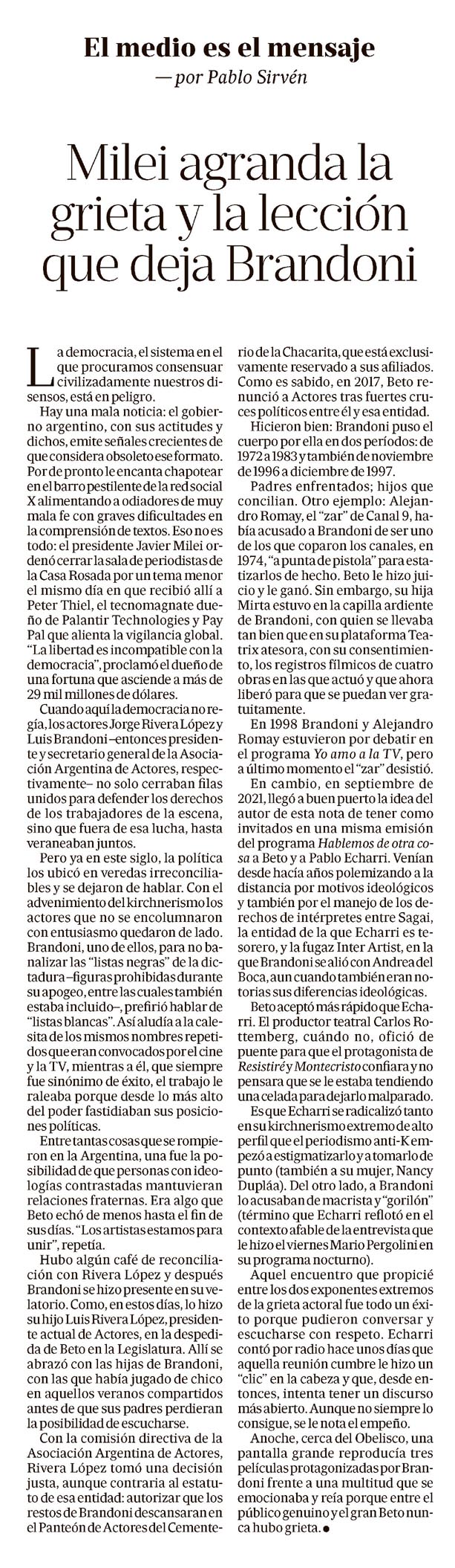 Milei agranda la grieta y la lección que deja Brandoni Pablo Sirvén El medio es el mensaje — por Pablo Sirvén Milei agranda la grieta y la lección que deja Brandoni A democracia, el sistema en el que procuramos consensuar civilizadamente nuestros disensos, está en peligro. Hay una mala noticia: el gobierno argentino, con sus actitudes y dichos, emite señales crecientes de que considera obsoleto ese formato. Pordeprontoleencanta chapotear en el barro pestilentedela red social Xalimentando a odiadores de muy mala fe con graves dificultades en la comprensión de textos. Esonoes todo: el presidente Javier Milei ordenó cerrar la sala de periodistas de la Casa Rosada por un tema menor el mismo día en que recibió allí a Peter Thiel, el tecnomagnate dueño de Palantir Technologies y Pay Pal que alienta la vigilancia global. “La libertad es incompatible con la democracia”, proclamó el dueño de una fortuna que asciende a más de 29 mil millones de dólares. Cuando aquí la democracia no regía, los actores Jorge Rivera López y Luis Brandoni –entonces presidente y secretario general de la Asociación Argentina de Actores, respectivamente– no solo cerraban filas unidos para defender los derechos de los trabajadores de la escena, sino que fuera de esa lucha, hasta veraneaban juntos. Pero ya en este siglo, la política os ubicó en veredas irreconciliables y se dejaron de hablar. Con el advenimiento del kirchnerismolos actores que no se encolumnaron con entusiasmo quedaron de lado. Brandoni, uno de ellos, para no banalizar las “listas negras” de la dictadura –figuras prohibidas durante su apogeo, entre las cuales también estaba incluido–, prefirió hablar de “listas blancas”. Así aludía a la calesita de los mismos nombres repetidos que eran convocados por el cine y la TV, mientras a él, que siempre fue sinónimo de éxito, el trabajo lo aleaba porque desde lo más alto del poder fastidiaban sus posiciones políticas. Entretantas cosas que se rompieron en la Argentina, una fue la posibilidad de que personas con ideologías contrastadas mantuvieran relaciones fraternas. Era algo que Beto echó de menos hasta el fin de sus días. “Los artistas estamos para unir”, repetía. Hubo algún café de reconciliación con Rivera López y después Brandoni se hizo presente en su velatorio. Como, en estos días, lo hizo su hijo Luis Rivera López, presidente actual de Actores, en la despedida de Beto en la Legislatura. Allí se abrazó con las hijas de Brandoni, con las que había jugado de chico en aquellos veranos compartidos antes de que sus padres perdieran la posibilidad de escucharse. Con la comisión directiva de la Asociación Argentina de Actores, Rivera López tomó una decisión justa, aunque contraria al estatuto de esa entidad: autorizar que los restos de Brandoni descansaran en el Panteón de Actores del Cementerio de la Chacarita, que está exclusivamente reservado a sus afiliados. Como es sabido, en 2017, Beto renunció a Actores tras fuertes cruces políticos entre él y esa entidad. Hicieron bien: Brandoni puso el cuerpo por ella en dos períodos: de 1972 a 1983 y también de noviembre de 1996 a diciembre de 1997. Padres enfrentados; hijos que concilian. Otro ejemplo: Alejandro Romay, el “zar” de Canal 9, había acusado a Brandoni de ser uno de los que coparon los canales, en 1974, “a punta de pistola” para estatizarlos de hecho. Beto le hizo juicio y le ganó. Sin embargo, su hija Mirta estuvo en la capilla ardiente de Brandoni, con quien se llevaba tan bien que en su plataforma Teatrix atesora, con su consentimiento, los registros fílmicos de cuatro obras en las que actuó y que ahora liberó para que se puedan ver gratuitamente. En 1998 Brandoni y Alejandro Romay estuvieron por debatir en el programa Yo amo a la TV, pero en último momento el “zar” desistió. En cambio, en septiembre de 2021, llegó a buen puerto la idea de utor de esta nota de tener como invitados en una misma emisión del programa Hablemos de otra cosa a Beto y a Pablo Echarri. Venían desde hacía años polemizando a distancia por motivos ideológicos y también por el manejo de los derechos de intérpretes entre Sagai, la entidad de la que Echarri es tesorero, y la fugaz Inter Artist, en la que Brandonisealió con Andrea del Boca, aun cuando también eran notorias sus diferencias ideológicas. Beto aceptó más rápido que Echarri. El productor teatral Carlos Rottemberg, cuándo no, ofició de puente para que el protagonista de Resistiré y Montecristo confiara y no pensara que se le estaba tendiendo una celada para dejarlo malparado. Es que Echarri se radicalizó tanto en su kirchnerismo extremo de alto perfil que el periodismo anti-Kempezó a estigmatizarlo y a tomarlo de punto (también a su mujer, Nancy Dupláa). Del otro lado, a Brandonilo acusaban de macrista y “gorilón” (término que Echarri reflotó en el contexto afable de la entrevista que le hizo el viernes Mario Pergolini en su programa nocturno). Aquel encuentro que propicié entre los dos exponentes extremos de la grieta actoral fue todo un éxito porque pudieron conversar y escucharse con respeto. Echarri contó por radio hace unos días que aquella reunión cumbre le hizo un “clic” en la cabeza y que, desde entonces, intenta tener un discurso más abierto. Aunque no siempre lo consigue, se le nota el empeño. Anoche, cerca del Obelisco, una pantalla grande reproducía tres películas protagonizadas por Brandoni frente a una multitud que se emocionaba y reía porque entre el público genuino y el gran Beto nunca hubo grieta. Menciones: Milei, Argentina, Pablo Sirvén, Jorge Rivera López, Luis Brandoni, Beto, Peter Thiel, Palantir Technologies, Pay Pal, Alejandro Romay, Canal 9, Mirta Estiv, Teatrix, Yo amo a la TV, Hablemos de otra cosa, Pablo Echarri, Sagai, Inter Artist, Andrea del Boca, Carlos Rottemberg, Resistiré, Montecristo, Nancy Dupláa, Mario Pergolini