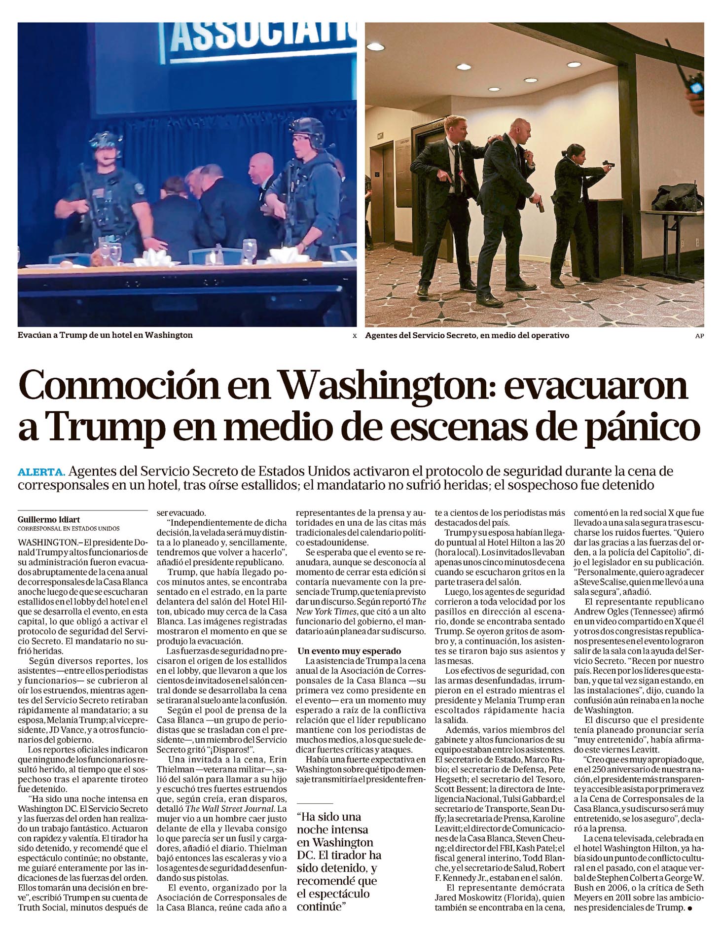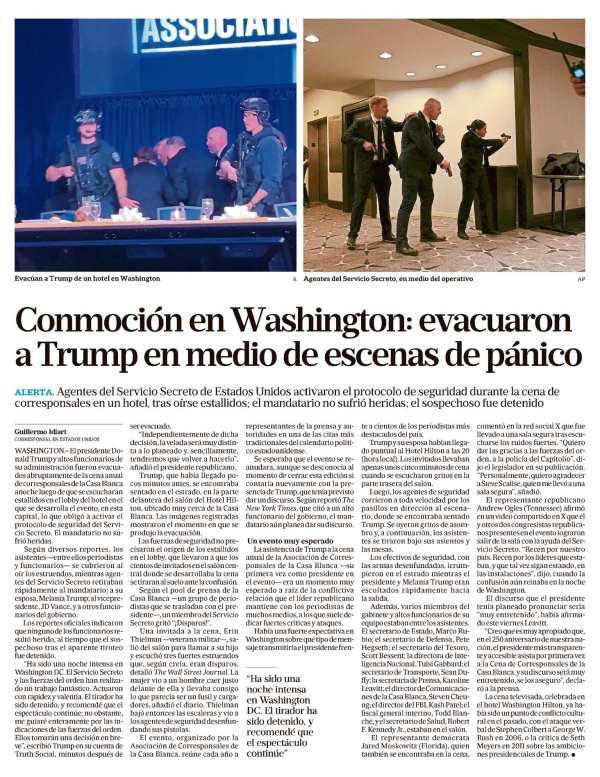 Conmoción en Washington: evacuaron a Trump en medio de escenas de pánico Guillermo Idiart ALERTA. Agentes del Servicio Secreto de Estados Unidos activaron el protocolo de seguridad durante la cena de corresponsales en un hotel, tras oírse estallidos; el mandatario no sufrió heridas; el sospechoso fue detenido Guillermo Idiart CORRESPONSAL EN ESTADOS UNIDOS WASHINGTON.-El presidente Donald Trump y altos funcionarios de su administración fueron evacuados abruptamente de la cena anual de corresponsales de la Casa Blanca la noche luego de que se escucharan estallidos en el lobby del hotel en el que se desarrolla el evento, en esta capital, lo que obligó a activar el protocolo de seguridad del Servicio Secreto. El mandatario no sufrió heridas. Según diversos reportes, los asistentes -entre ellos periodistas y funcionarios- se cubrieron al oír los estruendos, mientras agentes del Servicio Secreto retiraban rápidamente al mandatario; a su esposa, Melania Trump; al vicepresidente, JD Vance, y a otros funcionarios del gobierno. Los reportes oficiales indicaron que ninguno de los funcionarios resultó herido, al tiempo que el sospechoso tras el aparente tiroteo fue detenido. "Ha sido una noche intensa en Washington DC. El Servicio Secreto y las fuerzas del orden han realizado un trabajo fantástico. Actuaron con rapidez y valentía. El tirador ha sido detenido, y recomendé que el espectáculo continúe; no obstante, me guiaré enteramente por las indicaciones de las fuerzas del orden. Ellos tomarán una decisión en breve", escribió Trump en su cuenta de Truth Social, minutos después de ser evacuado. "Independientemente de dicha decisión, la velada será muy distinta a lo planeado y, sencillamente, tendremos que volver a hacerlo", añadió el presidente republicano. Trump, que había llegado pocos minutos antes, se encontraba sentado en el estrado, en la parte delantera del salón del Hotel Hilton, ubicado muy cerca de la Casa Blanca. Las imágenes registradas mostraron el momento en que se produjo la evacuación. Las fuerzas de seguridad no precisaron el origen de los estallidos en el lobby, que llevaron a que los cientos de invitados en el salón central donde se desarrollaba la cena se tiraran al suelo ante la confusión. Según el pool de prensa de la Casa Blanca -un grupo de periodistas que se trasladan con el presidente-, un miembro del Servicio Secreto gritó "¡Disparos!". Una invitada a la cena, Erin Thielman -veterana militar-, salió del salón para llamar a su hijo y escuchó tres fuertes estruendos que, según creía, eran disparos, detalló The Wall Street Journal. La mujer vio a un hombre caer justo delante de ella y llevaba consigo lo que parecía ser un fusil y cargadores, añadió el diario. Thielman bajó entonces las escaleras y vio a los agentes de seguridad desenfundando sus pistolas. El evento, organizado por la Asociación de Corresponsales de la Casa Blanca, reúne cada año a representantes de la prensa y autoridades en una de las citas más tradicionales del calendario político estadounidense. Se esperaba que el evento se reanudara, aunque se desconocía al momento de cerrar esta edición si contaría nuevamente con la presencia de Trump, que tenía previsto dar su discurso. Según reportó The New York Times, que citó a un alto funcionario del gobierno, el mandatario aún planea dar su discurso. Un evento muy esperado La asistencia de Trump a la cena anual de la Asociación de Corresponsales de la Casa Blanca -primera vez como presidente- era un momento muy esperado a raíz de la conflictiva relación que el líder republicano mantiene con los periodistas de muchos medios, a los que suele dedicar fuertes críticas y ataques. Había una fuerte expectativa en Washington sobre qué tipo de mensaje transmitiría el presidente frente a cientos de los periodistas más destacados del país. "Trump y su esposa habían llegado puntual al Hotel Hilton a las 20 (hora local). Los invitados llevaban apenas unos cinco minutos de cena cuando se escucharon gritos en la parte trasera del salón. Luego, los agentes de seguridad corrieron a toda velocidad por los pasillos en dirección al escenario, donde se encontraba sentado Trump. Se oyeron gritos de asombro y, a continuación, los asistentes se tiraron bajo sus asientos y las mesas. Los efectivos de seguridad, con las armas desenfundadas, irrumpieron en el estrado mientras el presidente y Melania Trump eran escoltados rápidamente hacia la salida. Además, varios miembros del gabinete y altos funcionarios de su equipo estaban entre los asistentes. El secretario de Estado, Marco Rubio; el secretario de Defensa, Pete Hegseth; el secretario del Tesoro, Scott Bessent; la directora de Inteligencia Nacional, Tulsi Gabbard; el secretario de Transporte, Sean Duffy; la secretaria de Prensa, Karoline Leavitt; el director de Comunicaciones de la Casa Blanca, Steven Cheung; el director del FBI, Kash Patel; el fiscal general interino, Todd Blanche, y el secretario de Salud, Robert F. Kennedy Jr., estaban en el salón. El representante demócrata Jared Moskowitz (Florida), quien también se encontraba en la cena, comentó en la red social X que fue llevado a una sala segura tras escucharse los ruidos fuertes. "Quiero dar las gracias a las fuerzas del orden, a la policía del Capitolio", dijo el legislador en su publicación. "Personalmente, quiero agradecer a Steve Scalise, quien me llevó a una sala segura", añadió. El representante republicano Andrew Ogles (Tennessee) afirmó en un video compartido en X que él y otros dos congresistas republicanos presentes en el evento lograron salir de la sala con la ayuda del Servicio Secreto. "Recen por nuestro país. Recen por los líderes que estaban, y que tal vez sigan estando, en las instalaciones", dijo, cuando la confusión aún reinaba en la noche de Washington. El discurso que el presidente tenía planeado pronunciar sería "muy entretenido", había afirmado este viernes Leavitt. "