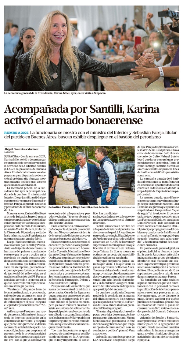 Acompañada por Santilli, Karina Milei activó el armado bonaerense Abigail Contreiras Martínez RUMBO A 2027. La funcionaria se mostró con el ministro del Interior y Sebastián Pareja, titular del partido en Buenos Aires; buscan exhibir despliegue en el bastión del peronismo SUIPACHA.- Con la mira en 2027, Karina Milei volvió a desembarcar en un municipio peronista y reavivó la actividad de La Libertad Avanza (LLA) en la provincia de Buenos Aires. En el oficialismo nacional se preparan para disputar la gobernación el próximo año y buscan mostrar músculo político en el distrito que comanda Axel Kicillof. La secretaria general de la Presidencia fue ayer la principal oradora de la cumbre. El ministro del Interior, Diego Santilli, arribó al encuentro solo y se mostró junto a Sebastián Pareja, diputado nacional y presidente de la filial bonaerense de LLA. Minutos antes, Karina Milei llegó al acto de Suipacha. Ingresó en una camioneta polarizada y evitó hablar con la prensa y los vecinos que la esperaban en la entrada. Finalmente, no asistió Martín Menem, titular de la Cámara de Diputados y soldado leal a la hermana del Presidente, ya que transitaba un cuadro febril. Luego, Karina se subió al escenario escoltada por Santilli y Pareja. Ante los dirigentes bonaerenses, la hermana del primer mandatario sostuvo que la construcción en la provincia no puede pensarse desde un escritorio, sino con presencia. El encuentro, que había comenzado más temprano, pretendió ser el puntapié para fortalecer el armado territorial del sello violeta en el tradicional bastión del PJ. Fue una actividad cerrada a la prensa, en la que se desarrollaron capacitaciones en estrategia política. "Venimos trabajando bien de forma institucional, a conciencia, sabiendo que estamos en una situación importante, en un punto de inflexión para el país", aseguró el legislador provincial Ramón "Nene" Vera. Así lo expresó Pareja en una rueda de prensa. Minimizó el impacto de las internas partidarias en la construcción territorial y aseguró que, para el año que viene, se deberá alcanzar la unidad del espacio. Reconoció, incluso, que desplazar al peronismo de la provincia exigirá de acuerdos con otros espacios como Pro, con el que ya confluyeron en octubre del año pasado, y partidos vecinales. "Yo estoy abierto a dialogar y a discutir las cosas que hay que discutir", indicó. En la conferencia estuvo acompañado por la diputada provincial Myriam Niveyro, quien está detrás de la escuela de dirigentes que ayer inauguró un nuevo ciclo lectivo. En este contexto, se acercaron al encuentro partidario los legisladores provinciales Francisco Adorni, Carlos Curestis, Maximiliano Bonarenko, Diego Valenzuela y Juanes Osaba, que asumirá como presidente del bloque libertario en la Cámara de Diputados provincial en la próxima sesión ordinaria. También hubo presencia de concejales de los 135 municipios y consejeros escolares. Son los asistentes al lanzamiento de la Escuela de Formación, Debate y Análisis Político (Edfap). Pareja es uno de los nombres que suena como eventual candidato a gobernador. Otra de las figuras que pugna para ese puesto es el propio Santilli. El exdirigente de Pro continúa afiliado al partido macrista, pero ya no se muestra en actos ni asiste a reuniones del sello amarillo. Su participación en el encuentro de este sábado marca su alineamiento con los hermanos Milei y podría ser un primer guiño para una candidatura, aunque él evita adelantar cualquier movimiento. "Lo más importante es que el proceso de cambio que se está llevando adelante en la Argentina, que es muy importante, se consolide. Las candidaturas [quedarán] para el año que viene", aseguró a LA NACION al término del evento. Santilli encabezó en octubre del año pasado la lista de diputados nacionales con la que LLA logró imponerse en la provincia. El exdírigente de Pro logró que el partido de Milei cosechara un 41,45% de los votos y superara a la nómina peronista que lideraba el exministro de Defensa Jorge Taiana. En LLA se muestran optimistas respecto de la posibilidad de reeditar ese resultado. "Hay que prepararse para el camino que viene. Y lo que viene es ganarla provincia de Buenos Aires. Tenemos el desafío de transformar una provincia profundamente productiva, pero con un gobierno provincial que la ha llevado al abandono y la decadencia", aseguró el ministro del Interior ante la dirigencia que participó del encuentro. La cumbre partidaria llega a medio de la escalada en la interna del oficialismo entre los sectores que responden a Pareja y Las Fuerzas del Cielo, afines al asesor presidencial Santiago Caputo. "Es natural que haya luchas o disputas, pero lejos de romper. Acá no pasa que un diputado como Mayra Mendoza en el peronismo le esté diciendo al gobernador que tenga un ‘gesto de humanidad’ con su conductora política", planteó Vera a LA NACION. La batalla entre ambos grupos de LLA se activó el año pasado luego de que Pareja desplazara a los "celestes" de las listas para la última elección bonaerense. Solo el exsecretario de Culto Nahuel Sotelo logró quedarse con un lugar preponderante en la nómina. Tanto él como Santiago Santurio fueron los únicos referentes de primera línea de Las Fuerzas del Cielo que asistieron al acto. La campaña pasada dejó heridas abiertas que se manifestaron en reiteradas oportunidades con cruces en redes sociales, donde la tropa digital de Caputo tiene un papel central. La semana pasada, esas diferencias tomaron un nuevo impulso luego de que la diputada nacional Lilia Lemoine asegurara que quienes no respaldaban a Pareja debían "dejar de seguir" al Presidente. El comentario no tuvo buena recepción entre Las Fuerzas del Cielo, en particular Daniel Parisi –más conocido en redes sociales como Gordo Dar–. El principal propagandista del Gobierno y conductor de La Misa en el streaming Carajo le respondió que no tenía "potestad para echar a na