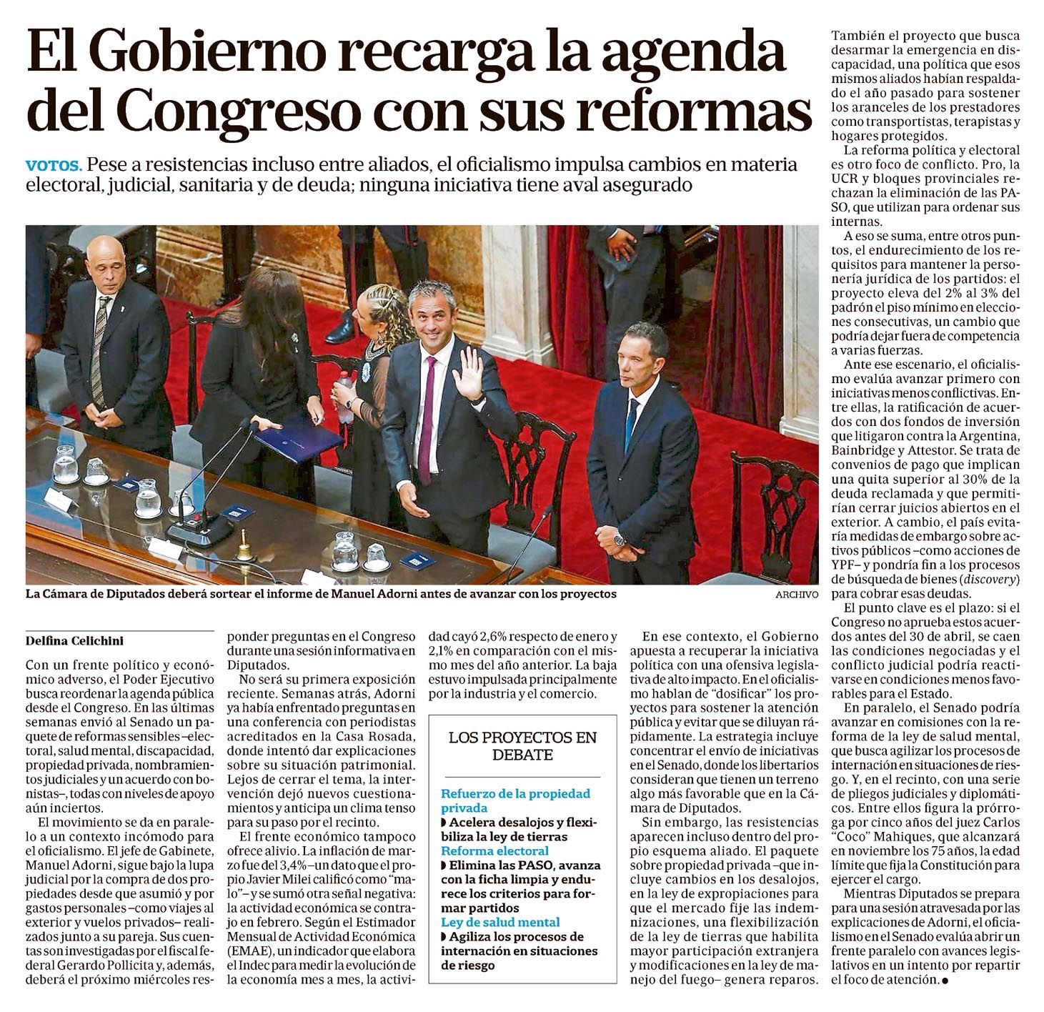 El Gobierno recarga la agenda del Congreso con sus reformas Delfina Celichini VOTOS. Pese a resistencias incluso entre aliados, el oficialismo impulsa cambios en materia electoral, judicial, sanitaria y de deuda; ninguna iniciativa tiene aval asegurado. Delfina Celichini Con un frente político y económico adverso, el Poder Ejecutivo busca reordenar la agenda pública desde el Congreso. En las últimas semanas envió al Senado un paquete de reformas sensibles –electoral, salud mental, discapacidad, propiedad privada, nombramientos judiciales y un acuerdo con bonistas–, todas con niveles de apoyo aún inciertos. El movimiento se da en paralelo a un contexto incómodo para el oficialismo. El jefe de Gabinete, Manuel Adorni, sigue bajo la lupa judicial por la compra de dos propiedades desde que asumió y por gastos personales –como viajes al exterior y vuelos privados– realizados junto a su pareja. Sus cuentas son investigadas por el fiscal federal Gerardo Pollicita y, además, deberá el próximo miércoles responder preguntas en el Congreso durante una sesión informativa en Diputados. No será su primera exposición reciente. Semanas atrás, Adorni ya había enfrentado preguntas en una conferencia con periodistas acreditados en la Casa Rosada, donde intentó dar explicaciones sobre su situación patrimonial. Lejos de cerrar el tema, la intervención dejó nuevos cuestionamientos y anticipa un clima tenso para su paso por el recinto. El frente económico tampoco ofrece alivio. La inflación de marzo fue del 3,4% –un dato que el propio Javier Milei calificó como "malo"– y se sumó otra señal negativa: la actividad económica se contrajo en febrero. Según el Estimador Mensual de Actividad Económica (EMAE), un indicador que elabora el Indec para medir la evolución de la economía mes a mes, la actividad cayó 2,6% respecto de enero y 2,1% en comparación con el mismo mes del año anterior. La baja estuvo impulsada principalmente por la industria y el comercio. LOS PROYECTOS EN DEBATE Refuerzo de la propiedad privada D Acelera desalojos y flexibiliza la ley de tierras Reforma electoral D Elimina las PASO, avanza con la ficha limpia y endurece los criterios para formar partidos Ley de salud mental D Agiliza los procesos de internación en situaciones de riesgo ARCHIVO En ese contexto, el Gobierno apuesta a recuperar la iniciativa política con una ofensiva legislativa de alto impacto. En el oficialismo hablan de "dosificar" los proyectos para sostener la atención pública y evitar que se diluyan rápidamente. La estrategia incluye concentrar el envío de iniciativas en el Senado, donde los libertarios consideran que tienen un terreno algo más favorable que en la Cámara de Diputados. Sin embargo, las resistencias parecen incluso dentro del propio esquema aliado. El paquete sobre propiedad privada –que incluye cambios en los desalojos, en la ley de expropiaciones para que el mercado fije las indemnizaciones, una flexibilización de la ley de tierras que habilita mayor participación extranjera y modificaciones en la ley de manejo del fuego– genera reparos. También el proyecto que busca desarmar la emergencia en discapacidad, una política que esos mismos aliados habían respaldado el año pasado para sostener los aranceles de los prestadores como transportistas, terapistas y hogares protegidos. La reforma política y electoral es otro foco de conflicto. Pro, la UCR y bloques provinciales rechazan la eliminación de las PASO, que utilizan para ordenar sus internas. A eso se suma, entre otros puntos, el endurecimiento de los requisitos para mantener la personería jurídica de los partidos: el proyecto eleva del 2% al 3% del padrón el piso mínimo en elecciones consecutivas, un cambio que podría dejar fuera de competencia a varias fuerzas. Ante ese escenario, el oficialismo evalúa avanzar primero con iniciativas menos conflictivas. Entre ellas, la ratificación de acuerdos con dos fondos de inversión que litigaron contra la Argentina, Bainbridge y Attestor. Se trata de convenios de pago que implican una quita superior al 30% de la deuda reclamada y que permitirían cerrar juicios abiertos en el exterior. A cambio, el país evitaría medidas de embargo sobre activos públicos –como acciones de YPF– y pondría fin a los procesos de búsqueda de bienes (discovery) para cobrar esas deudas. El punto clave es el plazo: si el Congreso no aprueba estos acuerdos antes del 30 de abril, se caen las condiciones negociadas y el conflicto judicial podría reactivarse en condiciones menos favorables para el Estado. En paralelo, el Senado podría avanzar en comisiones con la reforma de la ley de salud mental, que busca agilizar los procesos de internación en situaciones de riesgo. Y, en el recinto, con una serie de pliegos judiciales y diplomáticos. Entre ellos figura la prórroga por cinco años del juez Carlos "Coco" Mahiques, que alcanzará en noviembre los 75 años, la edad límite que fija la Constitución para ejercer el cargo. Mientras Diputados se prepara para una sesión atravesada por la explicación de Adorni, el oficialismo en el Senado evalúa abrir un frente paralelo con avances legislativos en un intento por repartir el foco de atención. Menciones: CPOL1 64pe