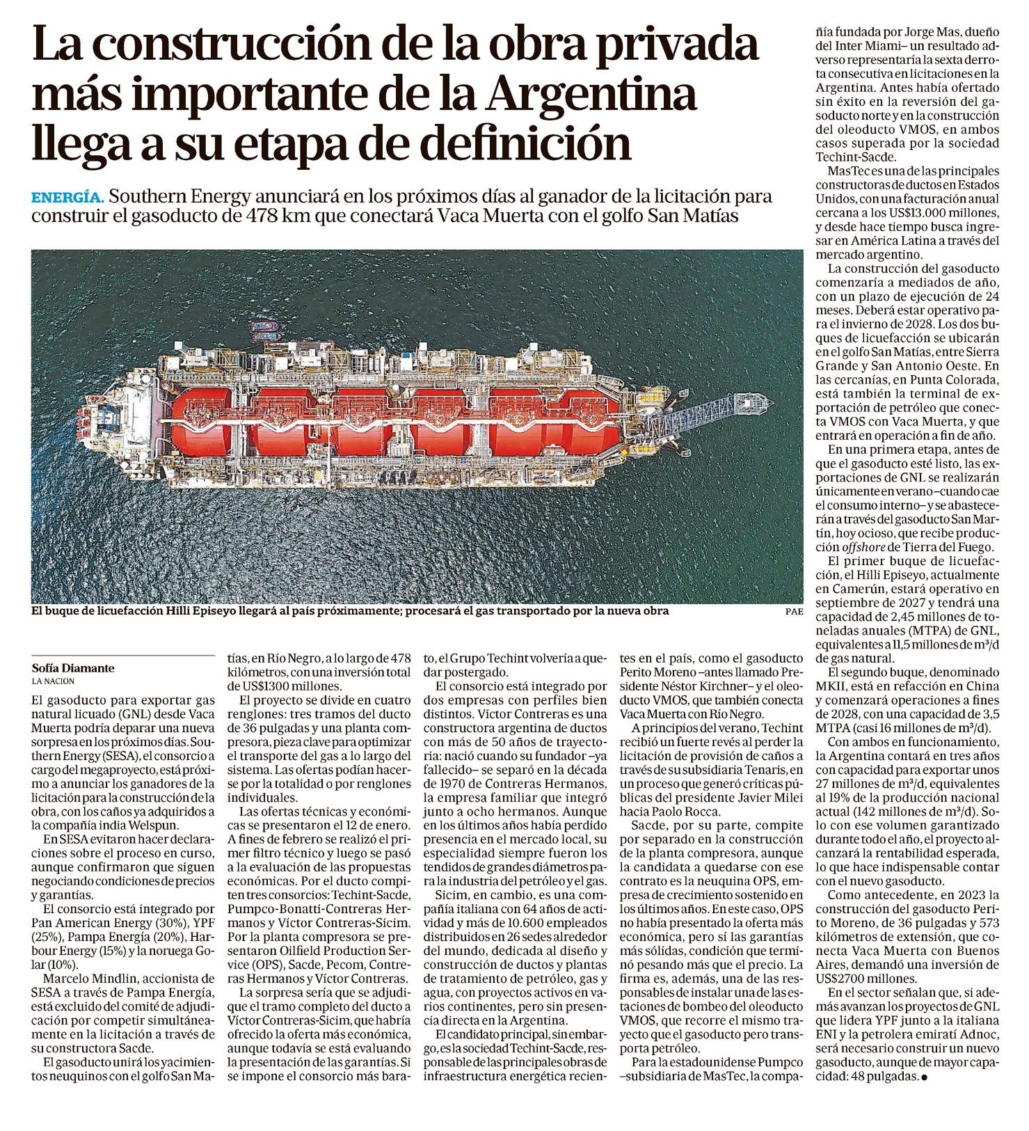 La construcción de la obra privada más importante de la Argentina llega a su etapa de definición Sofía Diamante Por Sofía Diamante | LA NACION ENERGÍA. Southern Energy anunciará en los próximos días al ganador de la licitación para construir el gasoducto de 478 km que conectará Vaca Muerta con el golfo San Matías. El gasoducto para exportar gas natural licuado (GNL) desde Vaca Muerta podría deparar una nueva sorpresa en los próximos días. Southern Energy (SESA), el consorcio a cargo del megaproyecto, está próximo a anunciar los ganadores de la licitación para la construcción de la obra, con los caños ya adquiridos a la compañía india Welspun. En SESA evitaron hacer declaraciones sobre el proceso en curso, aunque confirmaron que siguen negociando condiciones de precio y garantías. El consorcio está integrado por Pan American Energy (30%), YPF (25%), Pampa Energía (20%), Harbour Energy (15%) y la noruega Golar (10%). Marcelo Mindlin, accionista de SESA a través de Pampa Energía, está excluido del comité de adjudicación por competir simultáneamente en la licitación a través de su constructora Sacde. El gasoducto unirá los yacimientos neuquinos con el golfo San Matías, en Río Negro, a lo largo de 478 kilómetros, con una inversión total de US$ 1300 millones. El proyecto se divide en cuatro renglones: tres tramos del ducto de 36 pulgadas y una planta compresora, pieza clave para optimizar el transporte del gas a lo largo del sistema. Las ofertas podían hacerse por la totalidad o por renglones individuales. Las ofertas técnicas y económicas se presentaron el 12 de enero. A fines de febrero se realizó el primer filtro técnico y luego se pasó a la evaluación de las propuestas económicas. Por el ducto compiten tres consorcios: Techint-Sacde; Pumpco-Bonatti-Contreras Hermanos; y Víctor Contreras-Sicim. Por la planta compresora se presentaron Oilfield Production Service (OPS), Sacde, Pecom, Contreras Hermanos y Víctor Contreras. La sorpresa sería que se adjudique el tramo completo del ducto a Víctor Contreras-Sicim, que habría ofrecido la propuesta más económica, aunque todavía se está evaluando la presentación de las garantías. Si se impone el consorcio más barato, el Grupo Techint volvería a quedar postergado. El consorcio está integrado por dos empresas con perfiles bien distintos. Víctor Contreras es una constructora argentina de ductos con más de 50 años de trayectoria: nació cuando su fundador -ya fallecido- se separó en la década de 1970 de Contreras Hermanos, la empresa familiar que integró junto a ocho hermanos. Aunque en los últimos años había perdido presencia en el mercado local, su especialidad siempre fueron los tendidos de grandes diámetros para la industria del petróleo y el gas. Sicim, en cambio, es una compañía italiana con 64 años de actividad y más de 10.600 empleados distribuidos en 26 sedes alrededor del mundo, dedicada al diseño y construcción de ductos y plantas de tratamiento de petróleo, gas y agua, con proyectos activos en varios continentes, pero sin presencia directa en la Argentina. El candidato principal, sin embargo, es la sociedad Techint-Sacde, responsable de las principales obras de infraestructura energética recientes en el país, como el gasoducto Presidente Néstor Kirchner y el oleoducto Vaca Muerta Sur (VMS), que también conecta Vaca Muerta con Río Negro. A principios del verano, Techint recibió un fuerte revés al perder la licitación de provisión de caños a través de su subsidiaria Tenaris, en un proceso que generó críticas públicas del presidente Javier Milei hacia Paolo Rocca. Sacde, por su parte, compitió por separado en la construcción de la planta compresora, aunque la candidata a quedarse con ese contrato es la neuquina OPS, empresa de crecimiento sostenido en los últimos años. En este caso, OPS no había presentado la oferta más económica, pero sí las garantías más sólidas, condición que terminó pesando más que el precio. La firma es, además, una de las responsables de instalar una de las estaciones de bombeo del oleoducto VMS, que recorre el mismo trayecto que el gasoducto pero transporta petróleo. Para la estadounidense Pumpco -subsidiaria de MasTec, la compañía fundada por Jorge Mas, dueño del Inter Miami-, un resultado adverso representaría la sexta derrota consecutiva en licitaciones en la Argentina. Antes había ofertado sin éxito en la reversión del Gasoducto Norte y en la construcción del oleoducto VMS, en ambos casos superada por la sociedad Techint-Sacde. MasTec es una de las principales constructoras de ductos en Estados Unidos, con una facturación anual cercana a los US$ 13.000 millones, y desde hace tiempo busca ingresar en América Latina a través del mercado argentino. La construcción del gasoducto comenzaría a mediados de año, con un plazo de ejecución de 24 meses. Deberá estar operativo para el invierno de 2028. Los dos buques de licuefacción se ubicarán en el golfo San Matías, entre Sierra Grande y San Antonio Oeste. En las cercanías, en Punta Colorada, está también la terminal de exportación de petróleo que conecta VMS con Vaca Muerta, y que entrará en operación a fin de año. En una primera etapa, antes de que el gasoducto esté listo, las exportaciones de GNL se realizarán únicamente en verano -cuando cae el consumo interno- y se abastecerán a través del gasoducto San Martín, hoy ocioso, que recibe producción offshore de Tierra del Fuego. Foto: El buque de licuefacción Hilli Episeyo llegará al país; procesará el gas transportado por el nuevo sistema. El primer buque de licuefacción, el Hilli Episeyo, actualmente en Camerún, estará operativo en septiembre de 2027 y tendrá una capacidad de 2,45 millones de toneladas anuales (MTPA) de GNL, equivalentes a 11,5 millones de m3/d de gas natural. El segundo buque, denominado MKII, está en refacción en China y comenzará operaciones a fines de 202