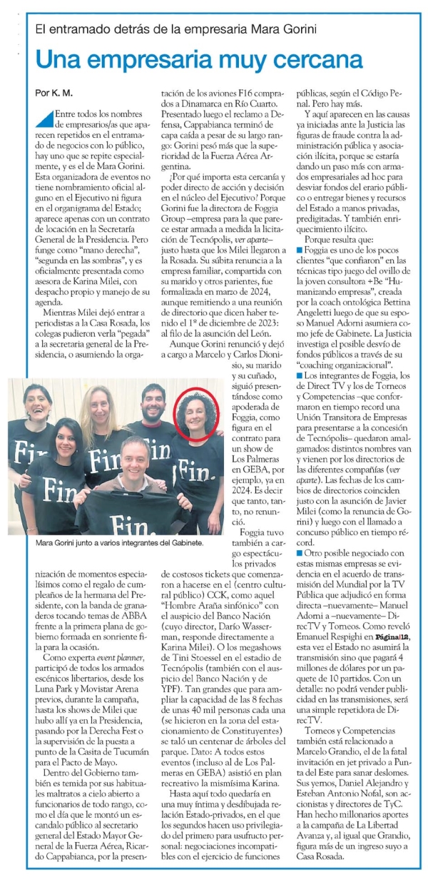 El entramado detrás de la empresaria Mara Gorini Una empresaria muy cercana K. M. Por K. M. Entre todos los nombres de empresarios/as que aparecen repetidos en el entramado de negocios con lo público, hay uno que se repite especialmente, y es el de Mara Gorini. Esta organizadora de eventos no tiene nombramiento oficial alguno en el Ejecutivo ni figura en el organigrama del Estado; aparece apenas con un contrato de locación en la Secretaría General de la Presidencia. Pero funge como "mano derecha", "segunda en las sombras", y es oficialmente presentada como asesora de Karina Milei, con despacho propio y manejo de su agenda. Mientras Milei dejó entrar a periodistas a la Casa Rosada, los colegas pudieron verla "pegada" a la secretaria general de la Presidencia, o asumiendo la organización de momentos especialísimos como el regalo de cumpleaños de la hermana del Presidente, con la banda de granaderos tocando temas de ABBA frente a la primera plana de gobierno formada en sonriente fila para la ocasión. Como experta event planner, participó de todos los armados escénicos libertarios, desde los Luna Park y Movistar Arena previos, durante la campaña, hasta los shows de Milei que hubo allí ya en la Presidencia, pasando por la Derecha Fest a la supervisión de la puesta a punto de la Casita de Tucumán para el Pacto de Mayo. Dentro del Gobierno también es temida por sus habituales maltratos a cielo abierto a funcionarios de todo rango, como el día que le montó un escándalo público al secretario general del Estado Mayor General de la Fuerza Aérea, Ricardo Cappabianca, por la presentación de los aviones F16 comprados a Dinamarca en Río Cuarto. Presentado luego el reclamo a Defensa, Cappabianca terminó de caer a pesar de su largo rango: Gorini pesó más que la superioridad de la Fuerza Aérea Argentina. ¿Por qué importa esta cercanía y poder directo de acción y decisión en el núcleo del Ejecutivo? Porque Gorini fue la directora de Foggia Group -empresa para la que parece estar armada a medida la licitación de Tecnópolis, ver aparte- justo hasta que los Milei llegaron a La Rosada. Su súbita renuncia a la empresa familiar, compartida con su marido y otros parientes, fue formalizada en marzo de 2024, aunque remitiendo a una reunión de directorio que dicen haber tenido el 1? de diciembre de 2023: al filo de la asunción del León. Aunque Gorini renunció y dejó a cargo a Marcelo y Carlos Dionisio, su marido y su cuñado, siguió presentándose como apoderada de Foggia, como figura en el contrato para un show de Los Palmeras en GEBA, por ejemplo, ya en 2024. Es decir que tanto, tanto, no renunció. Foggia tuvo también a cargo espectáculos privados de costosos tickets que comenzaron a hacerse en el (centro cultural público) CCK, como aquel "Hombre Araña sinfónico" con el auspicio del Banco Nación (cuyo director, Darío Wasserman, responde directamente a Karina Milei). O los megashows de Tini Stoessel en el estadio de Tecnópolis (también con el auspicio del Banco Nación y de YPF). Tan grandes que para ampliar la capacidad de las 8 fechas de unas 40 mil personas cada una (se hicieron en la zona del estacionamiento de Constituyentes) se taló un centenar de árboles del parque. Dato: A todos estos eventos (incluso al de Los Palmeras en GEBA) asistió en plan recreativo la mismísima Karina. Hasta aquí todo quedaría en una muy íntima y desdibujada relación Estado-privados, en el que los segundos hacen uso privilegiado del primero para usufructo personal: negociaciones incompatibles con el ejercicio de funciones públicas, según el Código Penal. Pero hay más. Y aquí aparecen en las causas ya iniciadas ante la Justicia las figuras de fraude contra la administración pública y asociación ilícita, porque se estaría dando un paso más con armados empresariales ad hoc para desviar fondos del erario público o entregar bienes y recursos del Estado a manos privadas, predigitadas. Y también enriquecimiento ilícito. Porque resulta que: Foggia es uno de los pocos clientes "que confiaron" en las técnicas tipo juego del ovillo de la joven consultora +Be "Humanizando empresas", creada por la coach ontológica Bettina Angeletti luego de que su esposo Manuel Adorni asumiera como jefe de Gabinete. La Justicia investiga el posible desvío de fondos públicos a través de su "coaching organizacional". Los integrantes de Foggia, los de Direct TV y los de Torneos y Competencias -que conformaron en tiempo record una Unión Transitora de Empresas para presentarse a la concesión de Tecnópolis- quedaron amalgamados: distintos nombres van y vienen por los directorios de las diferentes compañías (ver aparte). Las fechas de los cambios de directorios coinciden justo con la asunción de Javier Milei (como la renuncia de Gorini) y luego con el llamado a concurso público en tiempo récord. Otro posible negociado con estas mismas empresas se evidencia en el acuerdo de transmisión del Mundial por la TV Pública que adjudicó en forma directa -nuevamente- Manuel Adorni a -nuevamente- DirecTV y Torneos. Como reveló Emanuel Respighi en Página12, esta vez el Estado no asumirá la transmisión sino que pagará 4 millones de dólares por un paquete de 10 partidos. Con un detalle: no podrá vender publicidad en las transmisiones, será una simple repetidora de DirecTV. Torneos y Competencias también está relacionado a Marcelo Grandio, el de la fatídica invitación en jet privado a Punta del Este para sanar desglomes. Sus yernos, Daniel Alejandro y Esteban Antonio Nofal, son accionistas y directores de TyC. Han hecho millonarios aportes a la campaña de La Libertad Avanza y, al igual que Grandio, figura más de un ingreso suyo a Casa Rosada. Menciones: cpol2 cnot