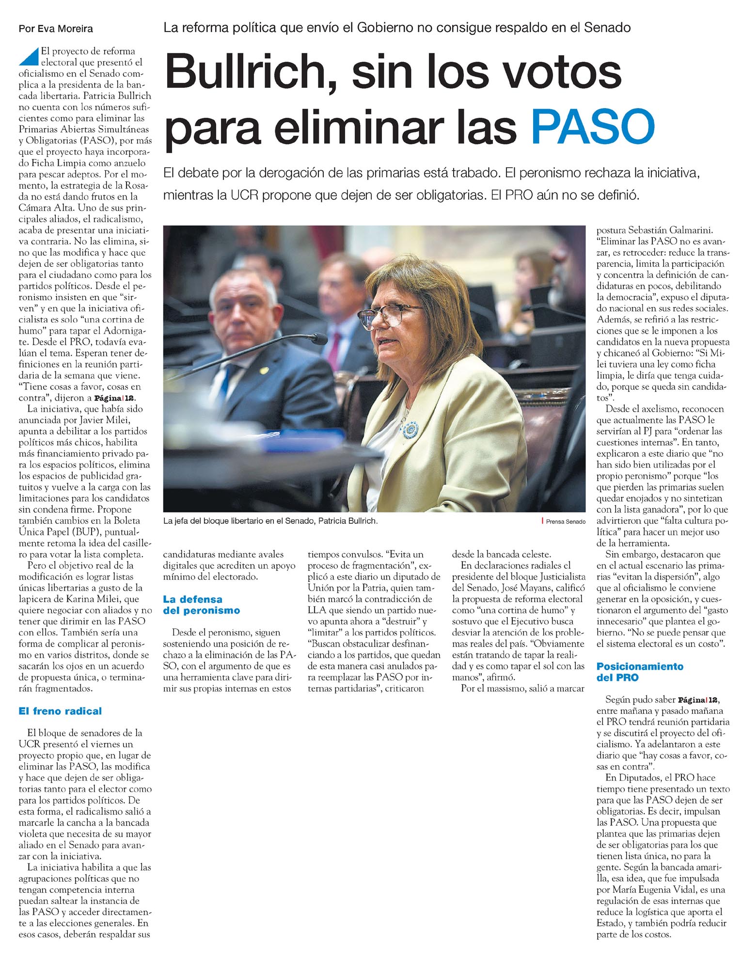 Bullrich, sin los votos para eliminar las PASO Eva Moreira La reforma política que envió el Gobierno no consigue respaldo en el Senado. El debate por la derogación de las primarias está trabado. El peronismo rechaza la iniciativa, mientras la UCR propone que dejen de ser obligatorias. El PRO aún no se definió. Foto: La jefa del bloque libertario en el Senado, Patricia Bullrich. (Prensa Senado) El proyecto de reforma electoral que presentó el oficialismo en el Senado complica a la presidenta de la bancada libertaria. Patricia Bullrich no cuenta con los números suficientes como para eliminar las Primarias Abiertas, Simultáneas y Obligatorias (PASO), por más que el proyecto haya incorporado Ficha Limpia como anzuelo para pescar adeptos. Por el momento, la estrategia de la Rosada no está dando frutos en la Cámara Alta. Uno de sus principales aliados, el radicalismo, acaba de presentar una iniciativa contraria: no las elimina, sino que las modifica y hace que dejen de ser obligatorias tanto para el ciudadano como para los partidos políticos. Desde el peronismo insisten en que 'sirven' y en que la iniciativa oficialista es solo 'una cortina de humo' para tapar el Adornigate. Desde el PRO, todavía evalúan el tema y esperan tener definiciones en la reunión partidaria de la semana que viene. 'Tiene cosas a favor, cosas en contra', dijeron a Página/12. La iniciativa, que había sido anunciada por Javier Milei, apunta a debilitar a los partidos políticos más chicos, habilita el financiamiento privado para los espacios políticos, elimina los espacios de publicidad gratuitos y vuelve a la carga con las limitaciones para los candidatos con condena firme. Propone también cambios en la Boleta Única de Papel (BUP), puntualmente retoma la idea del casillero para votar la lista completa. Pero el objetivo real de la modificación es lograr listas únicas libertarias a gusto de la lapicera de Karina Milei, que quiere negociar con aliados y no tener que dirimir en las PASO con ellos. También sería una forma de complicar al peronismo en varios distritos, donde se sacarán los ojos en un acuerdo de propuesta única o terminarán fragmentados. El freno radical El bloque de senadores de la UCR presentó el viernes un proyecto propio que, en lugar de eliminar las PASO, las modifica y hace que dejen de ser obligatorias tanto para el elector como para los partidos políticos. De esta forma, el radicalismo salió a marcarle la cancha a la bancada violeta, que necesita de su mayor aliado en el Senado para avanzar con la iniciativa. La iniciativa habilita a que las agrupaciones políticas que no tengan competencia interna puedan saltear la instancia de las PASO y acceder directamente a las elecciones generales. En esos casos, deberán respaldar sus candidaturas mediante avales digitales que acrediten un apoyo mínimo del electorado. La defensa del peronismo Desde el peronismo, siguen sosteniendo una posición de rechazo a la eliminación de las PASO, con el argumento de que es una herramienta clave para dirimir sus propias internas en estos tiempos convulsos. 'Evita un proceso de fragmentación', explicó a este diario un diputado de Unión por la Patria, quien también marcó la contradicción de LLA que, siendo un partido nuevo, apunta ahora a 'destruir' y 'limitar' a los partidos políticos. 'Buscan obstaculizar desfinanciando a los partidos, que quedan de esta manera casi anulados para reemplazar las PASO por internas partidarias', criticaron desde la bancada celeste. En declaraciones radiales, el presidente del bloque Justicialista en el Senado, José Mayans, calificó la propuesta de reforma electoral como 'una cortina de humo' y sostuvo que el Ejecutivo busca desviar la atención de los problemas reales del país. 'Obviamente están tratando de tapar la realidad y es como tapar el sol con las manos', afirmó. Por el massismo, salió a marcar postura Sebastián Galmarini. 'Eliminar las PASO no es avanzar, es retroceder: reduce la transparencia, limita la participación y concentra la definición de candidaturas en pocos, debilitando la democracia', expuso el diputado nacional en sus redes sociales. Además, se refirió a las restricciones que se le imponen a los candidatos en la nueva propuesta y chicaneó al Gobierno: 'Si Milei tuviera una ley como Ficha Limpia, le diría que tenga cuidado, porque se queda sin candidatos'. Desde el axelismo, reconocen que actualmente las PASO le servirían al PJ para 'ordenar las cuestiones internas'. En tanto, explicaron a este diario que 'no han sido bien utilizadas por el propio peronismo' porque 'los que pierden las primarias suelen quedar enojados y no sintetizan con la lista ganadora', por lo que advirtieron que 'falta cultura política' para hacer un mejor uso de la herramienta. Sin embargo, destacaron que en el actual escenario las primarias 'evitan la dispersión', algo que al oficialismo le conviene generar en la oposición, y cuestionaron el argumento del 'gasto innecesario' que plantea el Gobierno. 'No se puede pensar que el sistema electoral es un costo'. Posicionamiento del PRO Según pudo saber Página/12, entre mañana y pasado mañana el PRO tendrá reunión partidaria y se discutirá el proyecto del oficialismo. Ya adelantaron a este diario que 'hay cosas a favor, cosas en contra'. En Diputados, el PRO hace tiempo tiene presentado un texto para que las PASO dejen de ser obligatorias. Es decir, impulsa las PASO: una propuesta que plantea que las primarias dejen de ser obligatorias para los que tienen lista única, no para el electorado. Según la bancada amarilla, esa idea, que fue impulsada por María Eugenia Vidal, es una regulación de esas internas que reduce la logística que aporta el Estado y también podría reducir parte de los costos. Menciones: cpol2