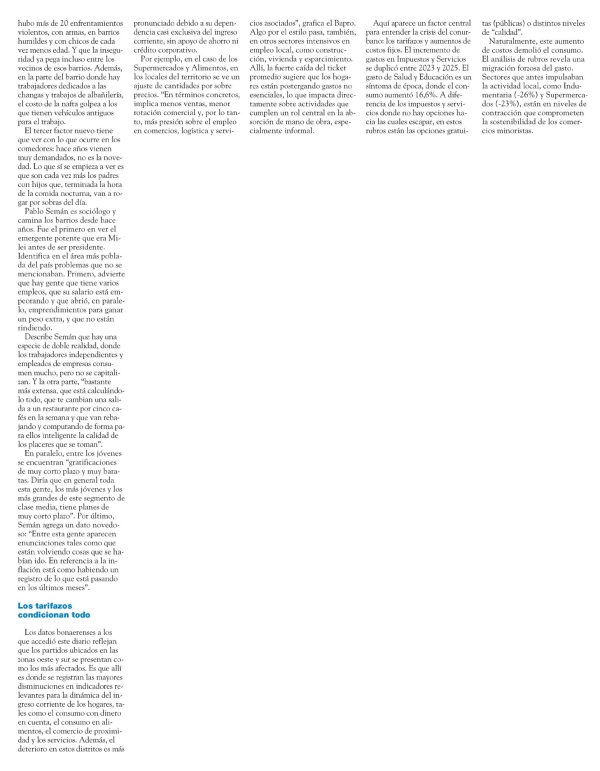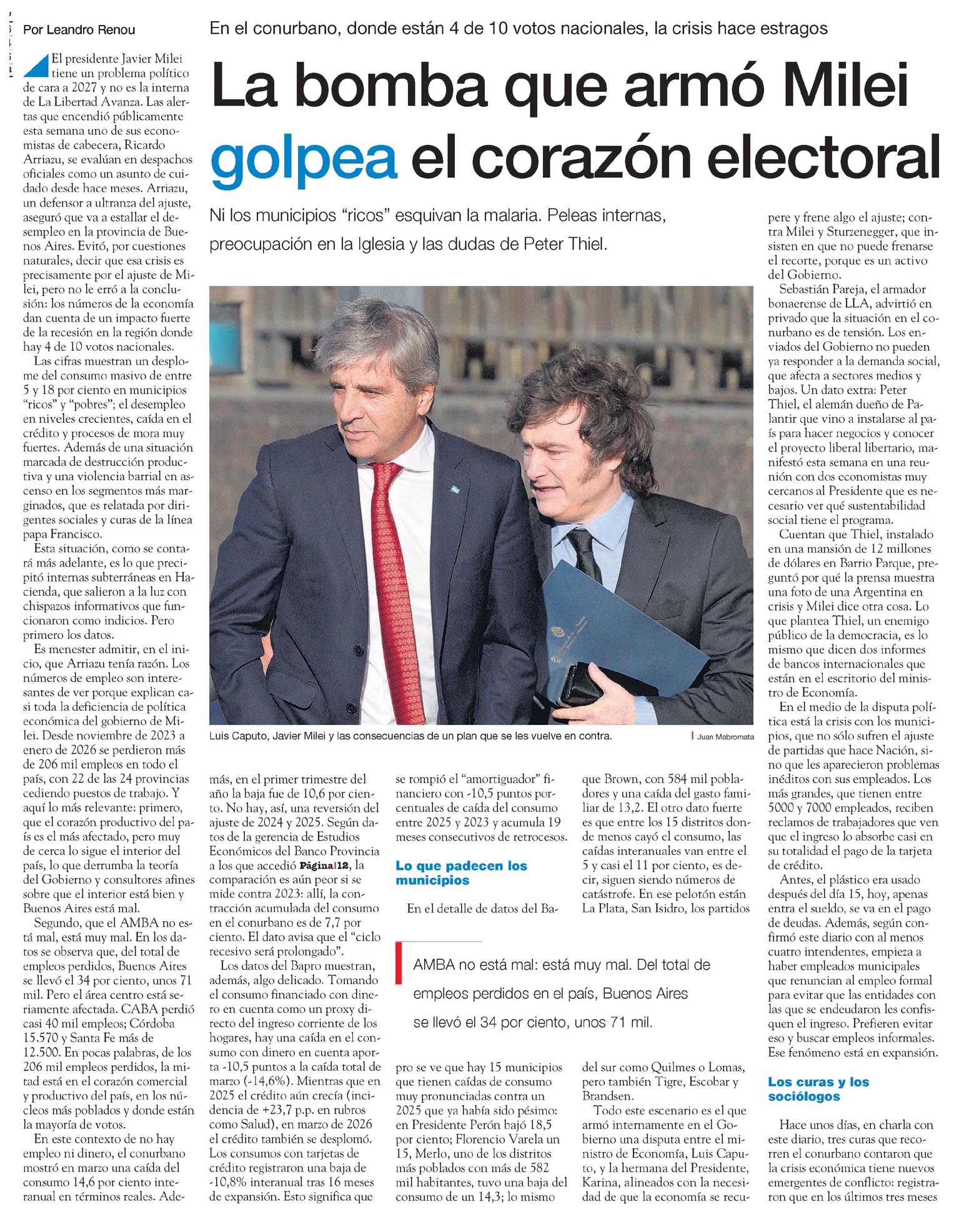 La bomba que armó Milei golpea el corazón electoral Leandro Renou Por Leandro Renou En el conurbano, donde están 4 de 10 votos nacionales, la crisis hace estragos La bomba que armó Milei golpea el corazón electoral Ni los municipios "ricos" esquivan la malaria. Peleas internas, preocupación en la Iglesia y las dudas de Peter Thiel. El presidente Javier Milei tiene un problema político de cara a 2027 y no es la interna de La Libertad Avanza. Las alertas que encendió públicamente esta semana uno de sus economistas de cabecera, Ricardo Arriazu, se evalúan en despachos oficiales como un asunto de cuidado desde hace meses. Arriazu, un defensor a ultranza del ajuste, aseguró que va a estallar el desempleo en la provincia de Buenos Aires. Evitó, por cuestiones naturales, decir que esa crisis es precisamente por el ajuste de Milei, pero no le erró a la conclusión: los números de la economía dan cuenta de un impacto fuerte de la recesión en la región donde hay 4 de 10 votos nacionales. Las cifras muestran un desplome del consumo masivo de entre 5 y 18 por ciento en municipios "ricos" y "pobres"; el desempleo en niveles crecientes, caída en el crédito y procesos de mora muy fuertes. Además de una situación marcada de destrucción productiva y una violencia barrial en ascenso en los segmentos más marginados, que es relatada por dirigentes sociales y curas de la línea papa Francisco. Esta situación, como se cuenta adelante, es lo que precipitó internas subterráneas en Hacienda, que salieron a la luz con chispazos informativos que funcionaron como indicios. Pero primero los datos. Es menester admitir, en el inicio, que Arriazu tenía razón. Los números de empleo son interesantes de ver porque explican casi toda la deficiencia de política económica del gobierno de Milei. Desde noviembre de 2023 a enero de 2026 se perdieron más de 206 mil empleos en todo el país, con 22 de las 24 provincias perdiendo puestos de trabajo. Y aquí lo más relevante: primero, que el corazón productivo del país es el más afectado, pero muy de cerca lo sigue el interior del país, lo que derrumba la teoría del Gobierno y consultores afines sobre que el interior está bien y Buenos Aires está mal. Segundo, que el AMBA no está mal, está muy mal. En los datos se observa que, del total de empleos perdidos, Buenos Aires se llevó el 34 por ciento, unos 71 mil. Pero el área centro está seriamente afectada. CABA perdió casi 40 mil empleos; Córdoba 15.570 y Santa Fe más de 12.500. En pocas palabras, de los 206 mil empleos perdidos, la mitad está en el corazón comercial y productivo del país, en los núcleos más poblados y donde está la mayoría de votos. En este contexto de no hay empleo ni dinero, el conurbano mostró en marzo una caída de consumo 14,6 por ciento interanual en términos reales. Ade- más, en el primer trimestre del año la baja fue de 10,6 por ciento. No hay, así, una reversión del ajuste de 2024 y 2025. Según datos de la gerencia de Estudios Económicos del Banco Provincia a los que accedió Página/12, la comparación es aún peor si se mide contra 2023: allí, la contracción acumulada del consumo en el conurbano es de 7,7 por ciento. El dato avisa que el "ciclo recesivo será prolongado". Los datos del Bapro muestran, además, algo delicado. Tomando el consumo financiado con dinero en cuenta como un proxy directo del ingreso corriente de los hogares, hay una caída en el consumo con dinero en cuenta aporta -10,5 puntos a la caída total de marzo (-14,6%). Mientras que en 2025 el crédito aún crecía (incidencia de +23,7 p.p. en rubros como Salud), en marzo de 2026 el crédito también se desplomó. Los consumos con tarjetas de crédito registraron una baja de -10,8% interanual tras 16 meses de expansión. Esto significa que se rompió el "amortiguador" financiero con -10,5 puntos porcentuales de caída del consumo entre 2025 y 2023 y acumula 19 meses consecutivos de retrocesos. Lo que padecen los municipios En el detalle de datos del Ba- Luis Caputo, Javier Milei y las consecuencias de un plan que se les vuelve en contra. que Brown, con 584 mil pobladores y una caída del gasto familiar de 13,2. El otro dato fuerte es que entre los 15 distritos donde menos cayó el consumo, la caídas interanuales van entre el 5 y casi el 11 por ciento, es decir, siguen siendo números de catástrofe. En ese pelotón están La Plata, San Isidro, los partidos | Juan Mabromata AMBA no está mal: está muy mal. Del total de empleos perdidos en el país, Buenos Aires se llevó el 34 por ciento, unos 71 mil. pro se ve que hay 15 municipios que tienen caídas de consumo muy pronunciadas contra un 2025 que ya había sido pésimo: en Presidente Perón bajó 18,5 por ciento; Florencio Varela un 15, Merlo, uno de los distritos más poblados con más de 582 mil habitantes, tuvo una baja de consumo de un 14,3; lo mismo del sur como Quilmes o Lomas, pero también Tigre, Escobar y Brandsen. Todo este escenario es el que armó internamente en el Gobierno una disputa entre el ministro de Economía, Luis Caputo, y la hermana del Presidente, Karina, alineados con la necesidad de que la economía se recu-pere y frene algo el ajuste; contra Milei y Sturzenegger, que insisten en que no puede frenarse el recorte, porque es un activo del Gobierno. Sebastián Pareja, el armador bonaerense de LLA, advirtió en privado que la situación en el conurbano es de tensión. Los enviados del Gobierno no pueden responder a la demanda social, que afecta a sectores medios y bajos. Un dato extra: Peter Thiel, el alemán dueño de Palantir que vino a instalarse al país para hacer negocios y conoce el proyecto liberal libertario, manifestó esta semana en una reunión con dos economistas muy cercanos al Presidente que es necesario ver qué sustentabilidad social tiene el programa. Cuentan que Thiel, instalado en una mansión de 12 millones de dólares en Barrio Parque, preguntó por qué la prensa muestra una f
